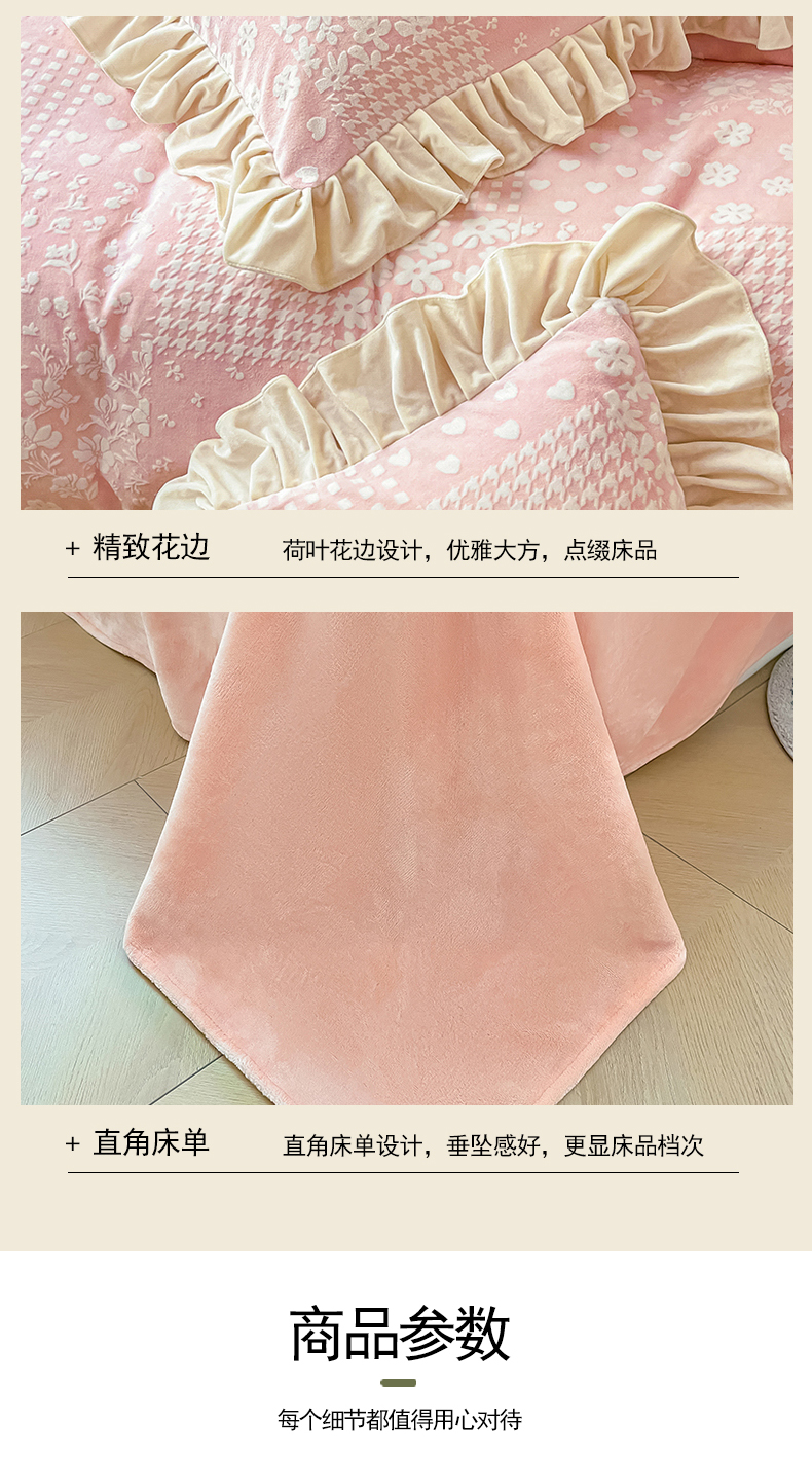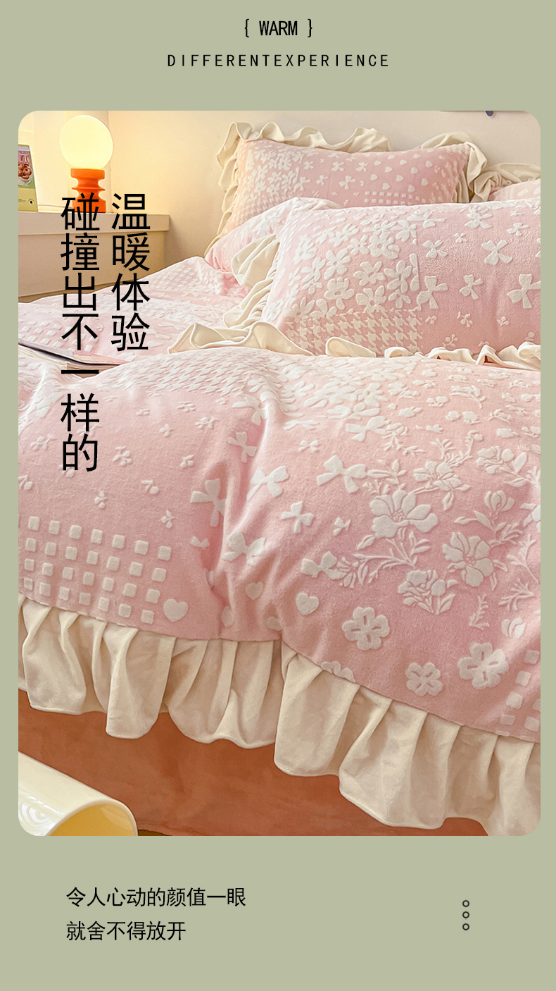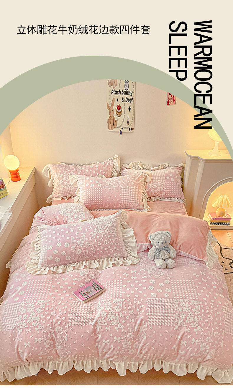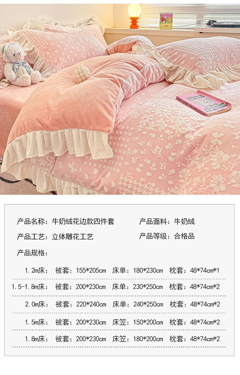 当前位置: 91家纺网 > 商品网购 > 床品套件 > 四件套 > 牛奶绒四件套 > 琪格格纺织2024新款暖绒蓄热全消光雕花绒花边四件套-雕花绒花边 雕花绒花边- 阿芙朵 粉