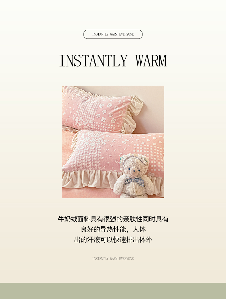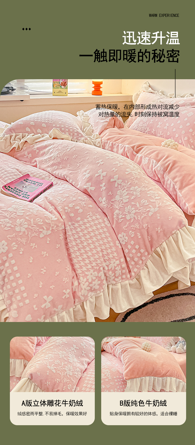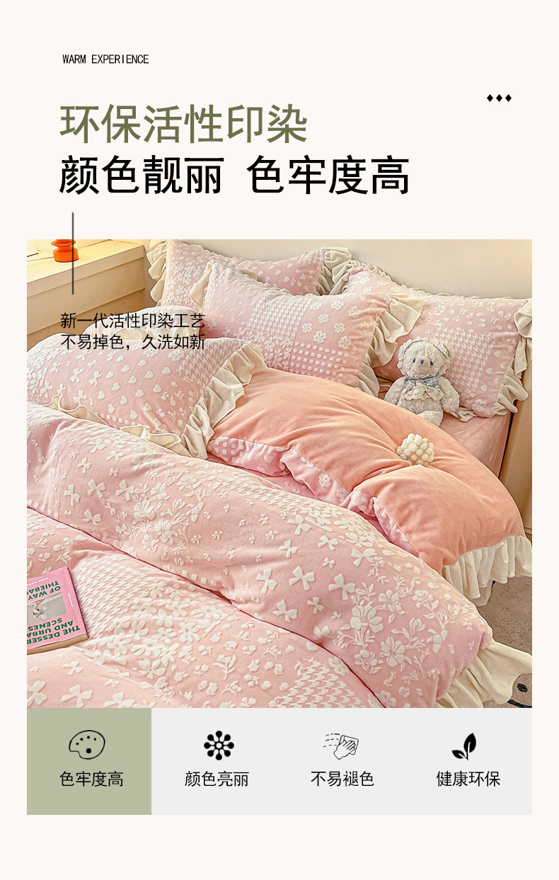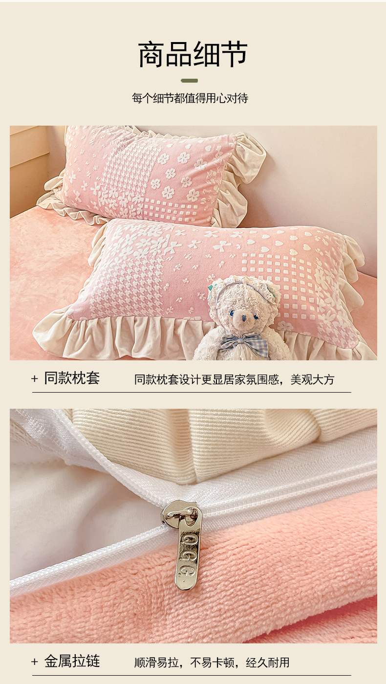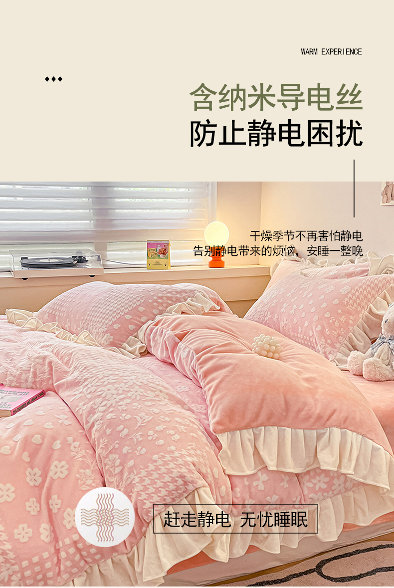 当前位置: 91家纺网 > 商品网购 > 床品套件 > 四件套 > 牛奶绒四件套 > 琪格格纺织2024新款暖绒蓄热全消光雕花绒花边四件套-雕花绒花边 雕花绒花边- 阿芙朵 粉
