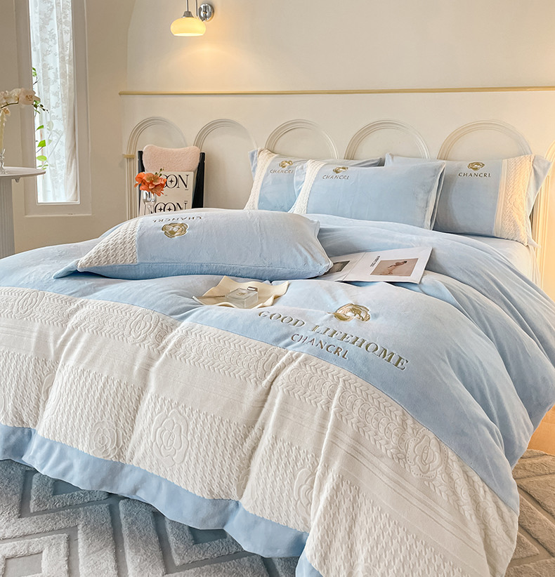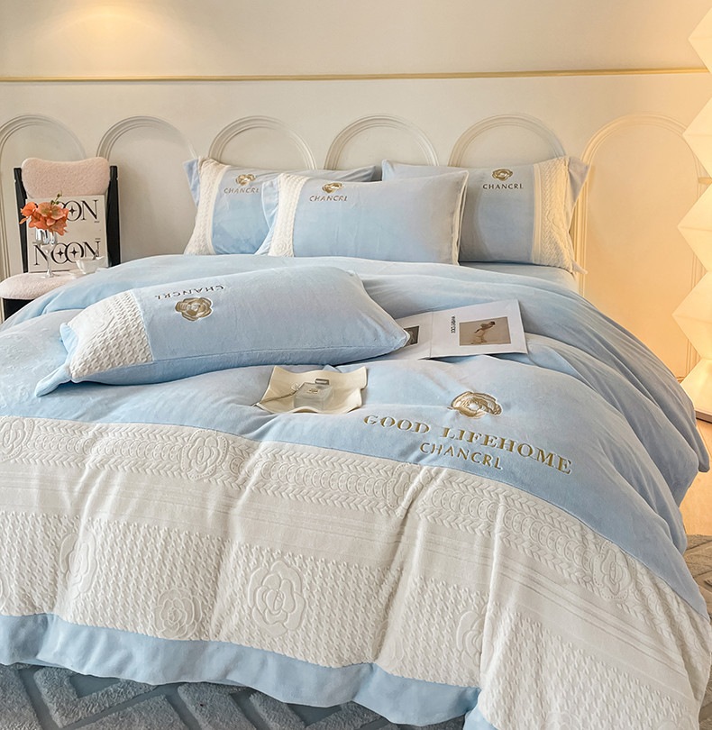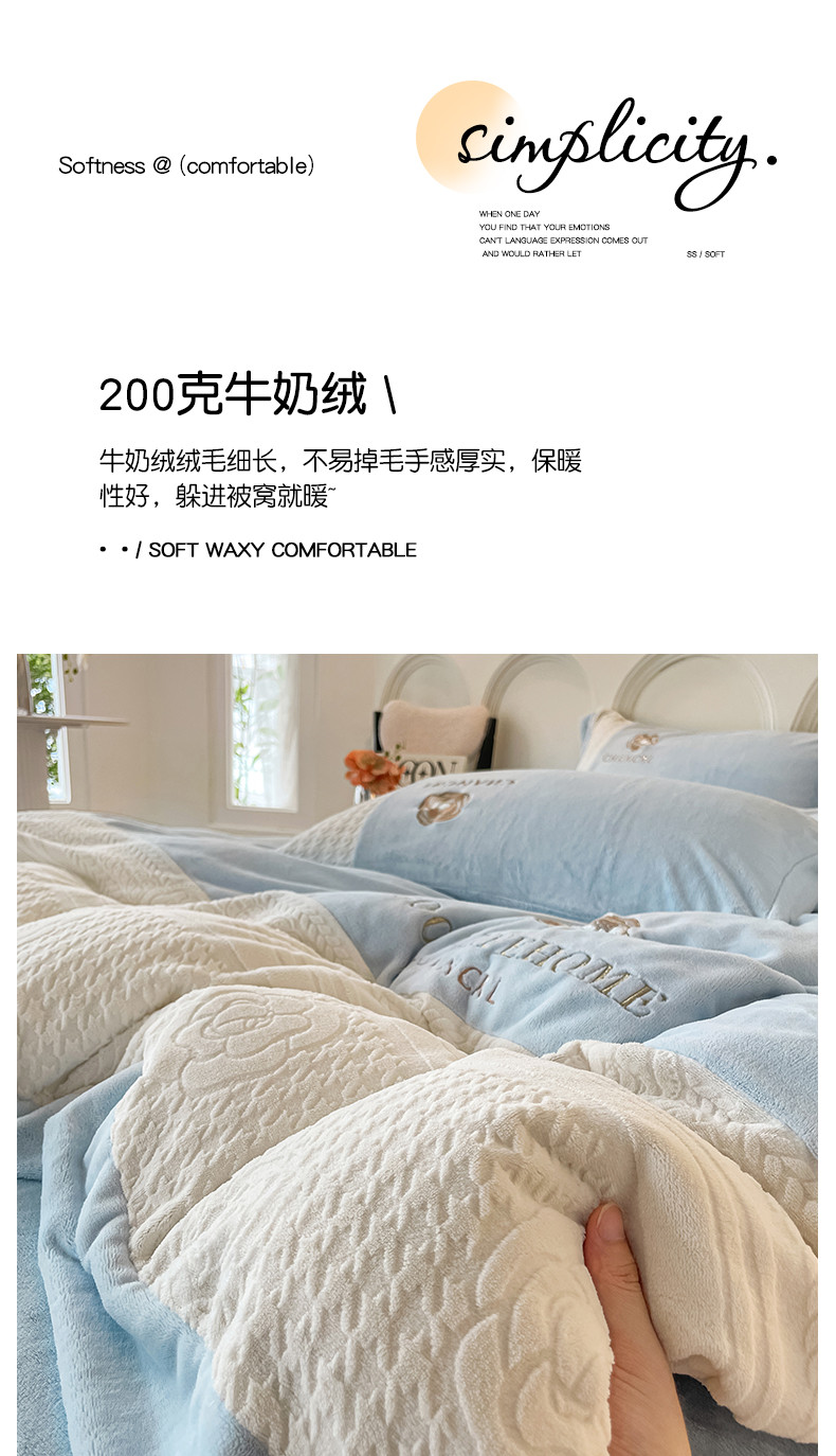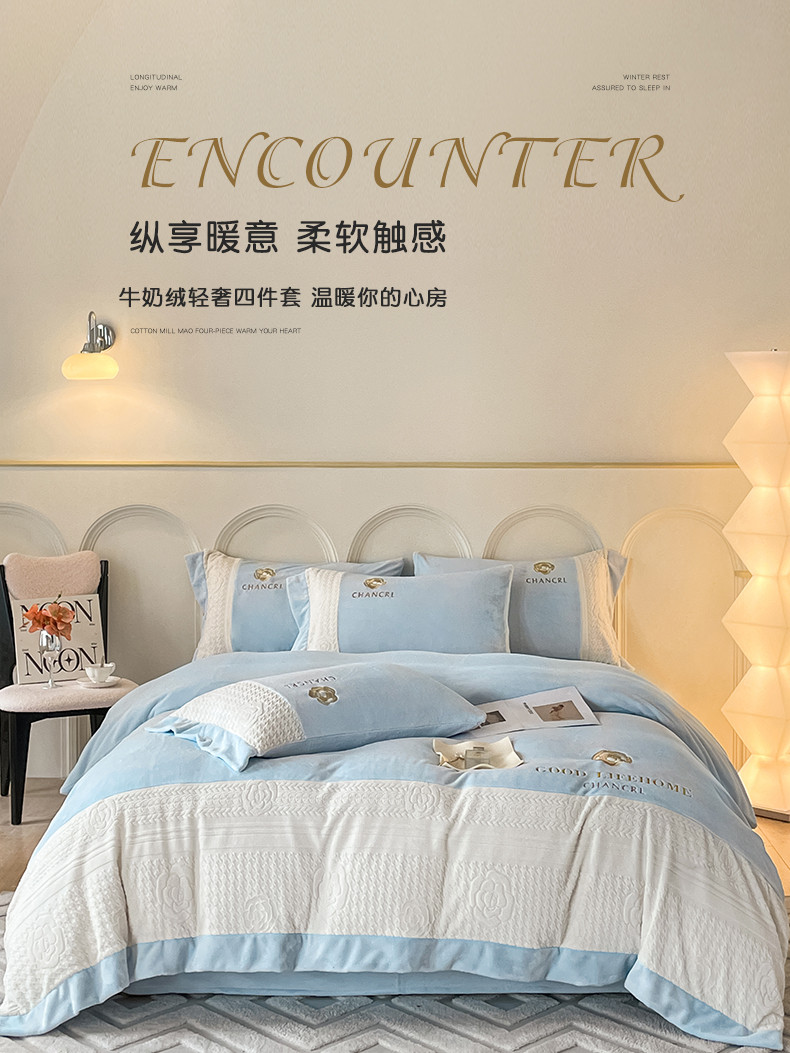 当前位置: 91家纺网 > 商品网购 > 床品套件 > 四件套 > 牛奶绒四件套 > 娜娜 2023新款牛奶绒三拼轻奢风四件套 天空蓝