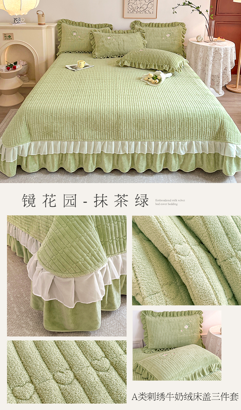 商品名称:宜凡家纺 2023新款高克重牛奶绒绣花夹棉床盖三件套 镜花园-抹茶绿