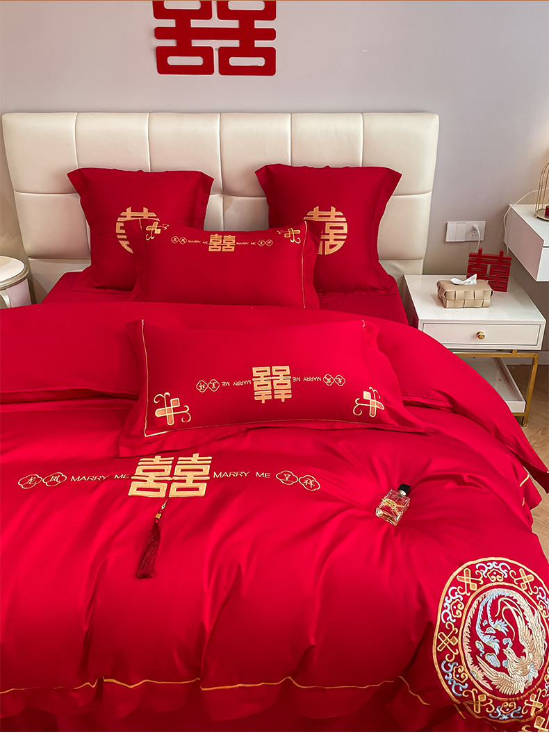 (总)欧乐蒂 2025新款亲肤棉刺绣花边婚庆四件套-倾城,倾城-金,倾城-喜红