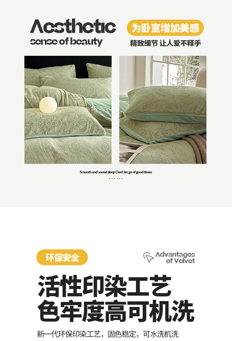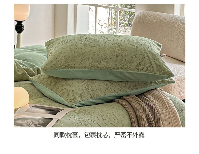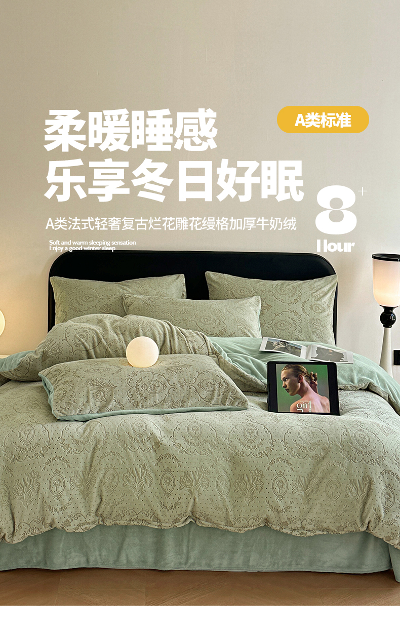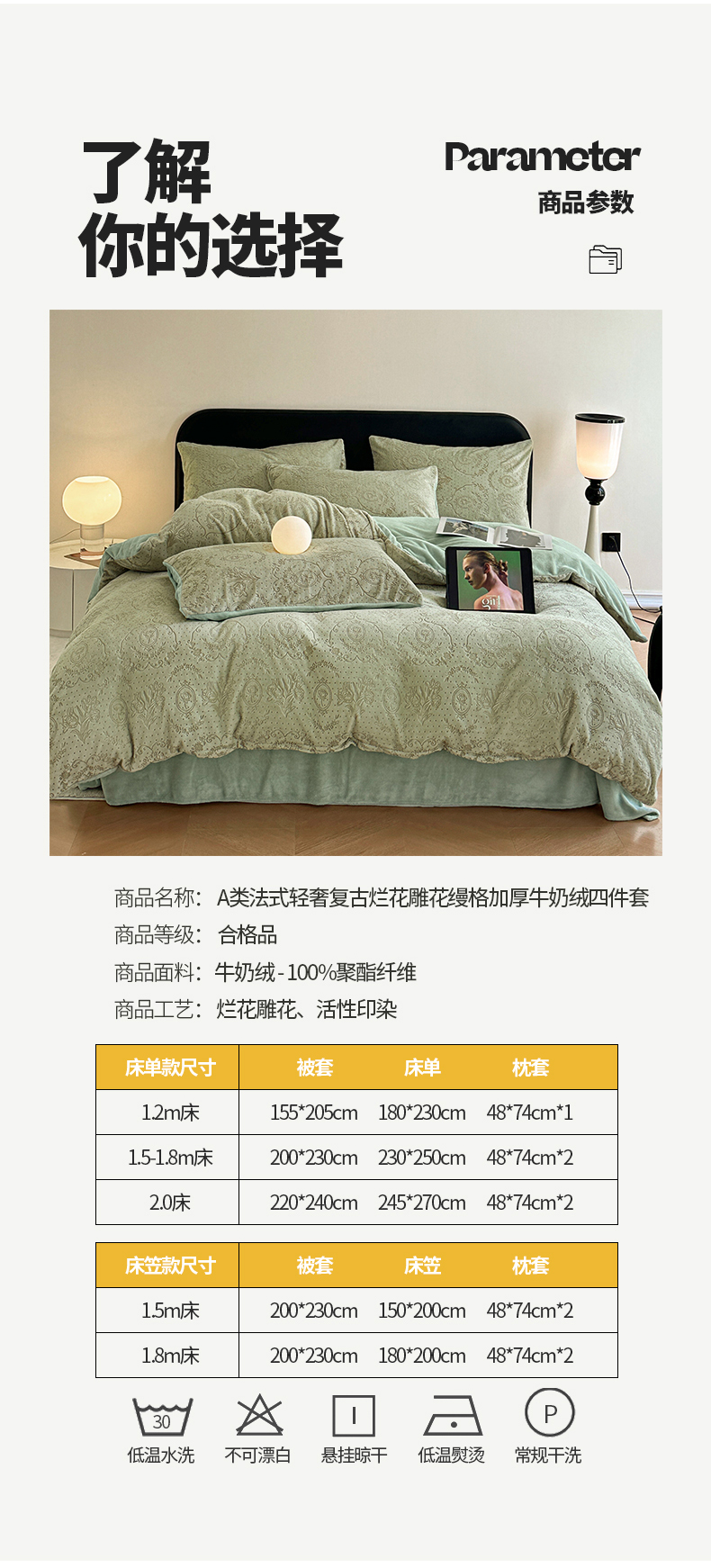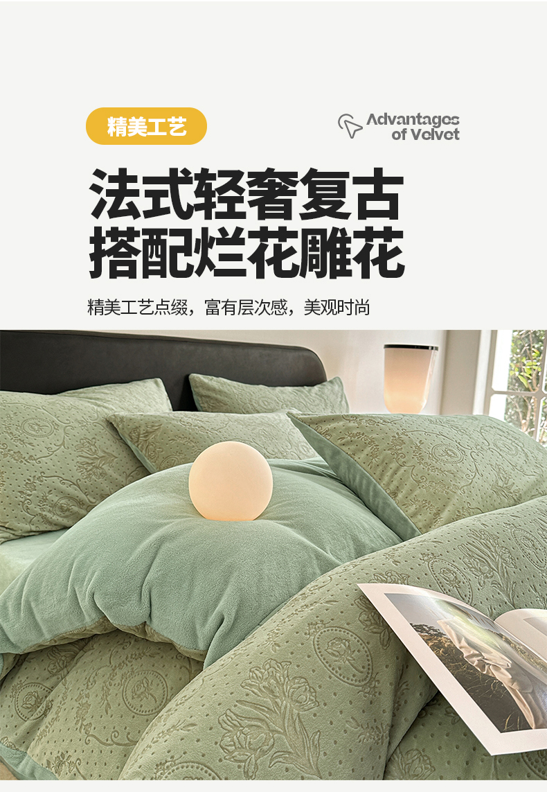 商品名称:桃子家居 2023新款A类高克重230克法式轻奢复古着色烂花雕花缦格加厚牛奶绒四件套 缦格富贵绿