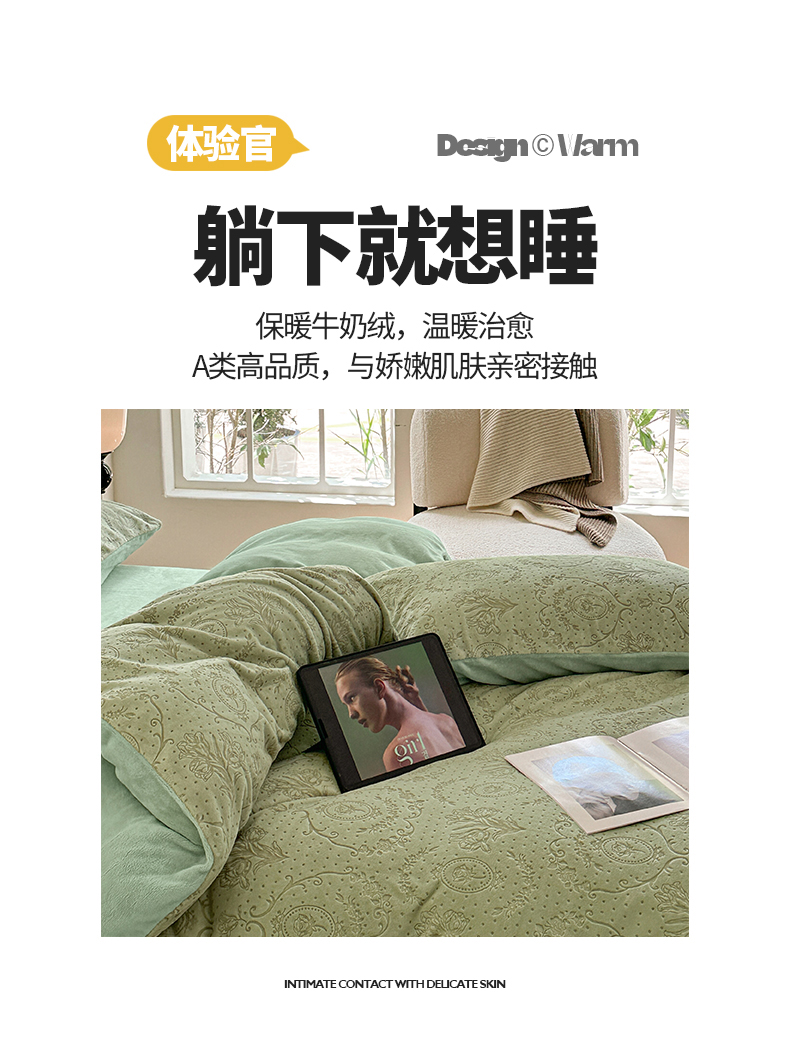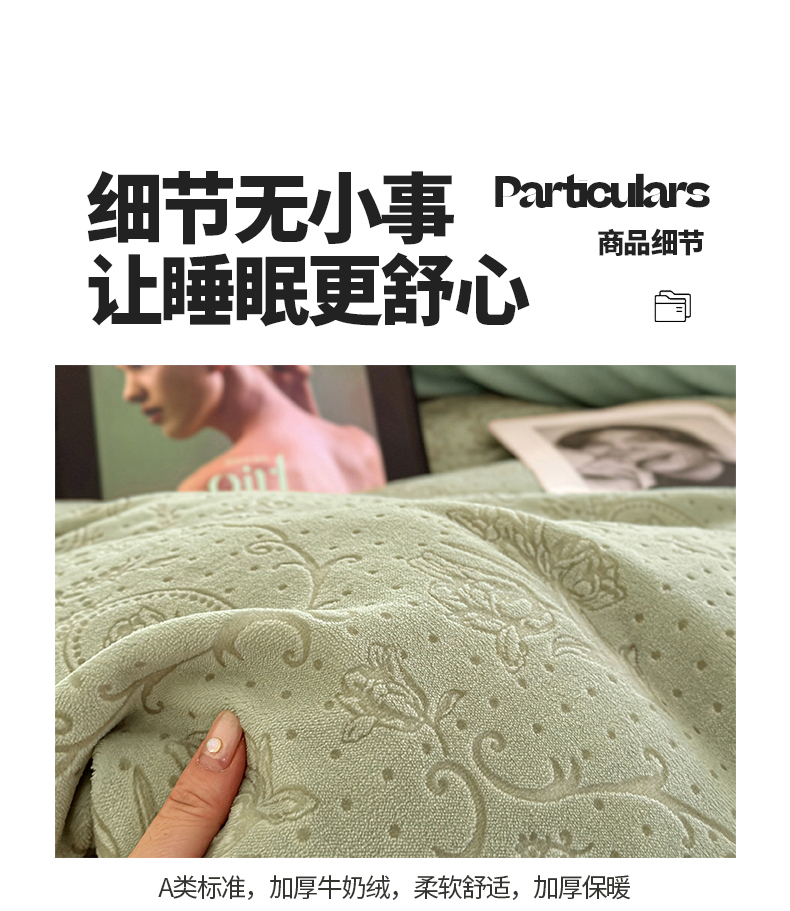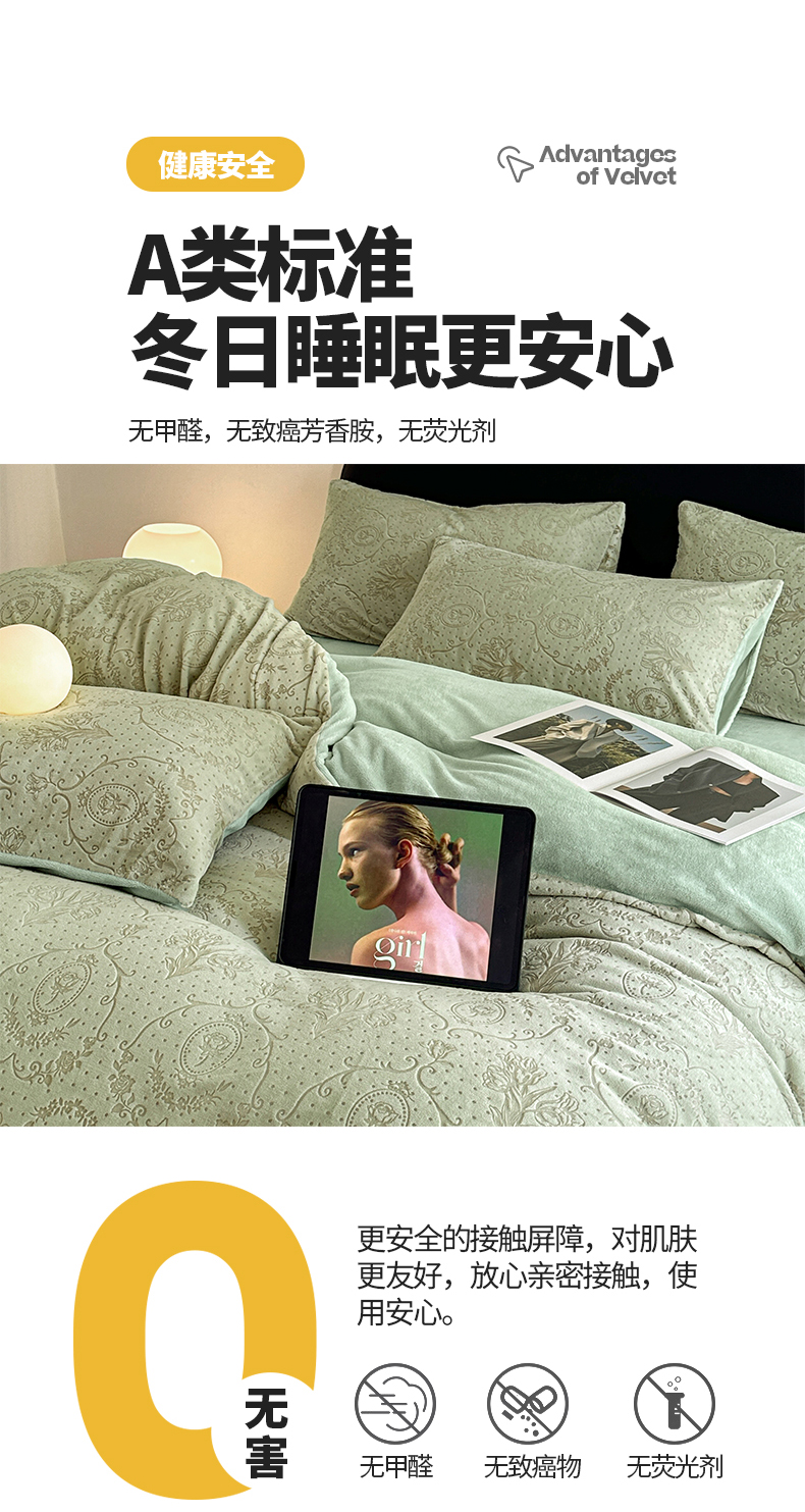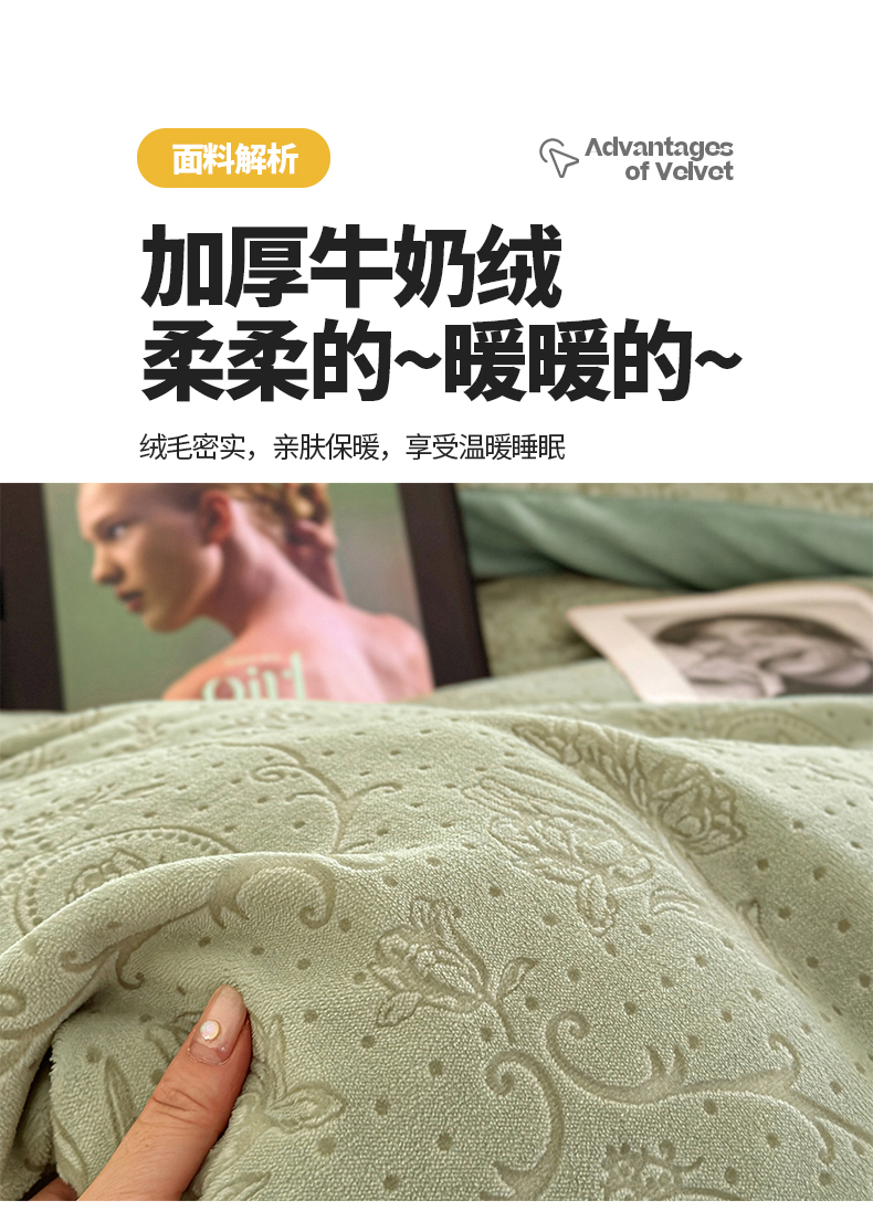 商品名称:桃子家居 2023新款A类高克重230克法式轻奢复古着色烂花雕花缦格加厚牛奶绒四件套 缦格富贵绿