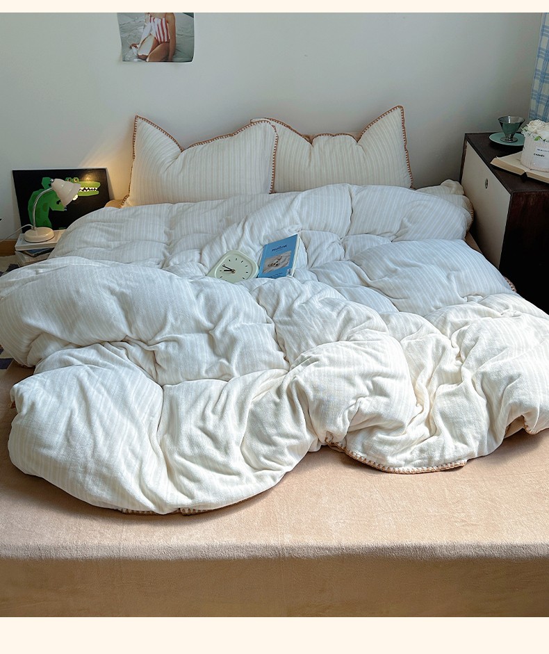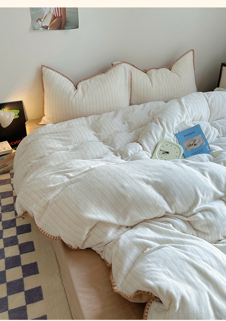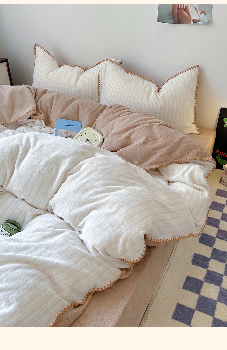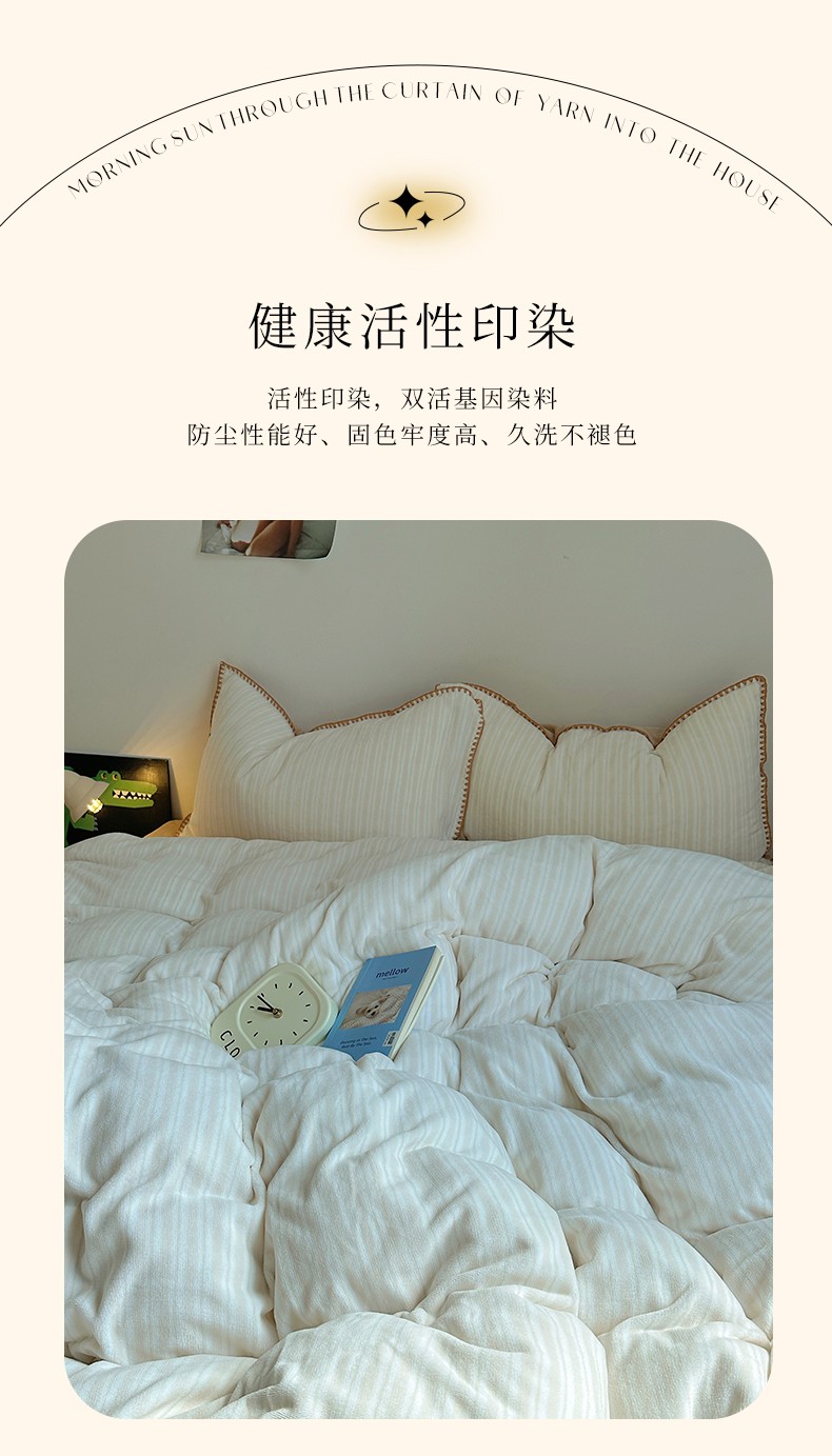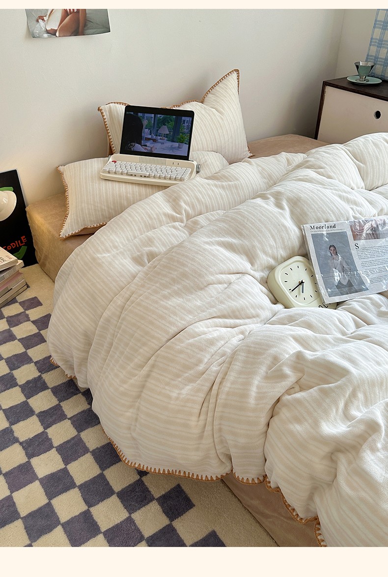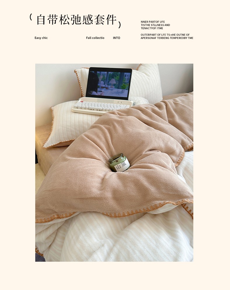 三朵 2023新款无印风牛奶绒四件套 浅卡其小条