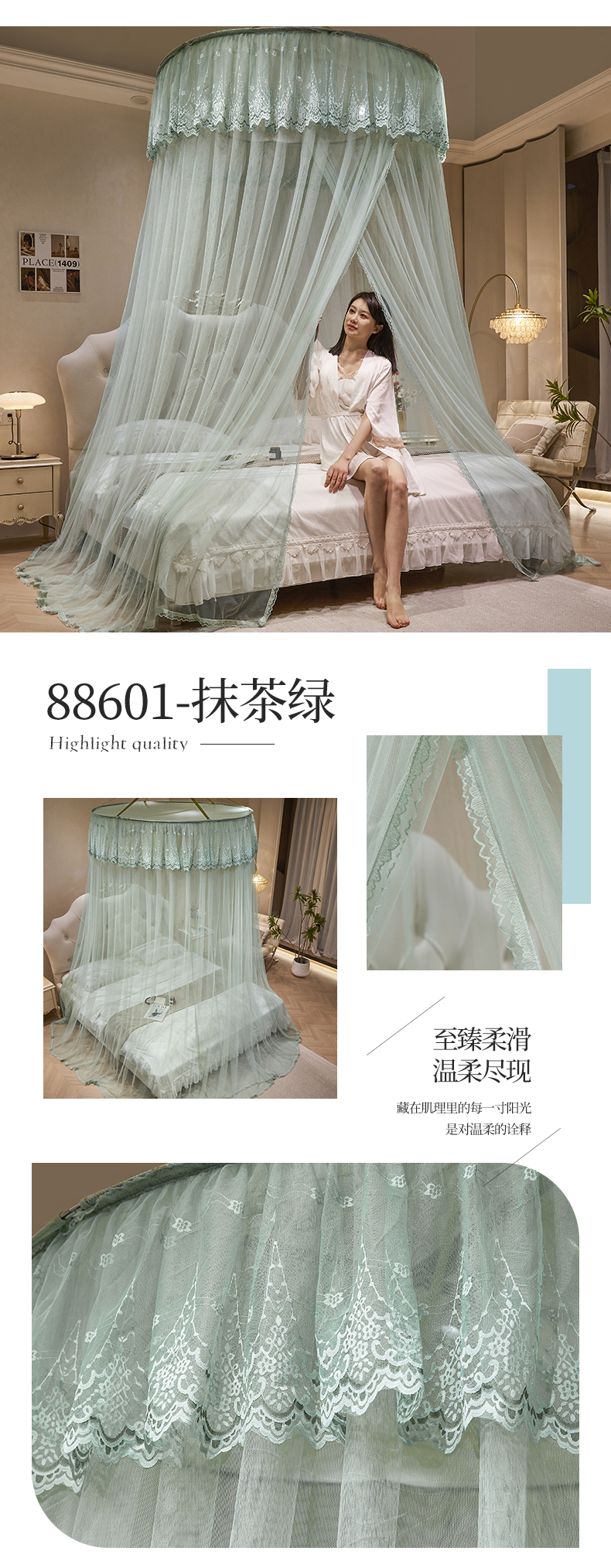 (总)夏彩 2025新款蕾丝U型防摔坐床蚊帐-88630,绿雅灰,藕玉色,香槟色
