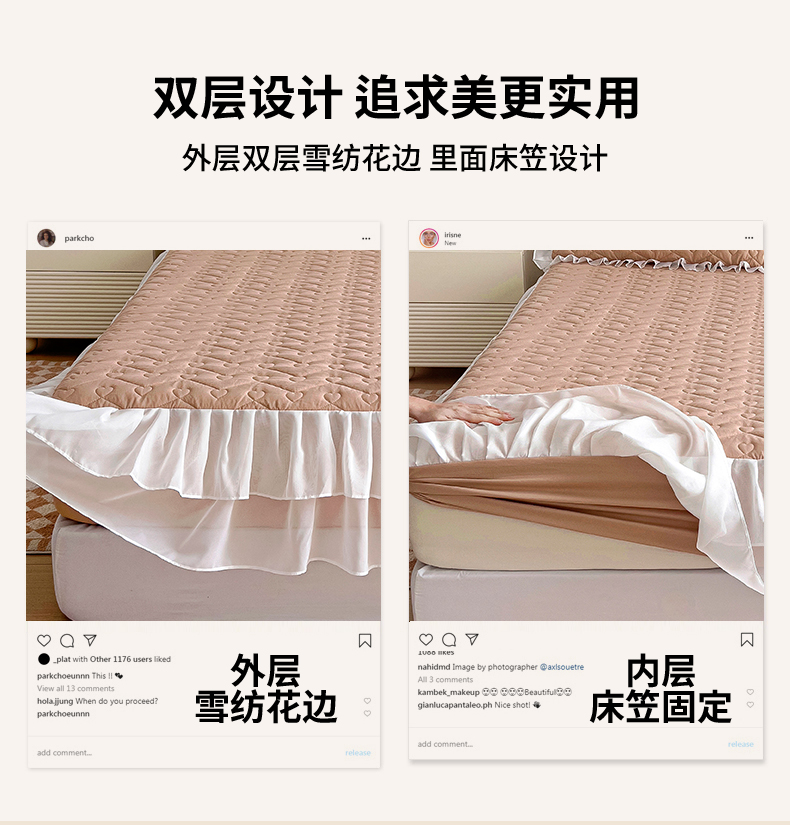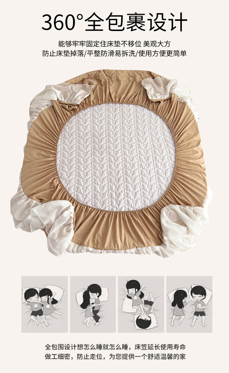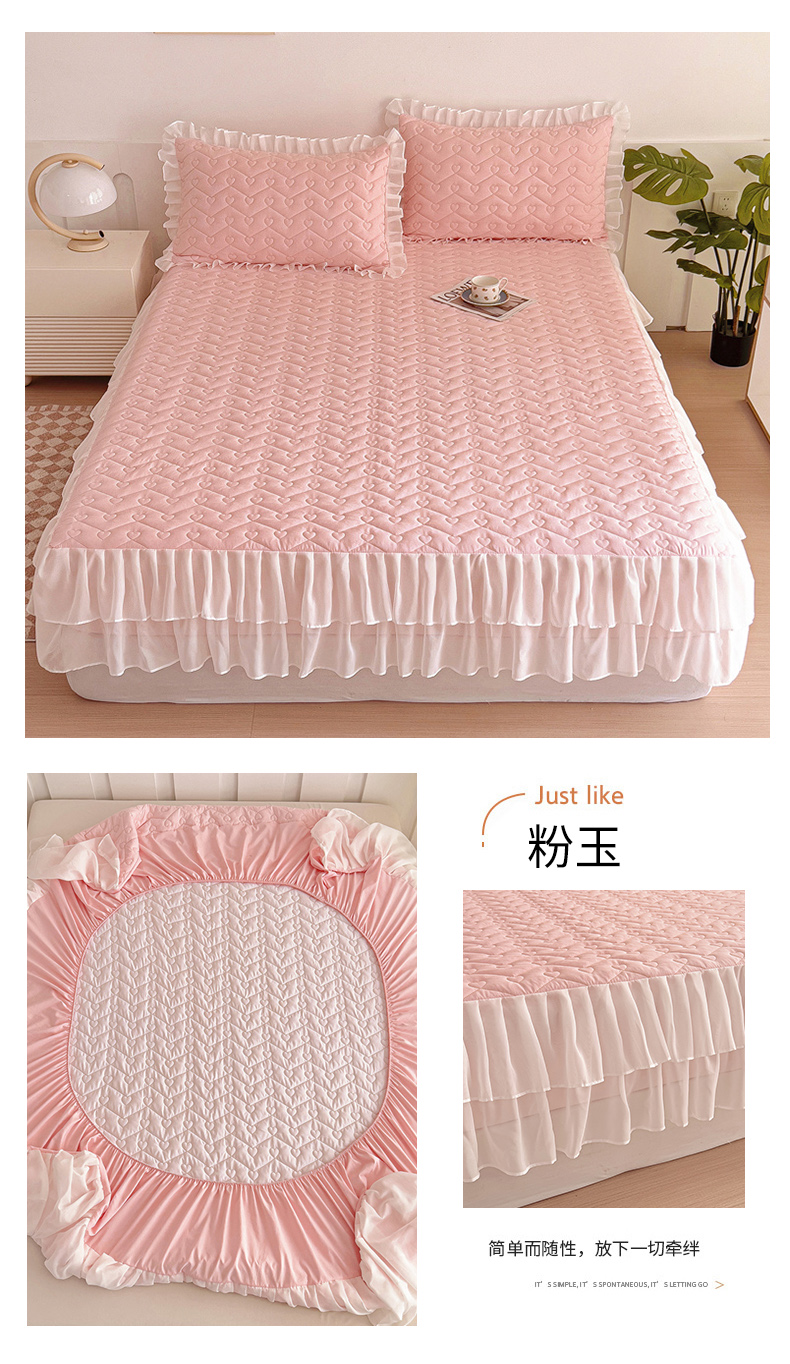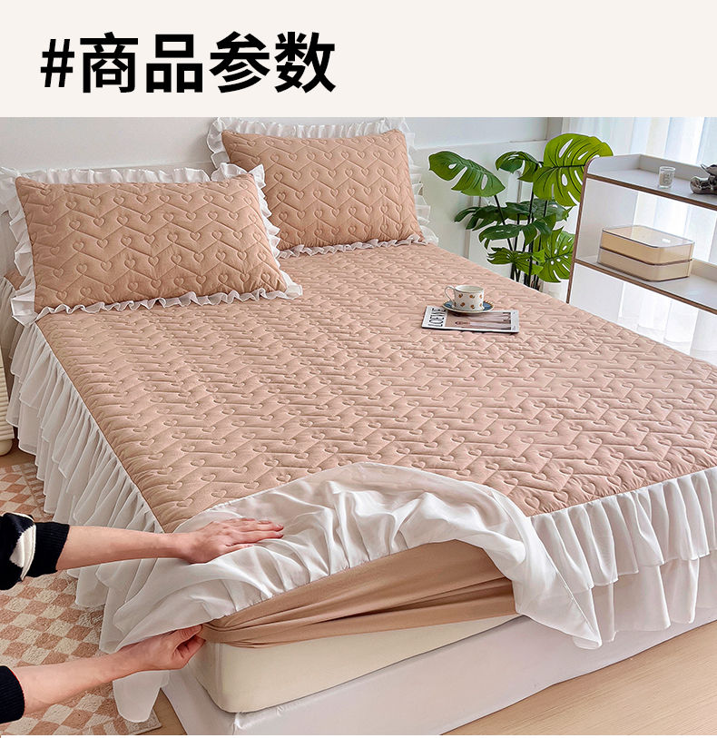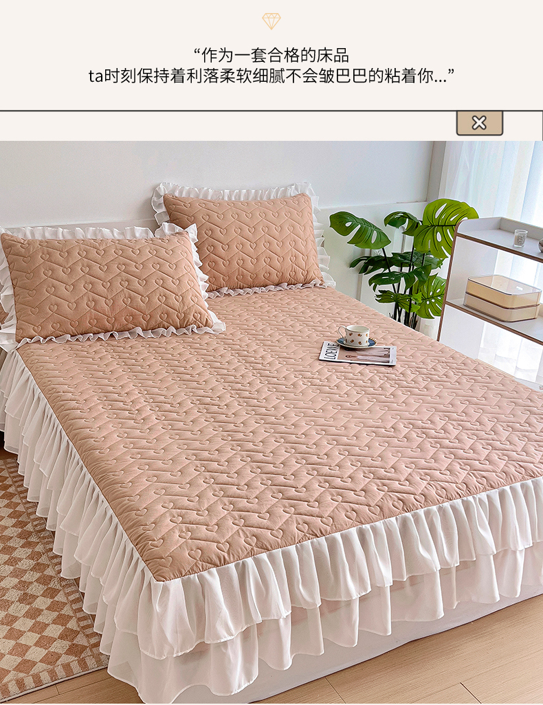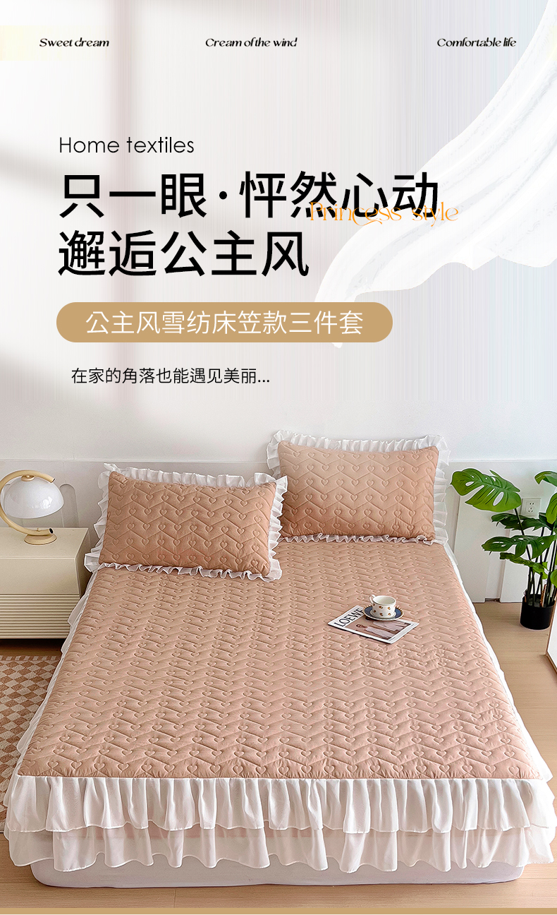 (总)屹成家纺2025新款水晶绒夹棉绗缝蕾丝床裙三件套(塞纳河畔)床裙单件起售价不低于105元,大红,豆沙,翡翠绿,粉玉,橄榄绿,蔚蓝,银灰