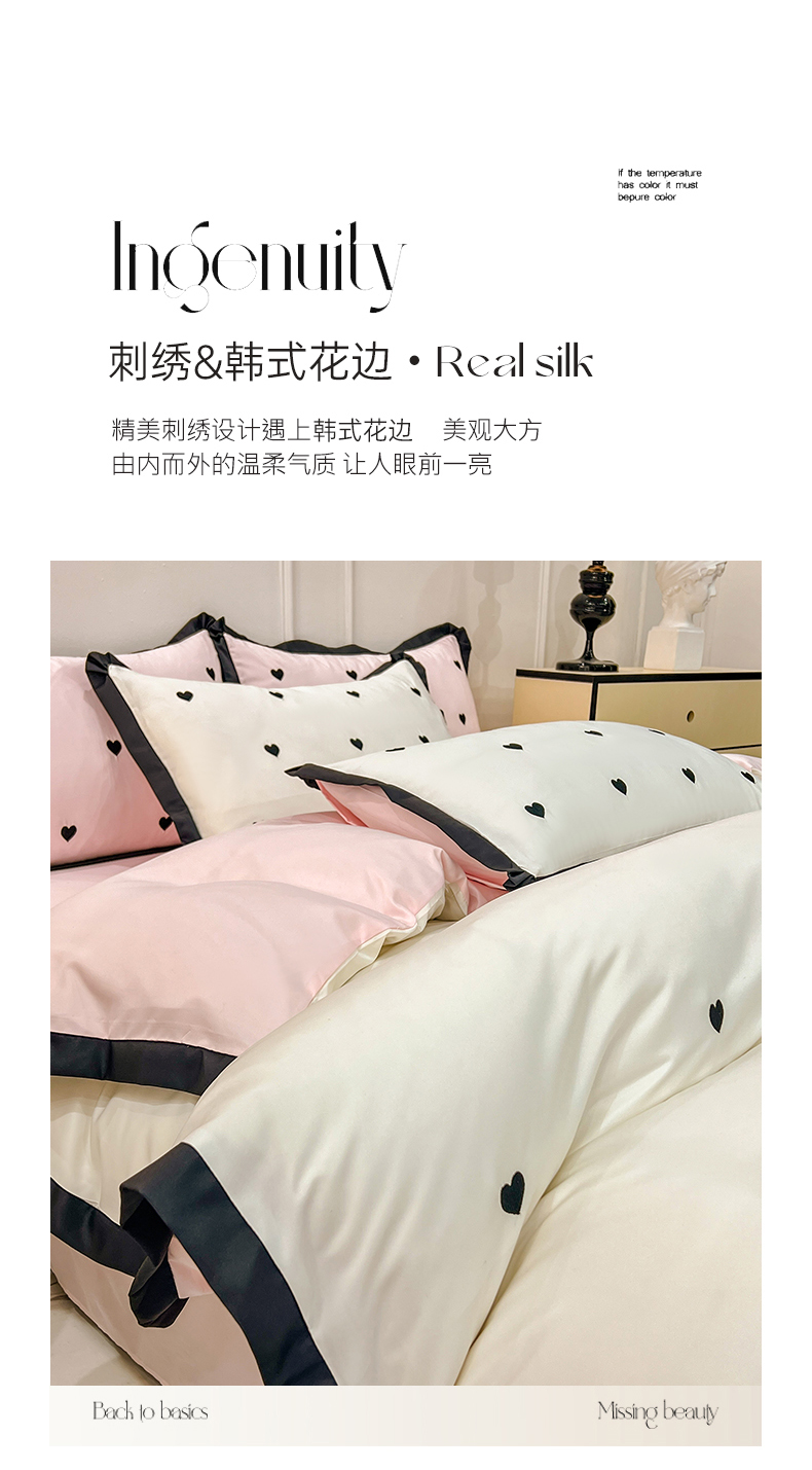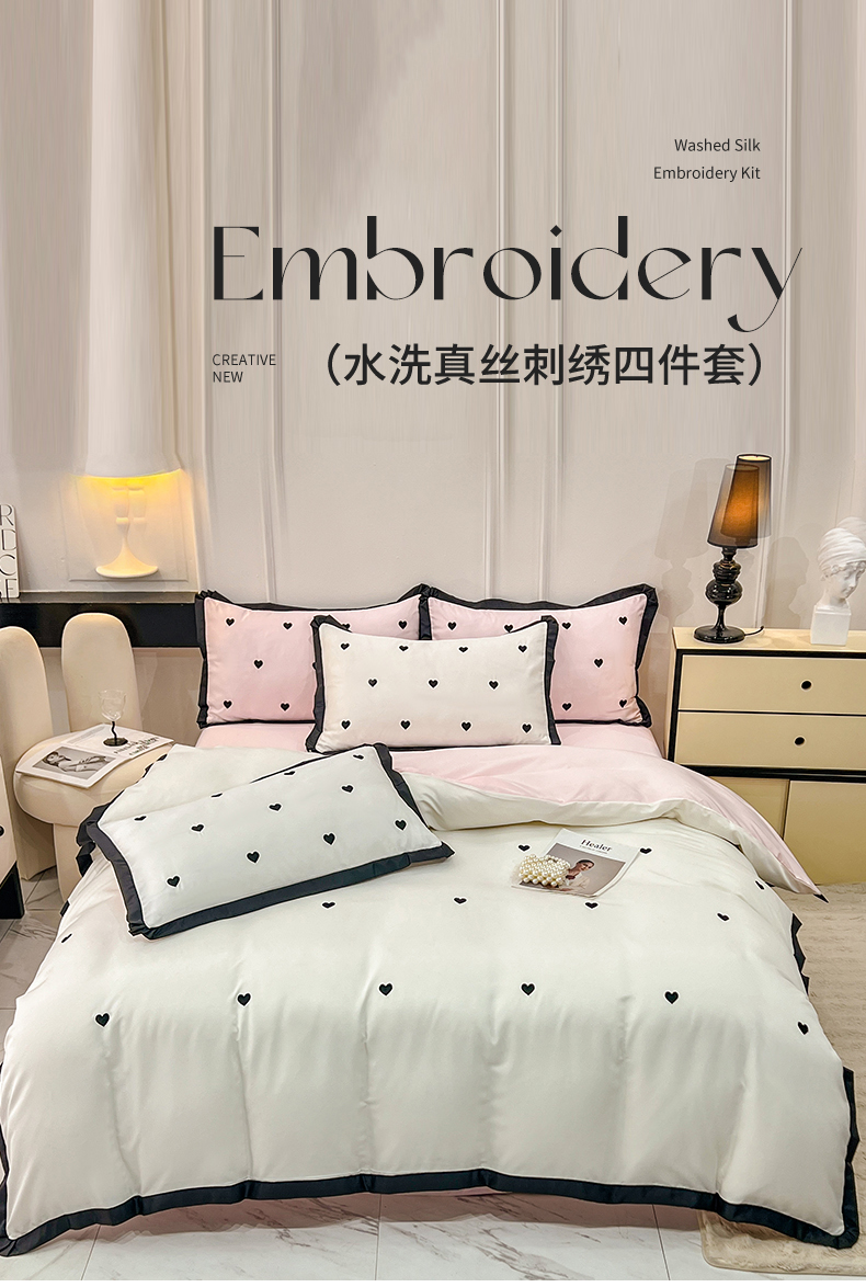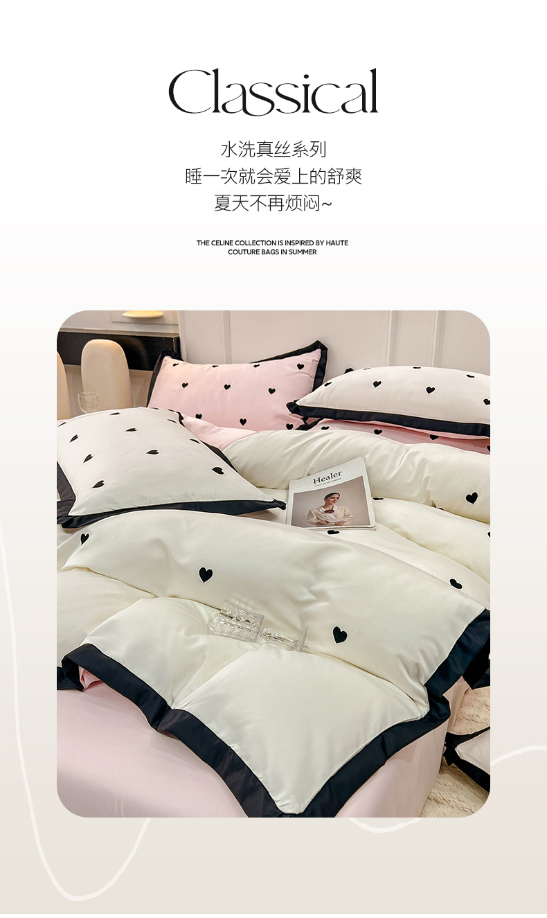 艾米家居 2025新款水洗真丝四件套爱心款 黑色爱心款-白加粉