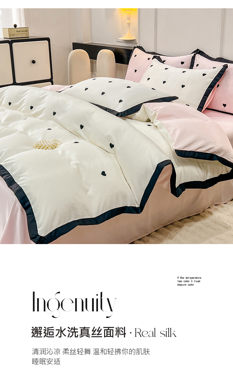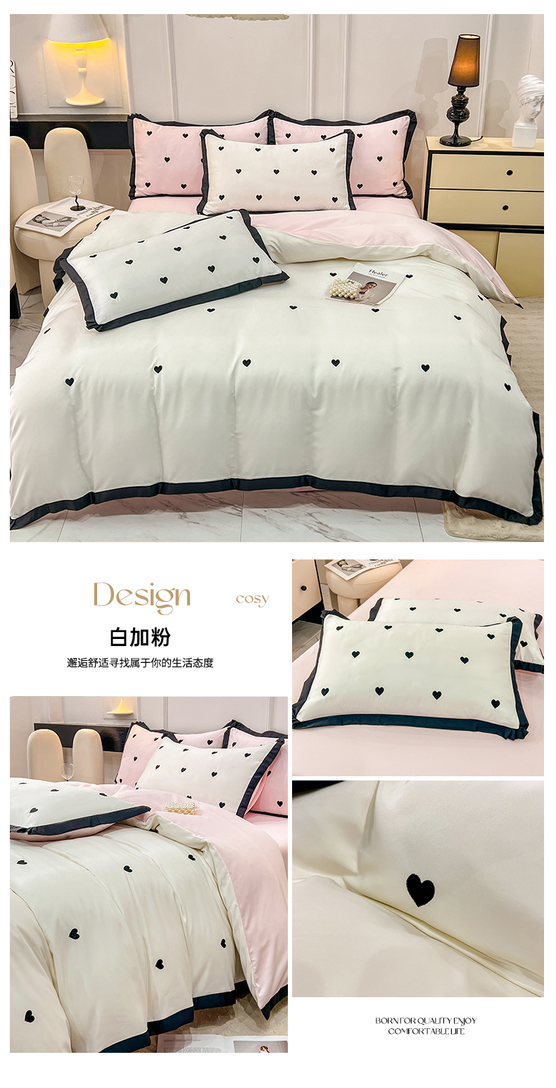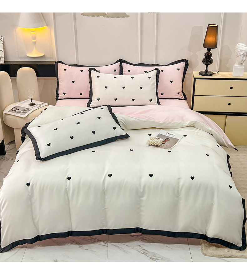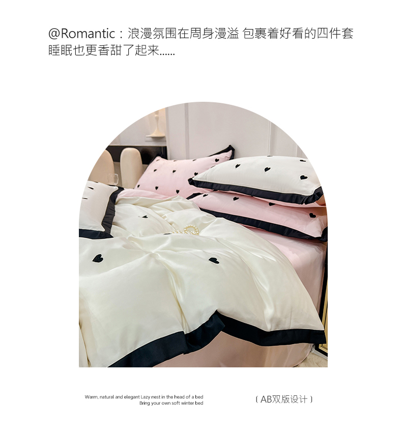 商品名称:艾米家居 2025新款水洗真丝四件套爱心款 黑色爱心款-白加粉