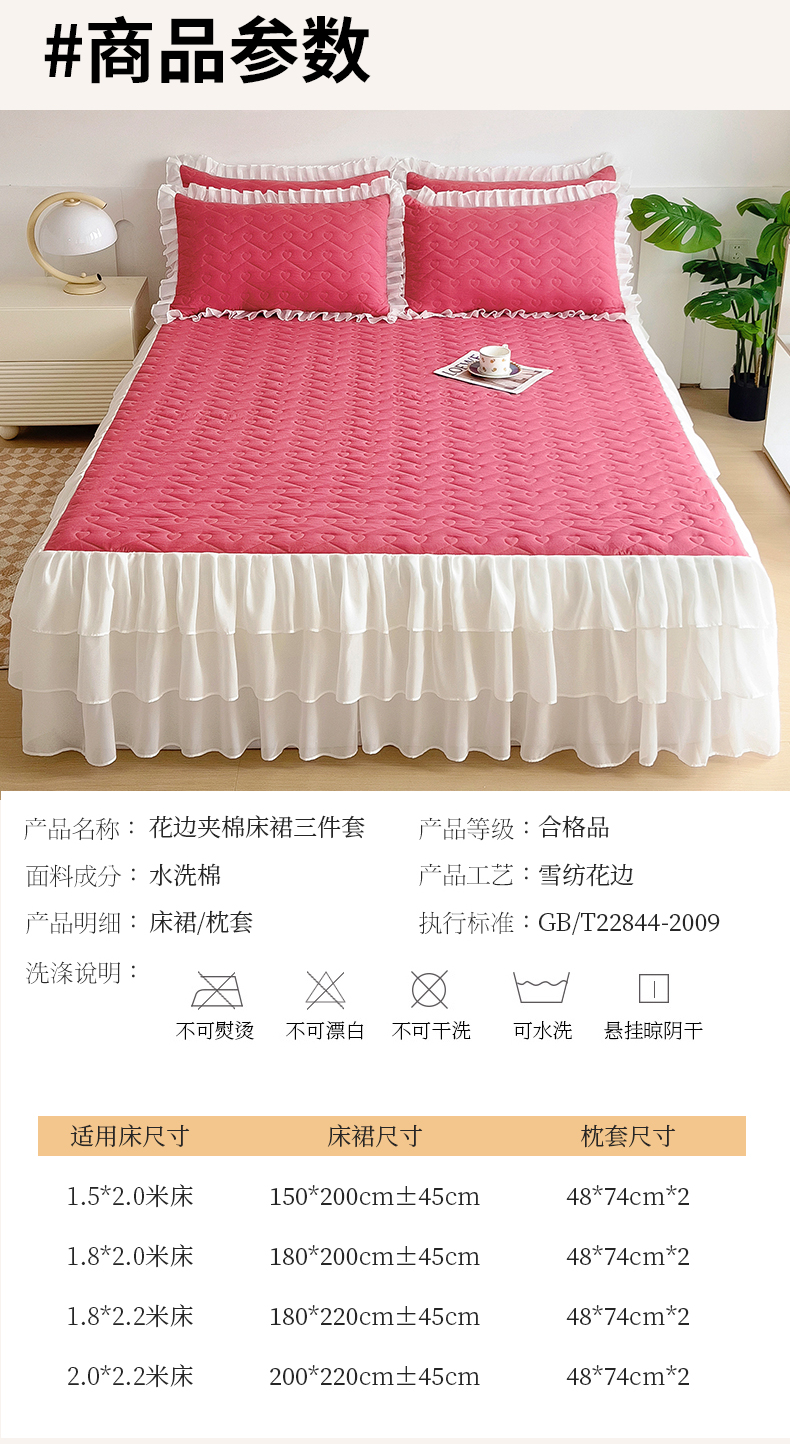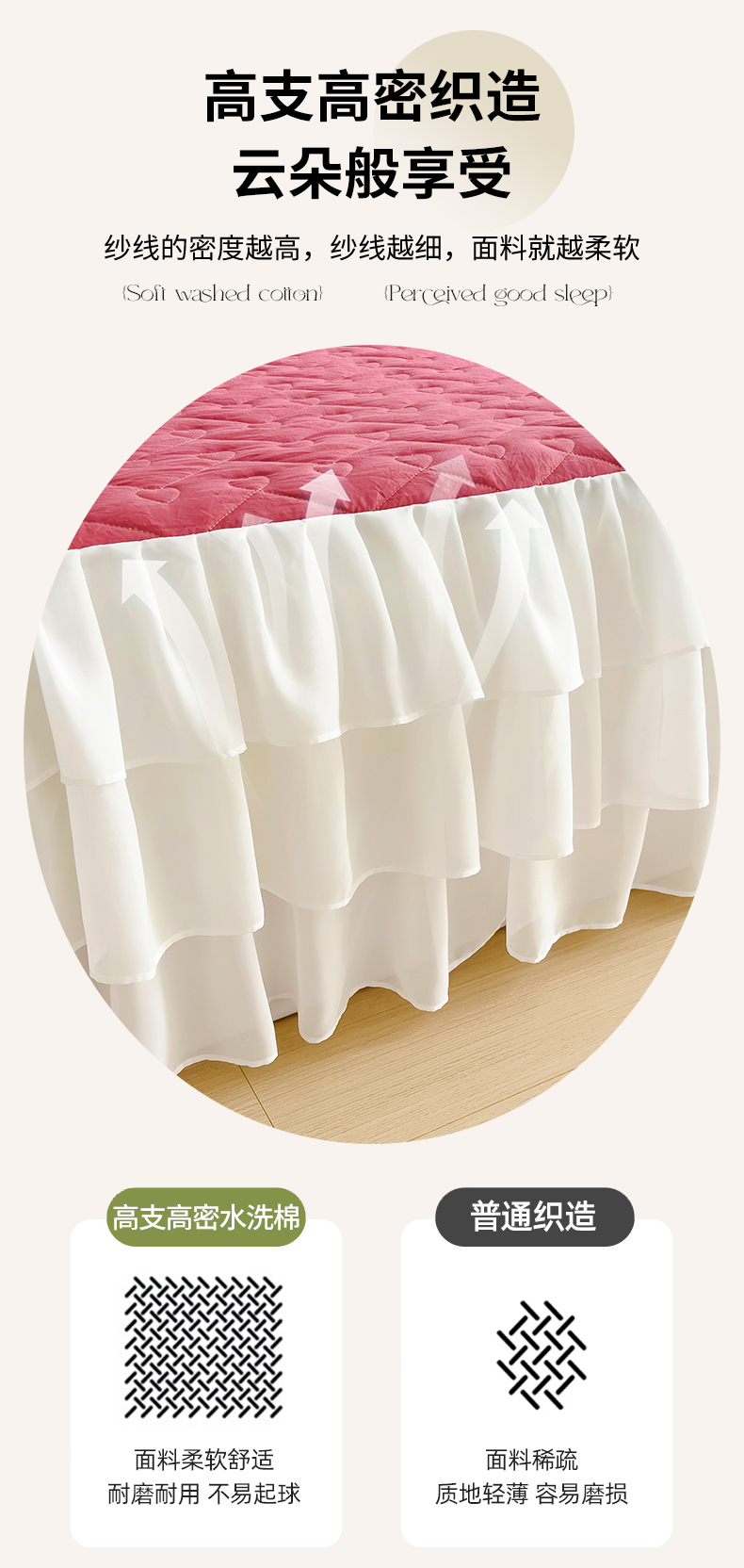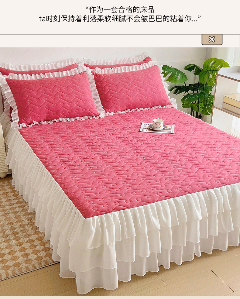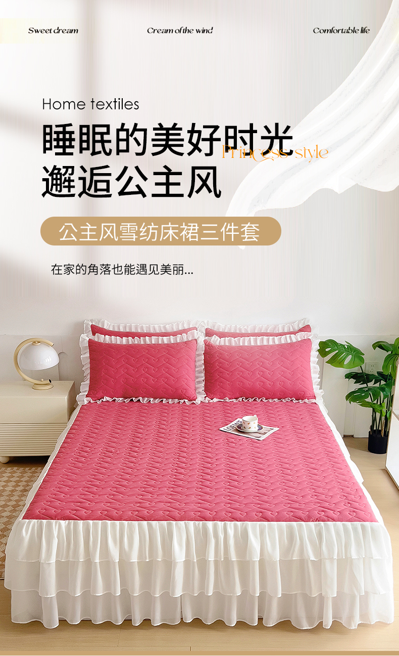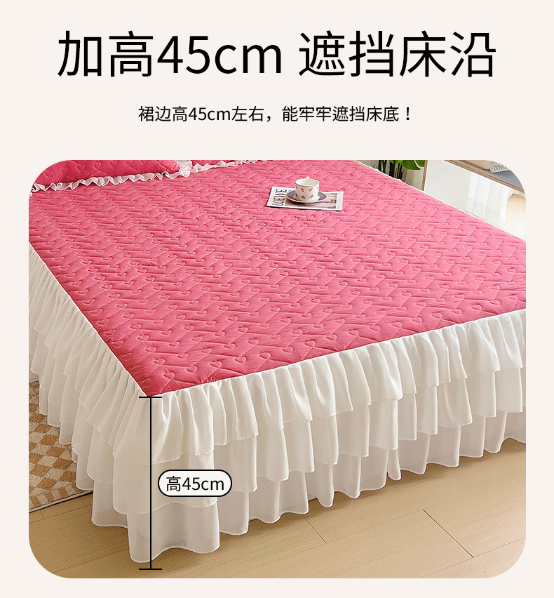 (总)屹成家纺2025新款水晶绒夹棉绗缝蕾丝床裙三件套(塞纳河畔)床裙单件起售价不低于105元,大红,豆沙,翡翠绿,粉玉,橄榄绿,蔚蓝,银灰