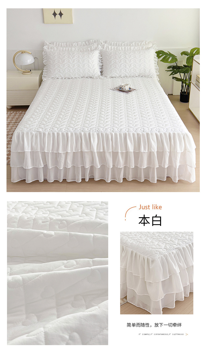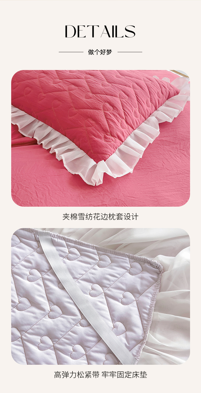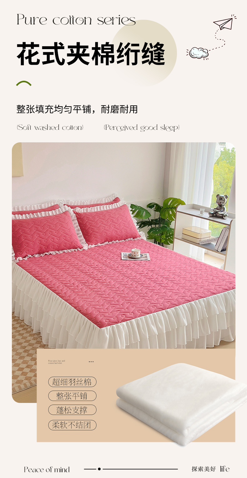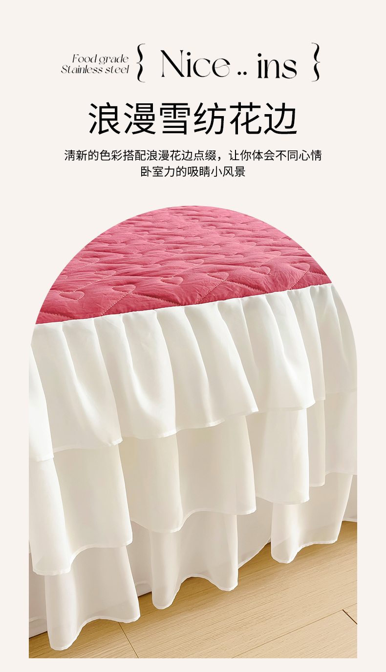 (总)屹成家纺2025新款水晶绒夹棉绗缝蕾丝床裙三件套(塞纳河畔)床裙单件起售价不低于105元,大红,豆沙,翡翠绿,粉玉,橄榄绿,蔚蓝,银灰