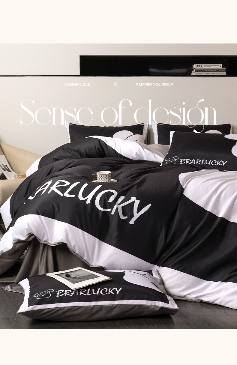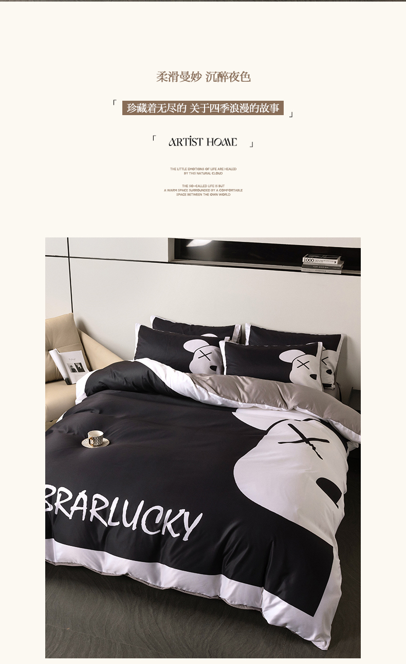 摩卡 2024新款博主风水洗真丝四件套 半脸熊-黑