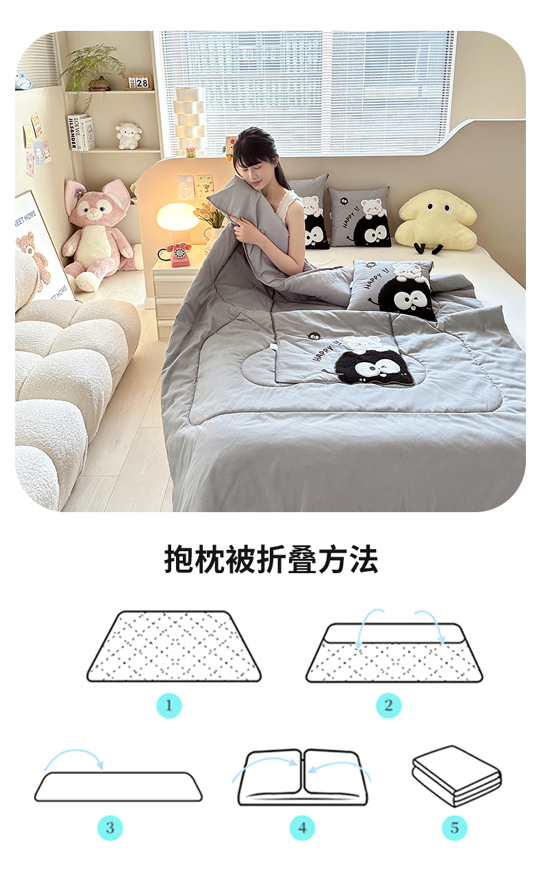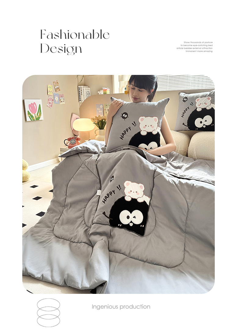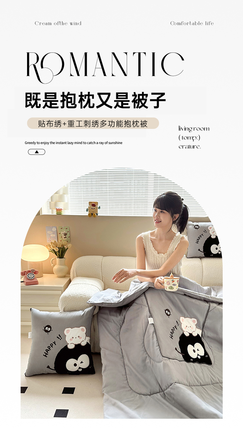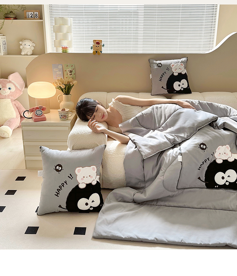 铭宣家居 2024新款贴布绣+重工刺绣多功能抱枕被系列 可爱煤球 可爱煤球-灰色