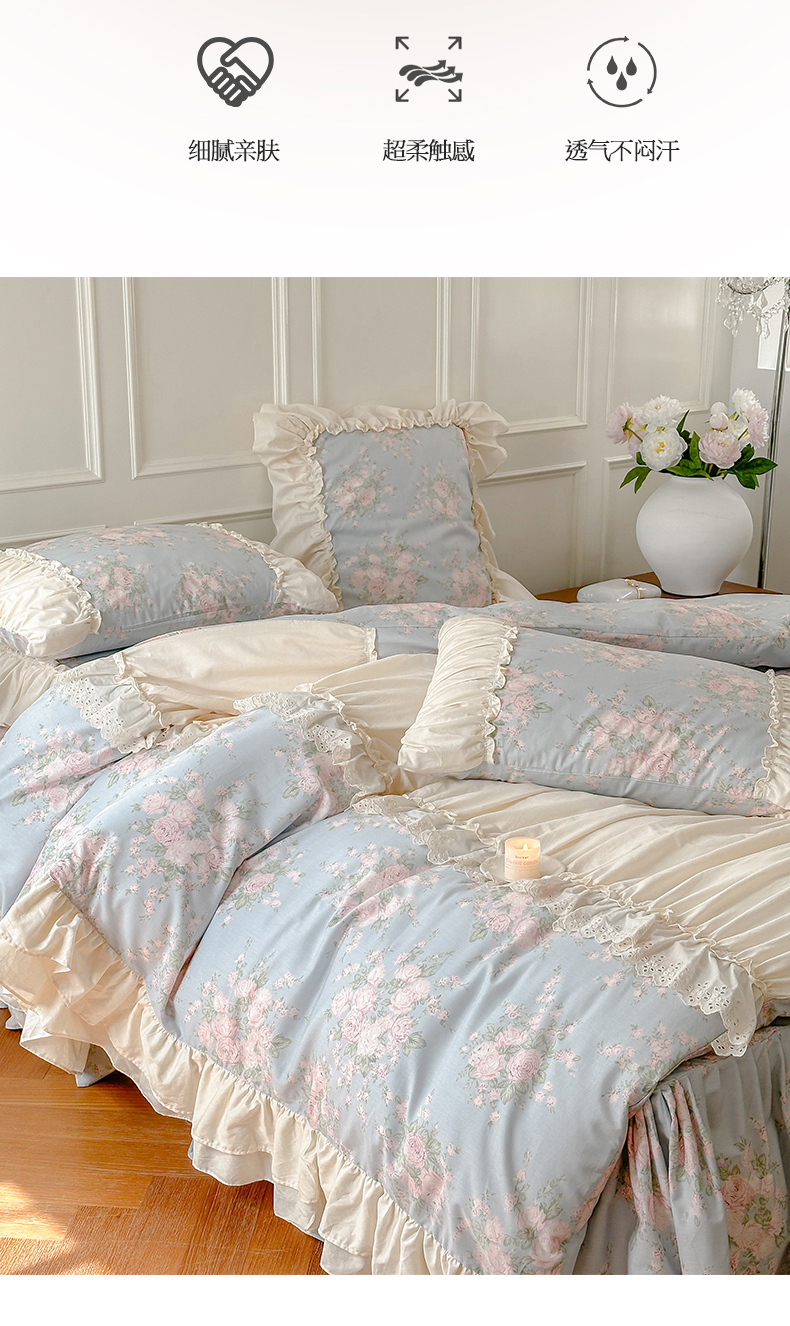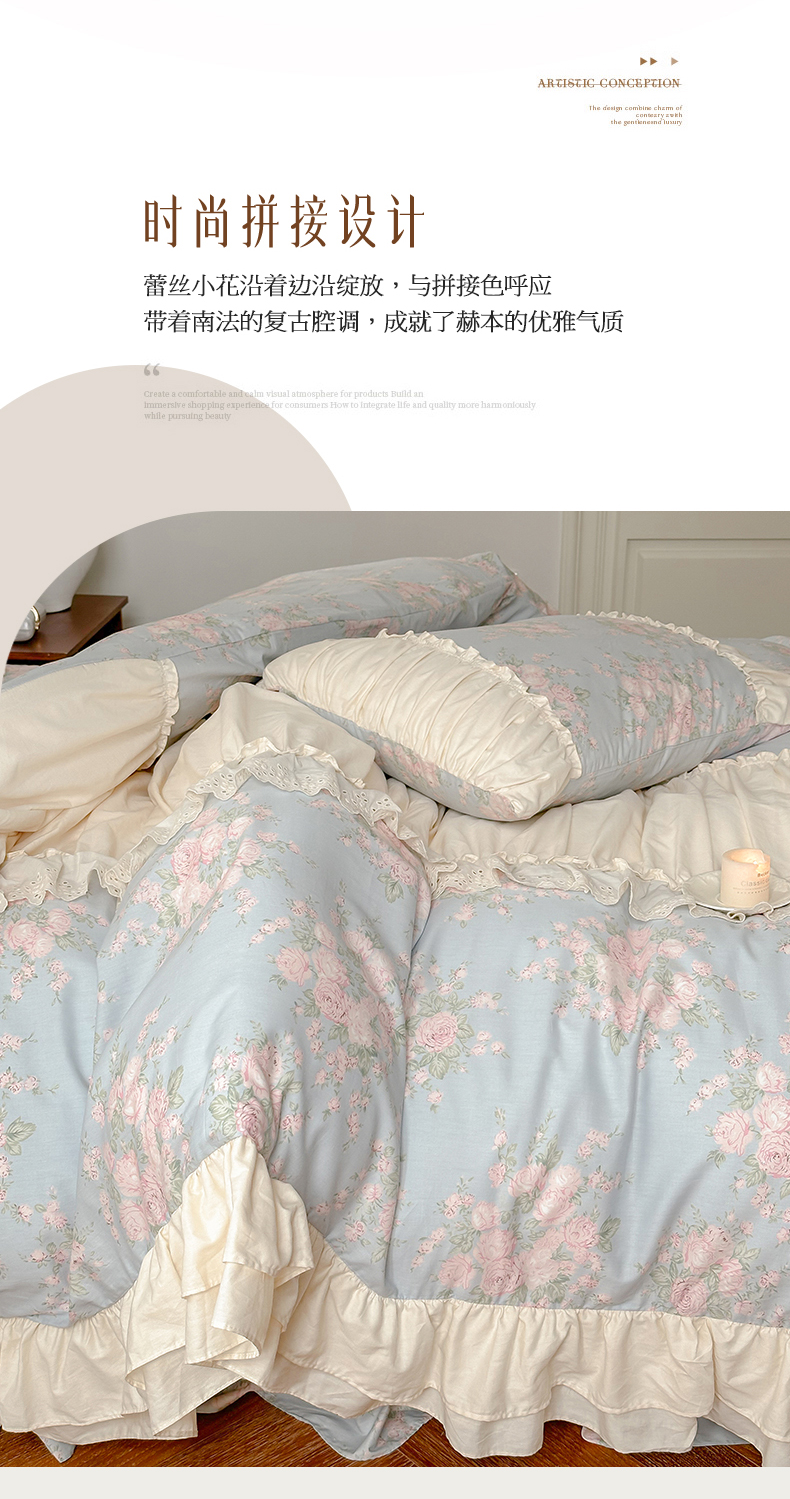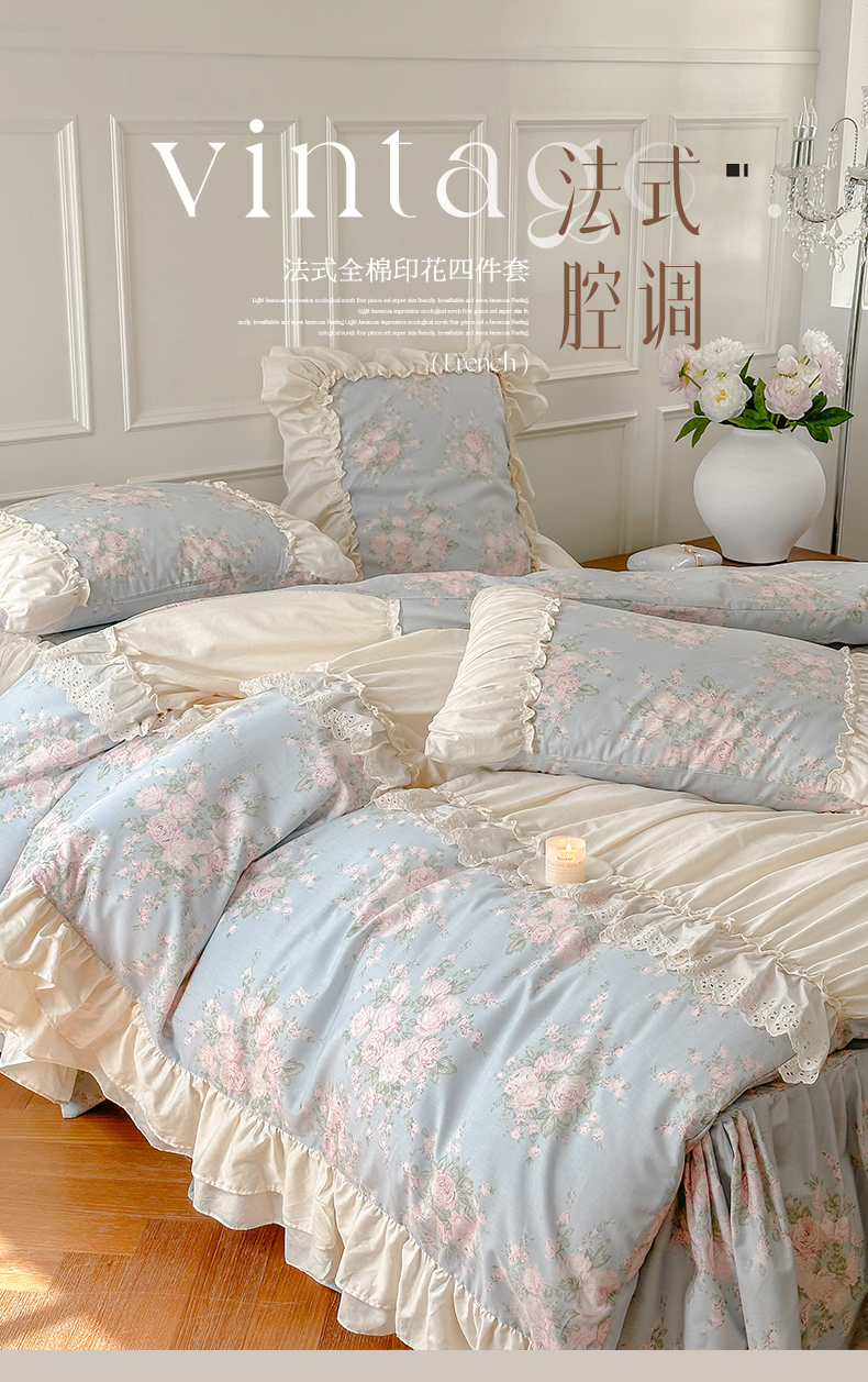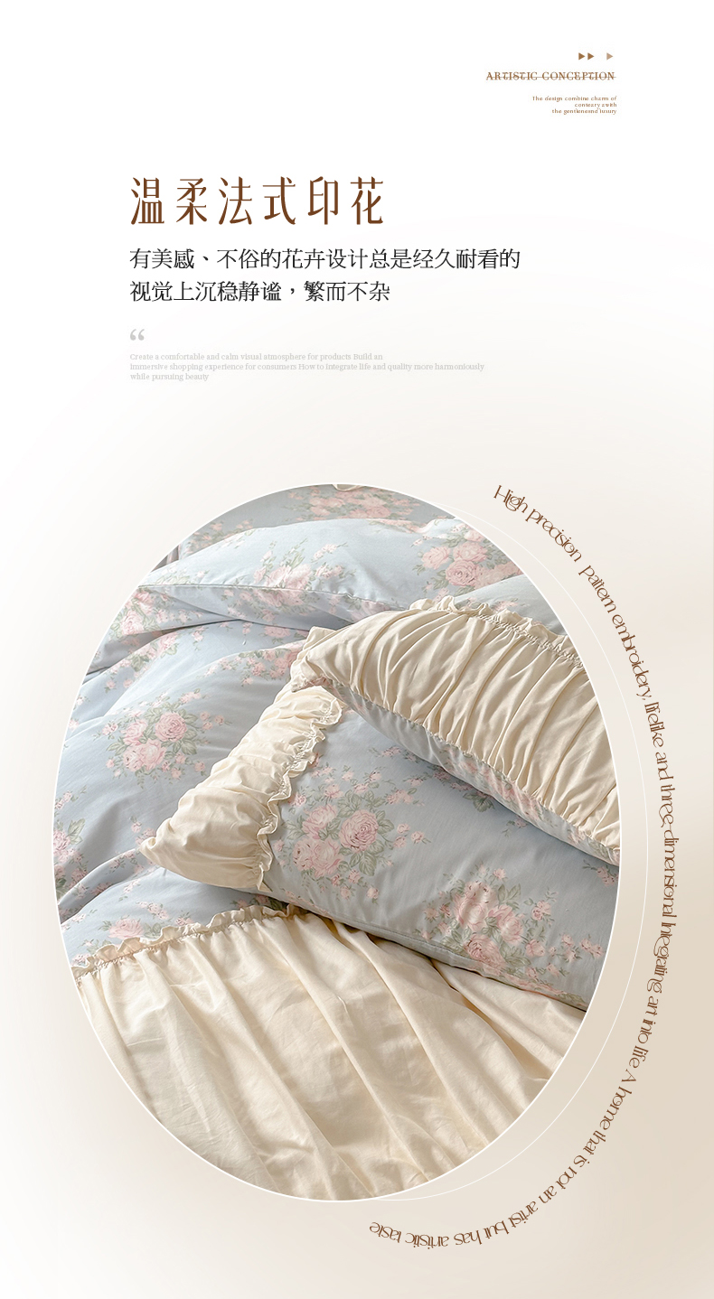 婳庭家居 2024新款法式全棉印花四件套 花卉-浅蓝