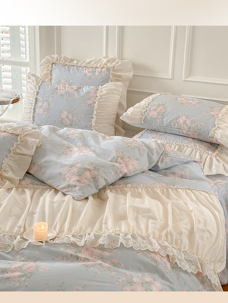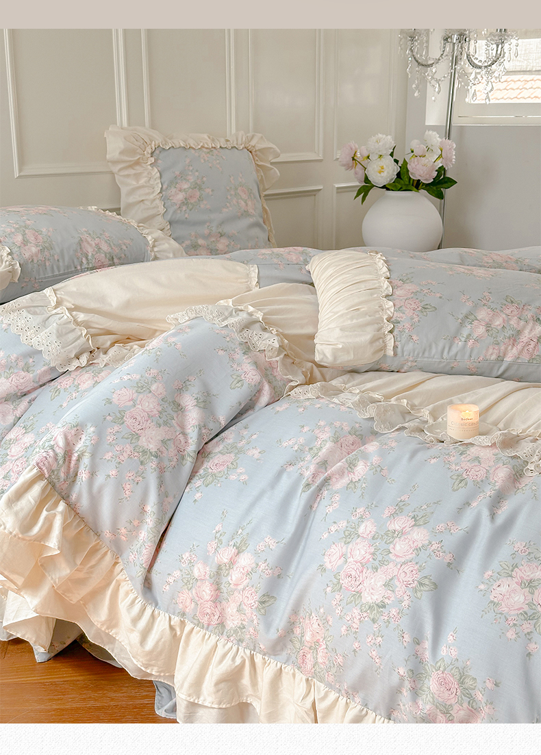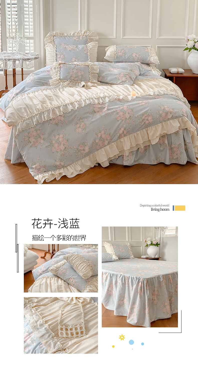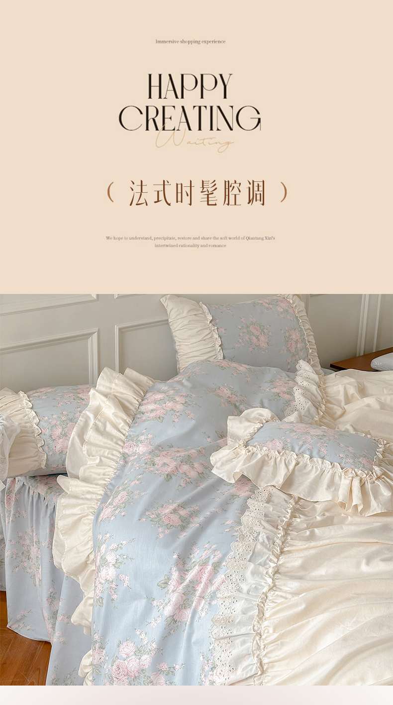 婳庭家居 2024新款法式全棉印花四件套 花卉-浅蓝
