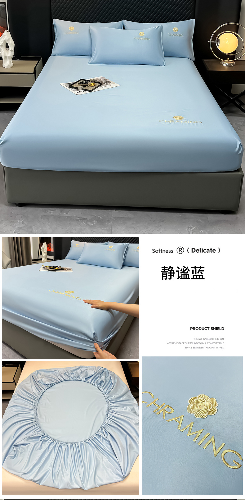 (总)笠裙家纺 2024新款水洗真丝刺绣床笠系列,静谧兰,奶茶白,浅豆绿,浅灰银,柔粉色,绅士蓝,鸢尾紫
