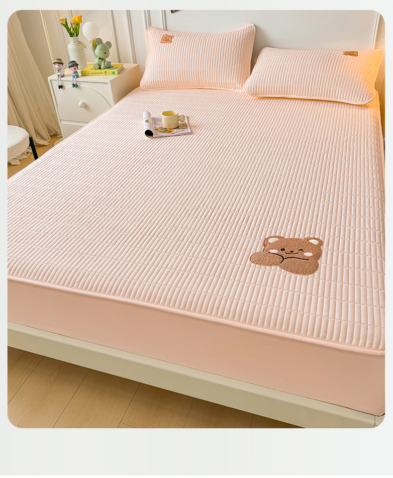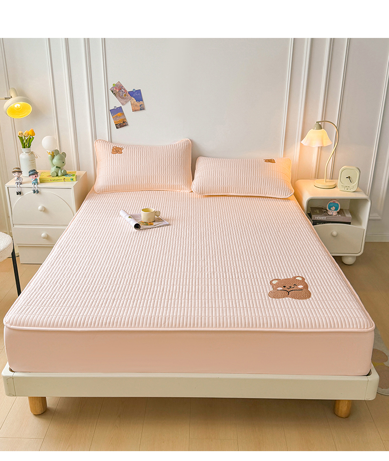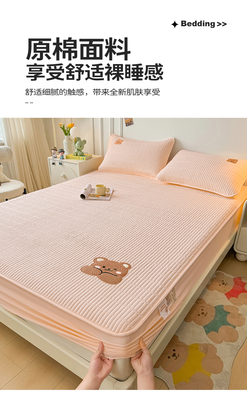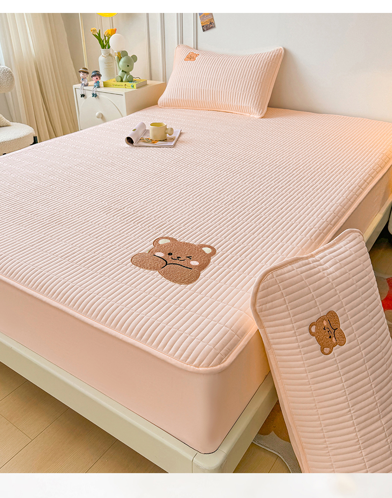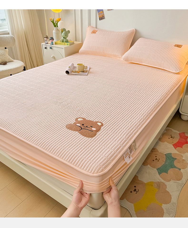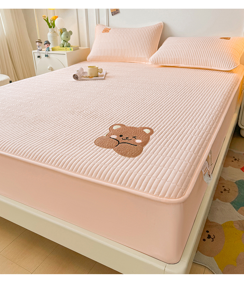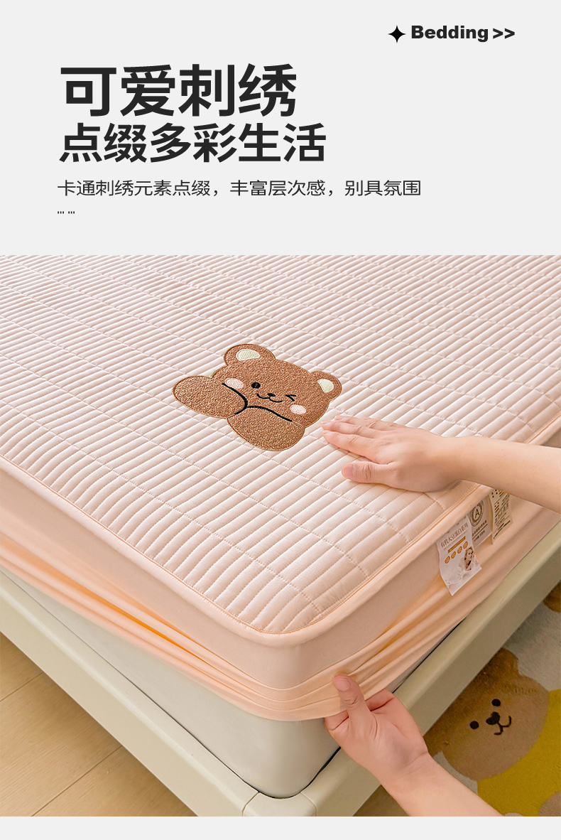 2025新品高克重A类原棉夹棉床笠刺绣绣花柯基熊猫床笠三件套 床笠款-幸福熊-豆蔻玉