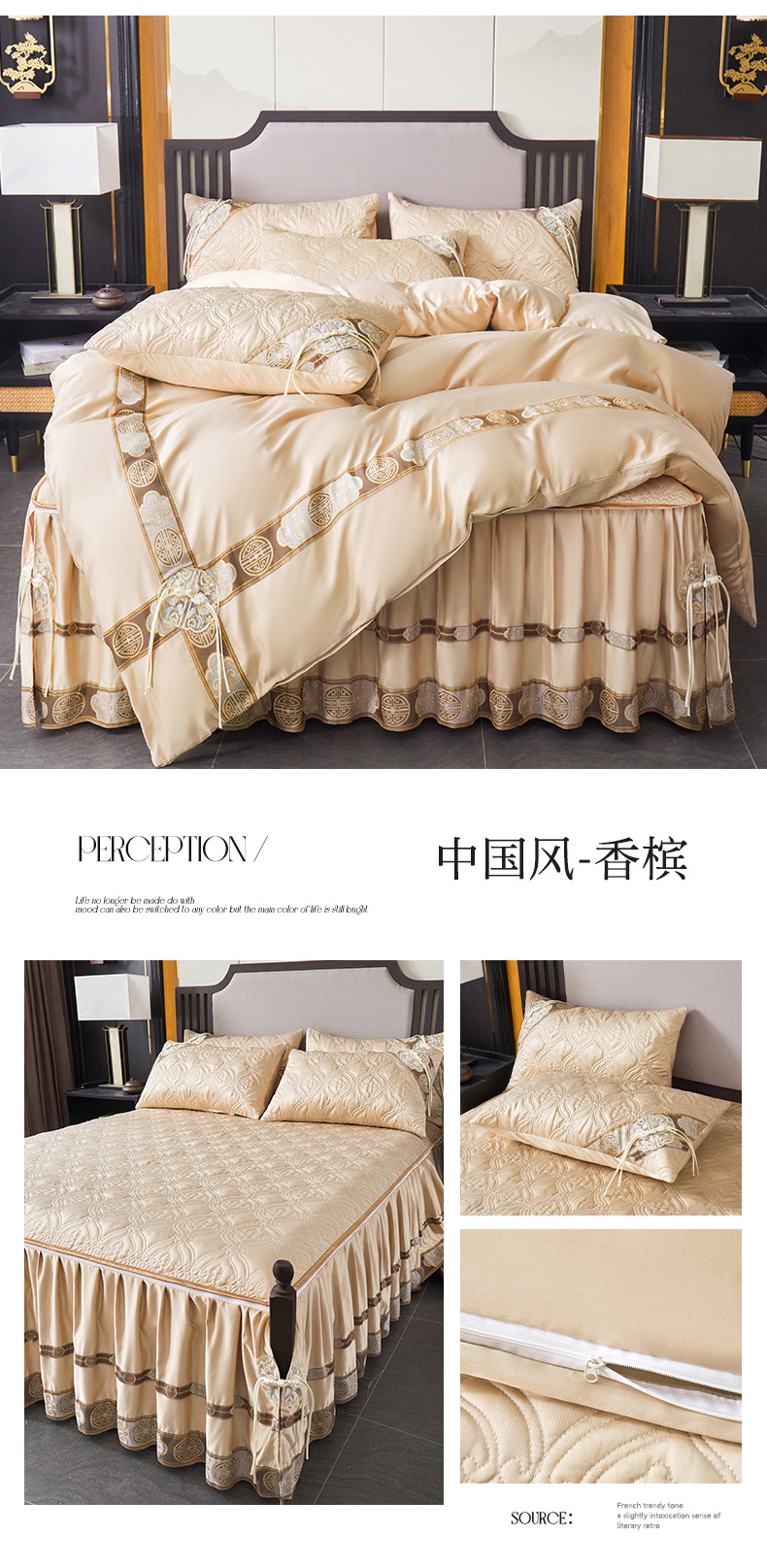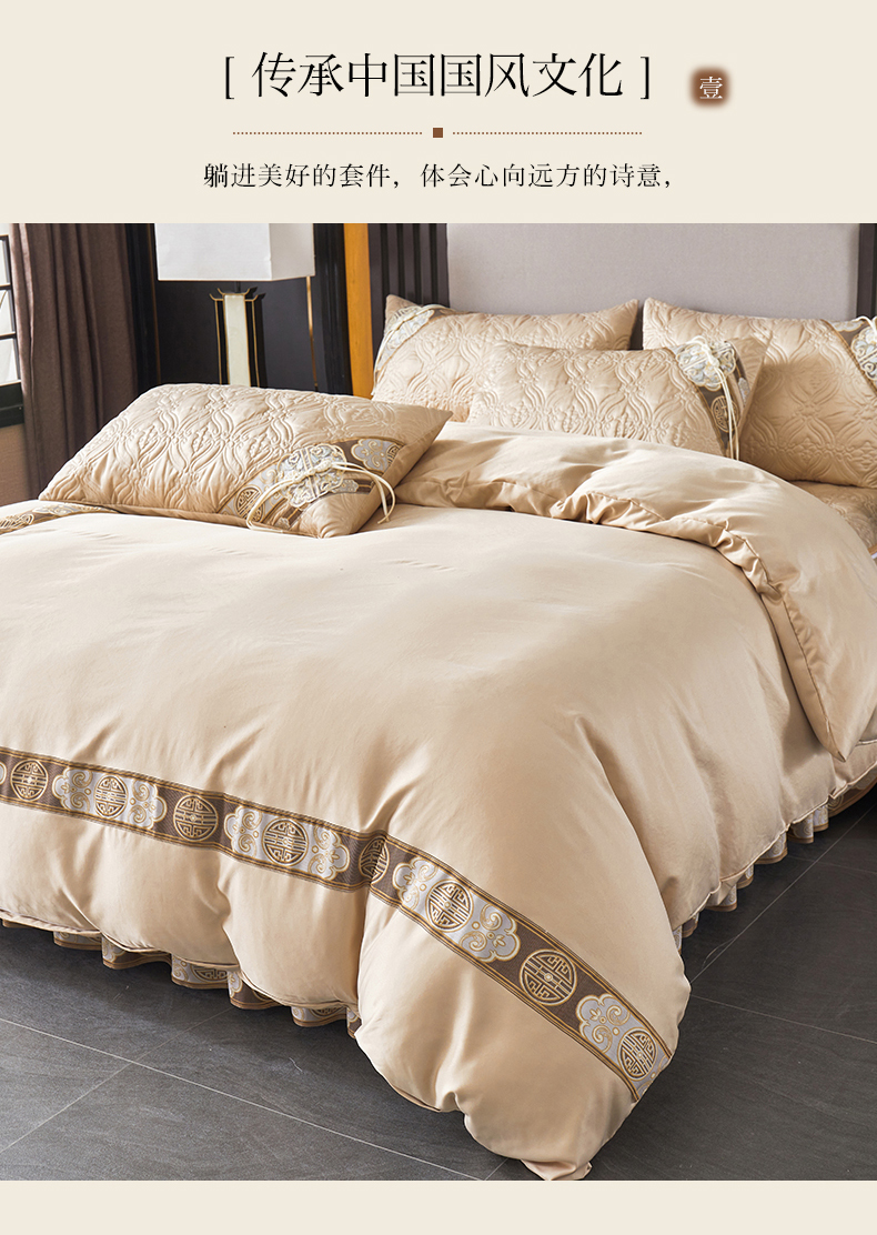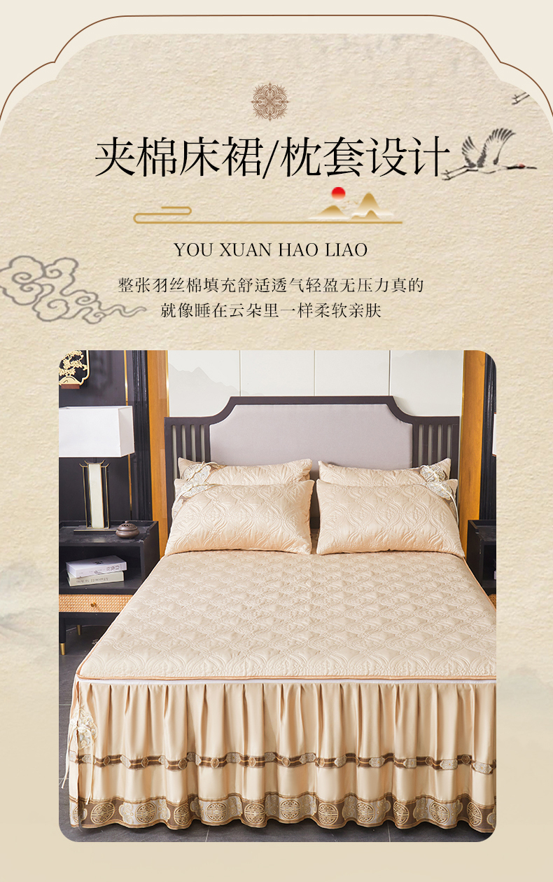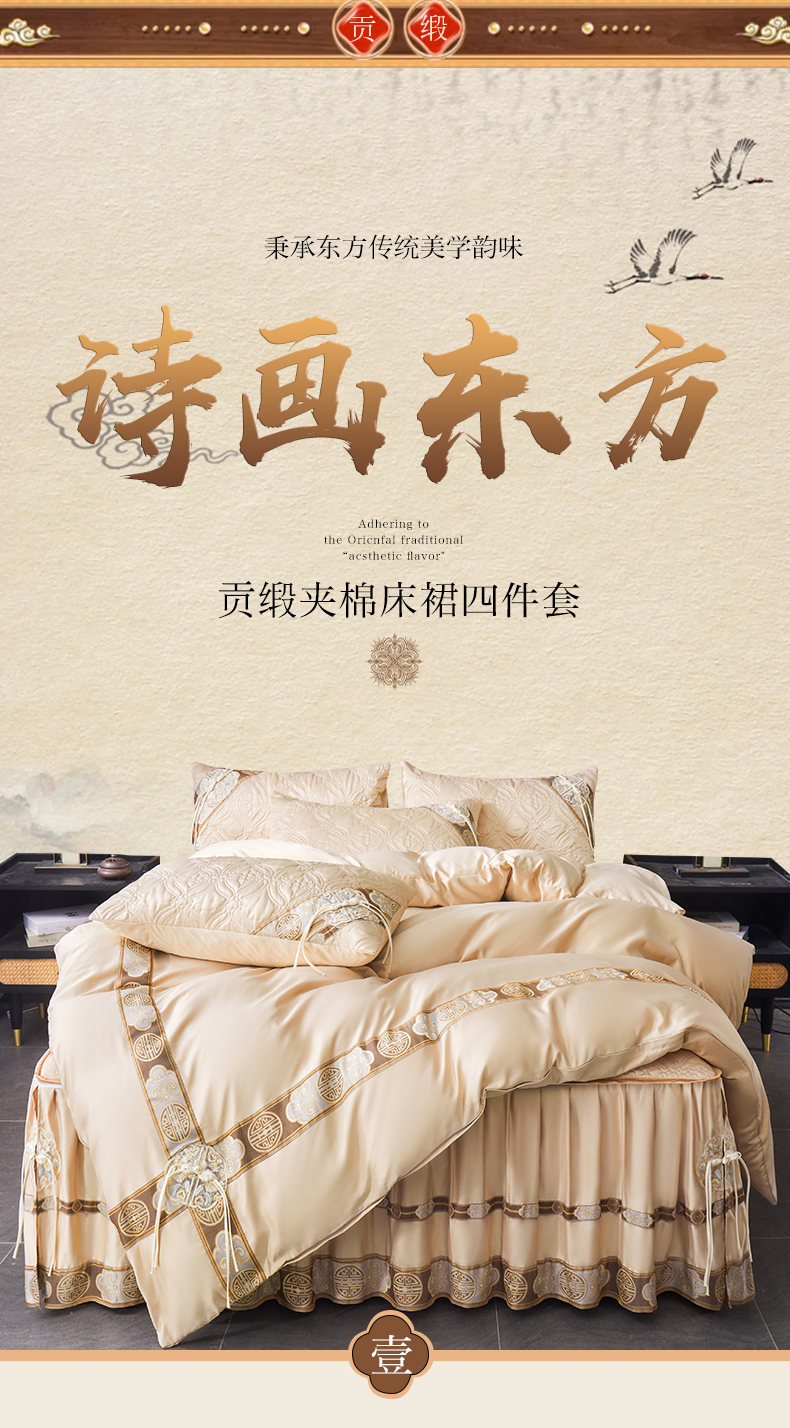 当前位置: 91家纺网 > 商品网购 > 床品套件 > 四件套 > 全棉普通四件套 > 罗艺轩 2024新款贡缎夹棉中国风新中式系列床裙款四件套 中国风-香槟
