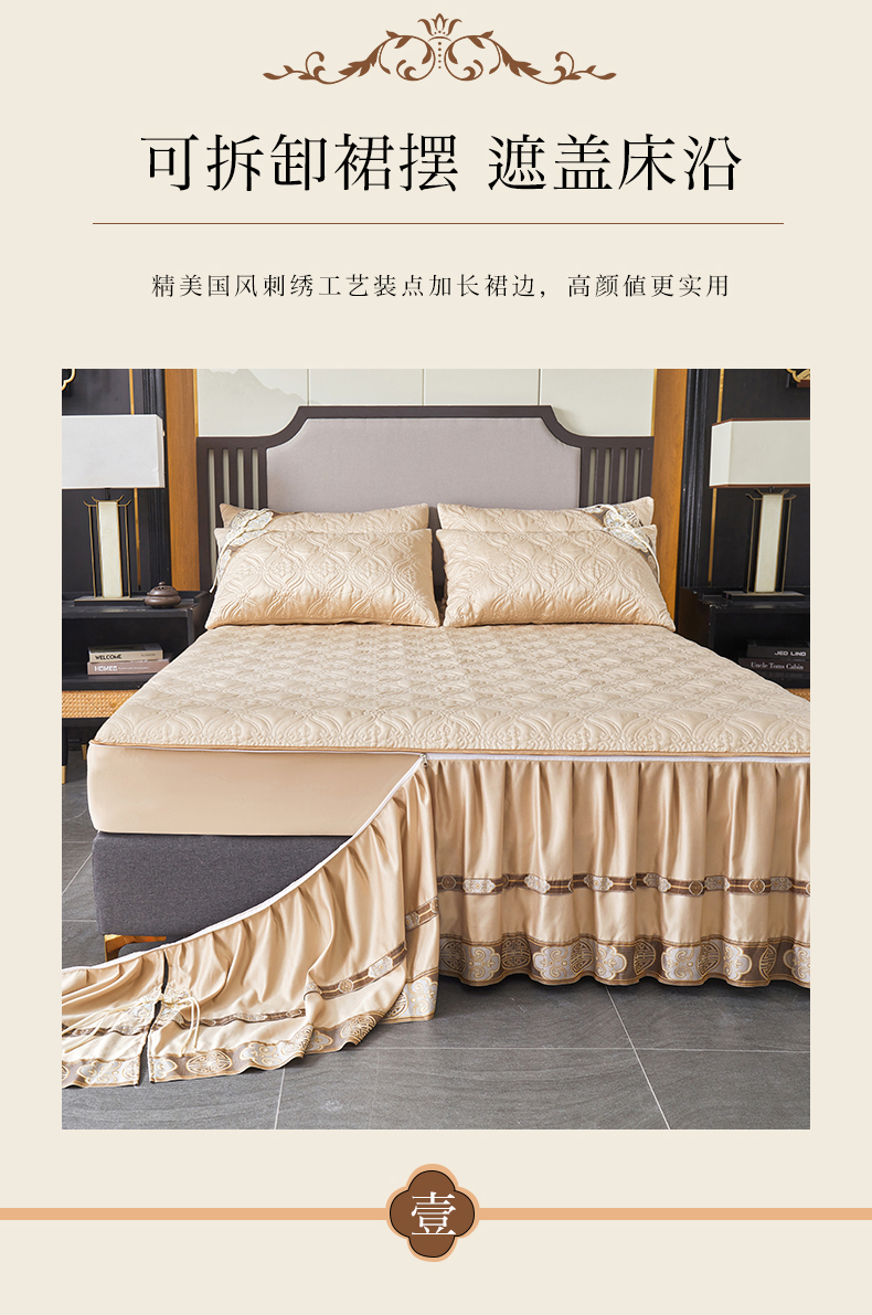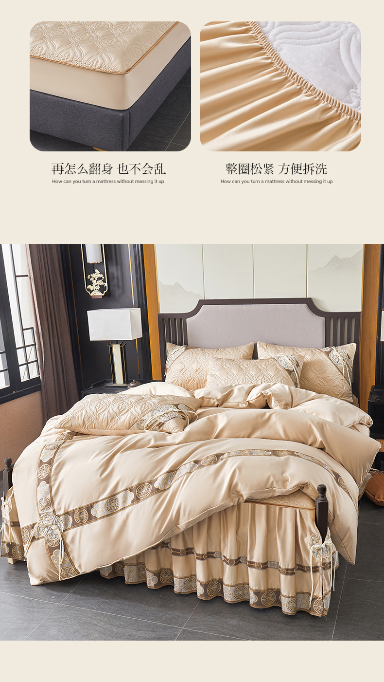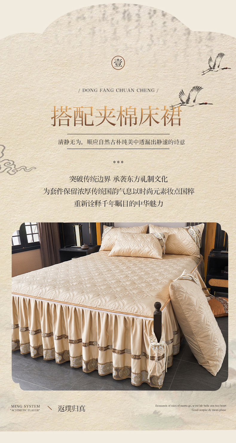 当前位置: 91家纺网 > 商品网购 > 床品套件 > 四件套 > 全棉普通四件套 > 罗艺轩 2024新款贡缎夹棉中国风新中式系列床裙款四件套 中国风-香槟