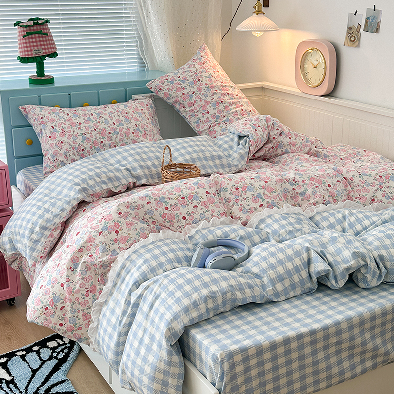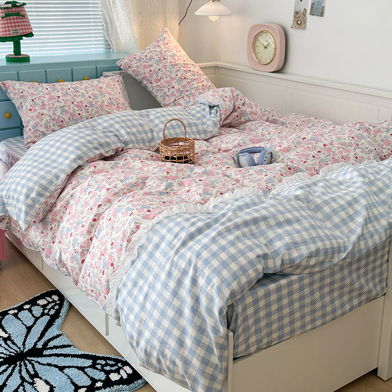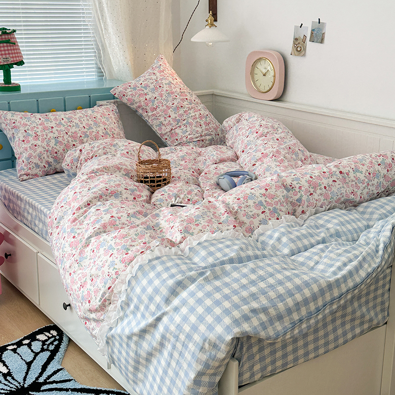 商品名称:昔可家纺 2024新款时尚拼接雪纺边全棉四件套 花园小兔