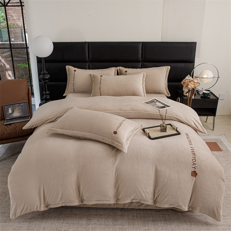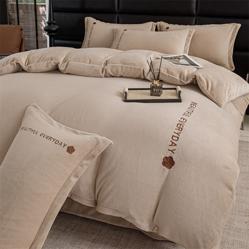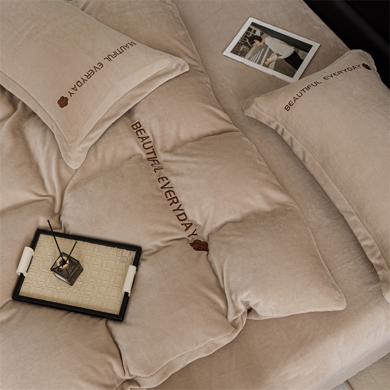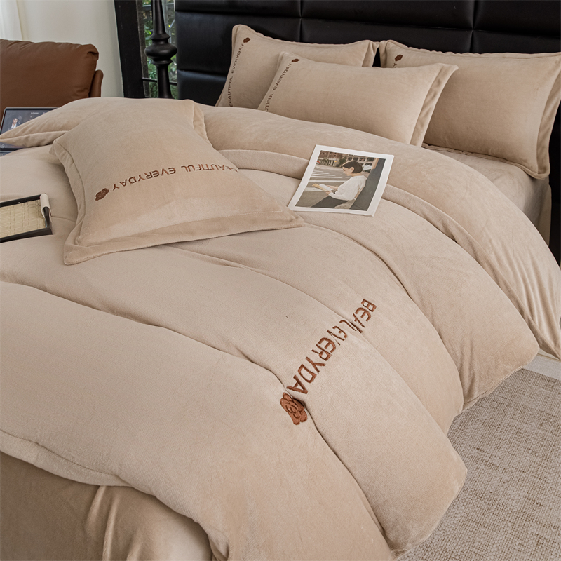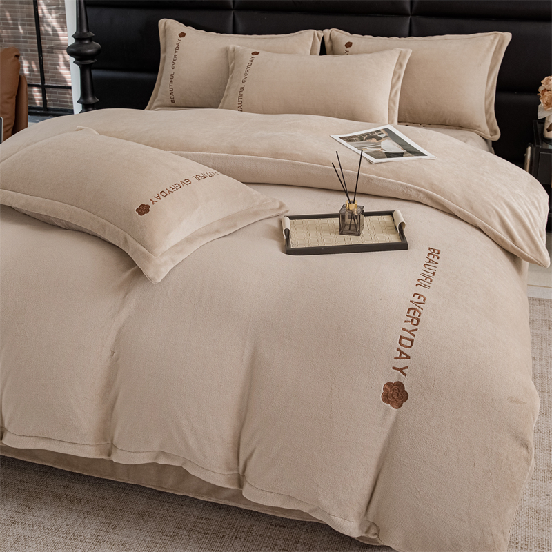 神州川 2024直播爆款高克重保暖加厚纯色刺绣牛奶绒四件套-邂逅-卡其