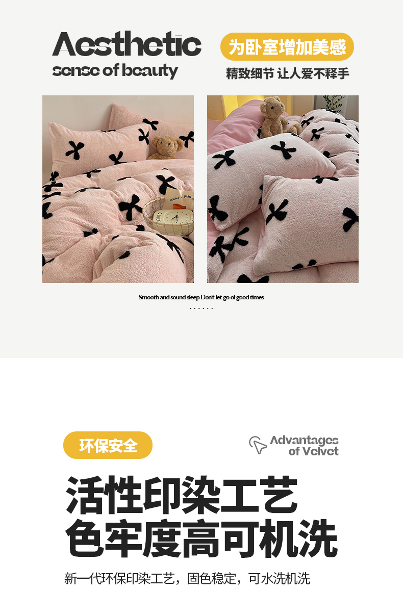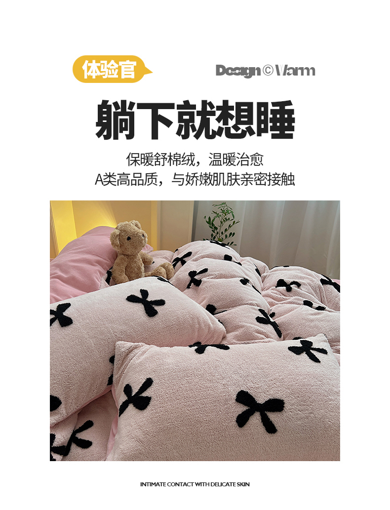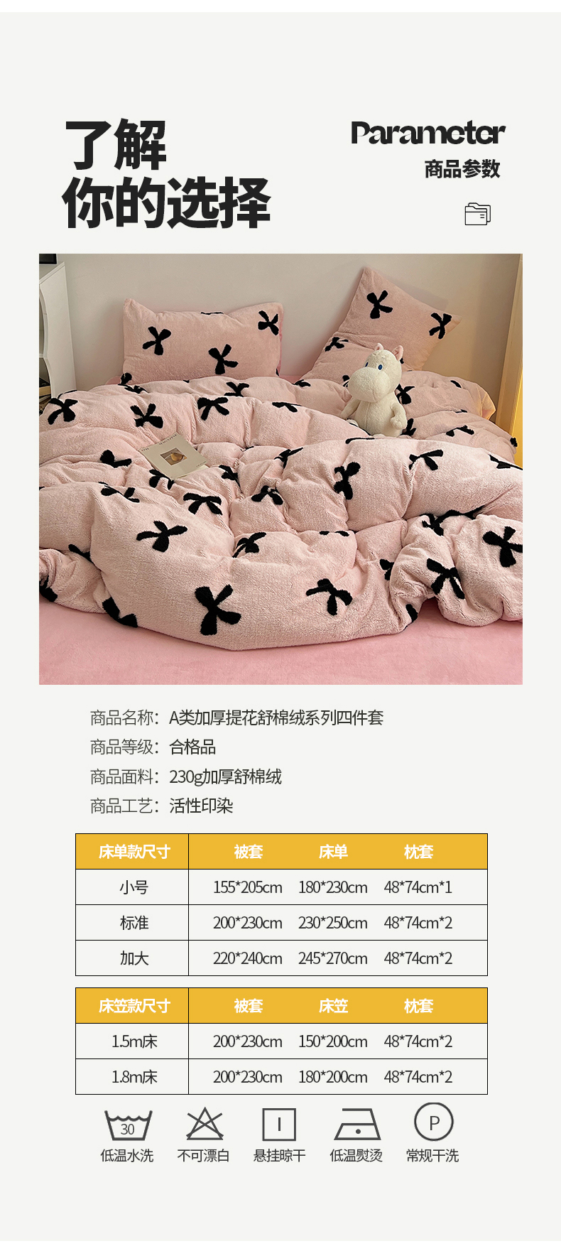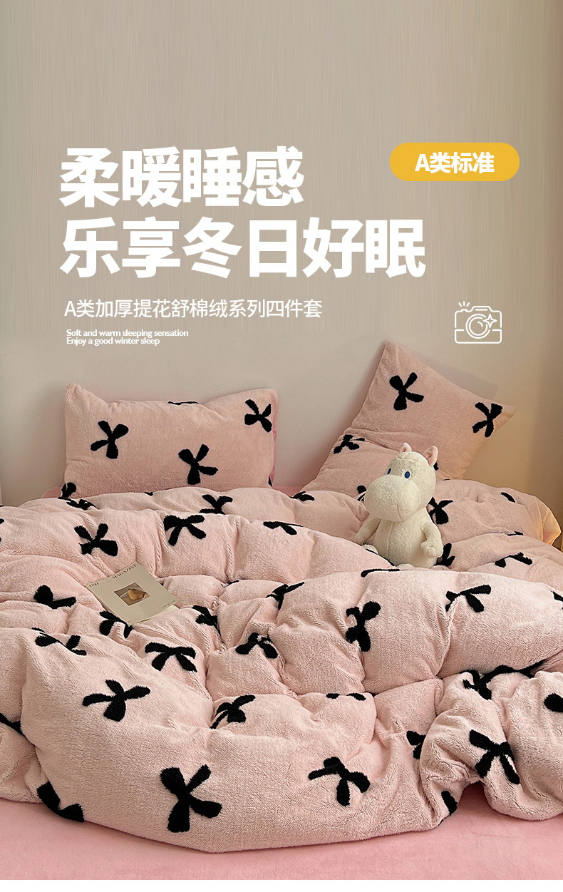 当前位置: 91家纺网 > 商品网购 > 床品套件 > 四件套 > 牛奶绒四件套 > 2024新款A类加厚色纱舒舒绒提花蝴蝶结爱心少女舒棉绒牛奶绒系列四件套 舒棉绒提花-粉梦蝴蝶结