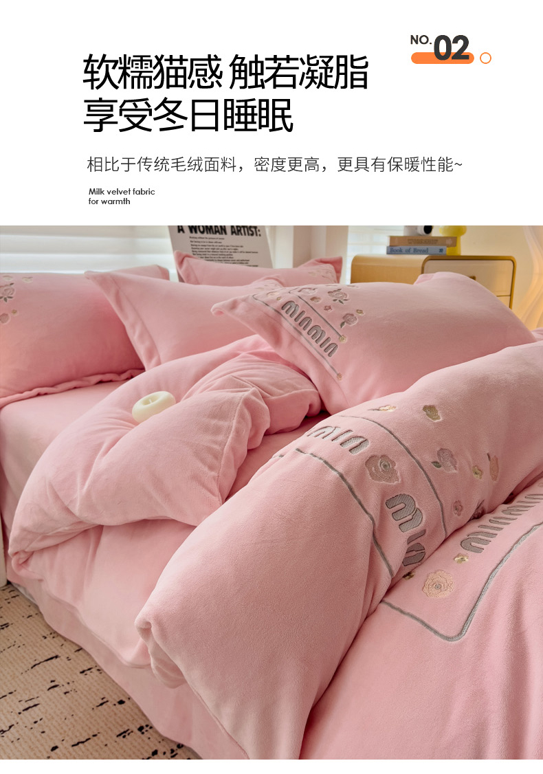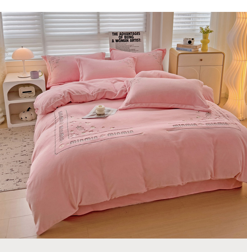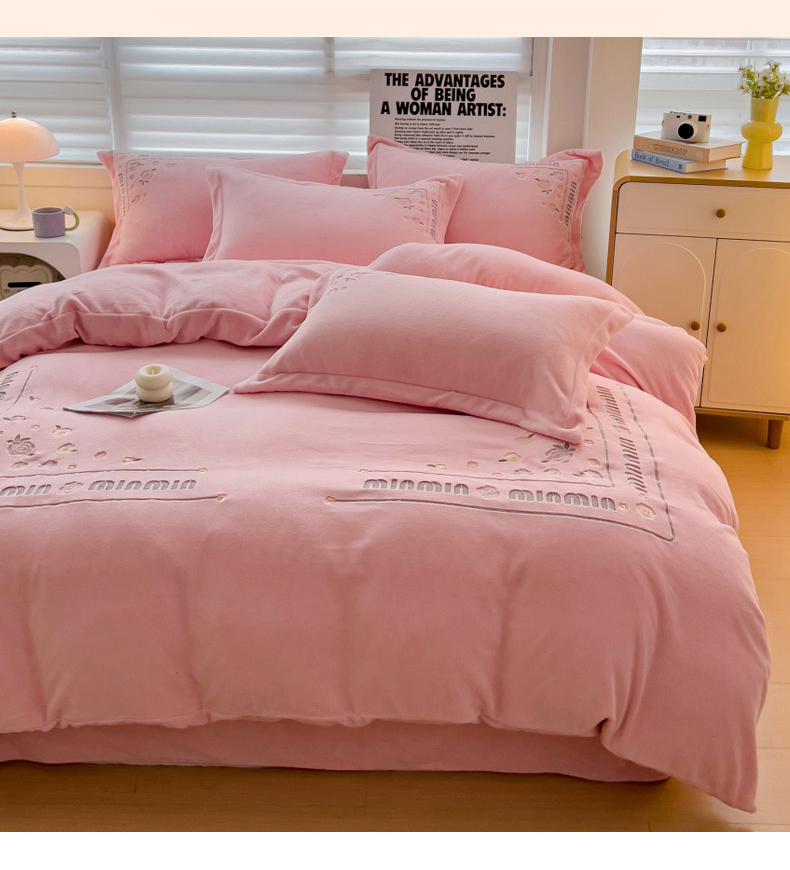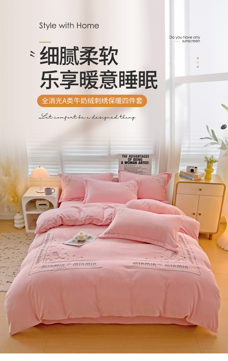 (总)星尚家纺 2024新款全消光230g牛奶绒刺绣保暖四件套-花漾,晨雾绿,豆沙粉,樱花粉