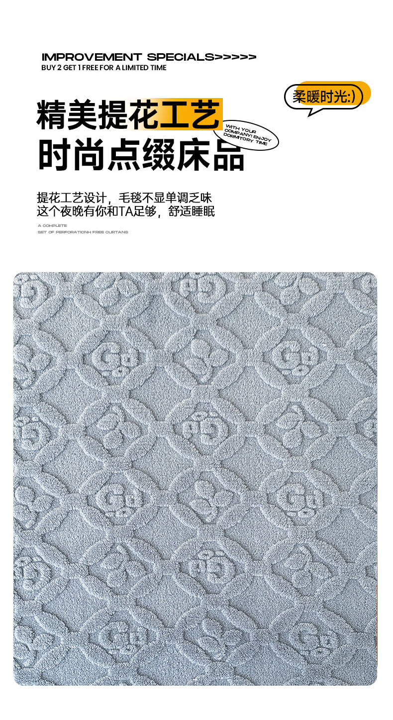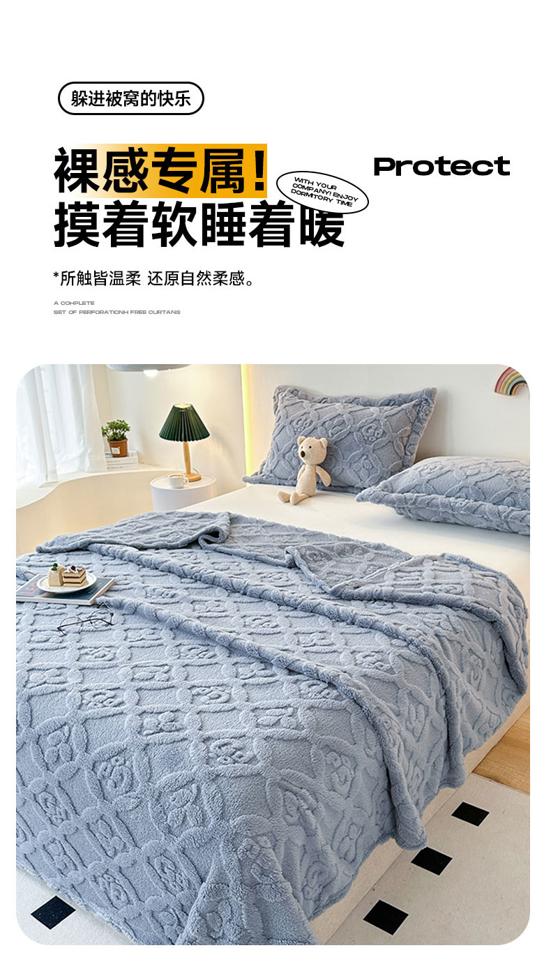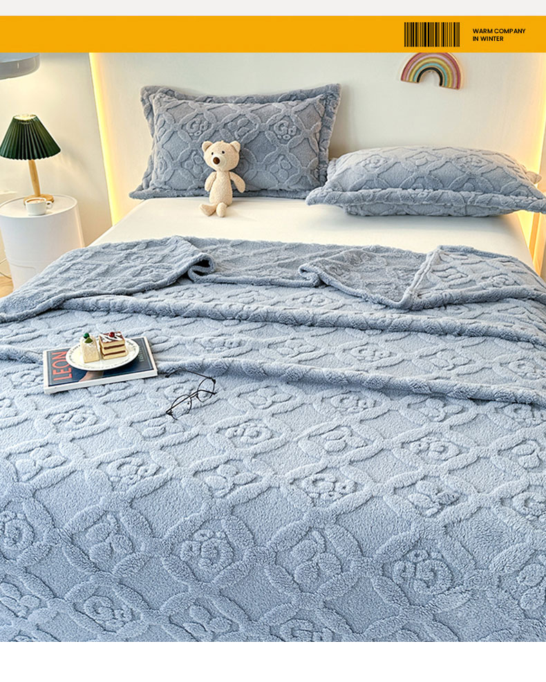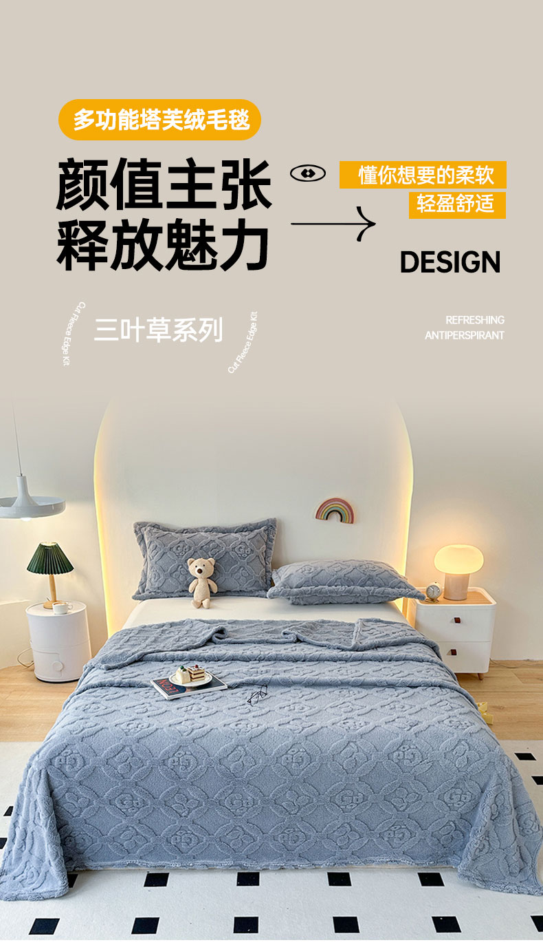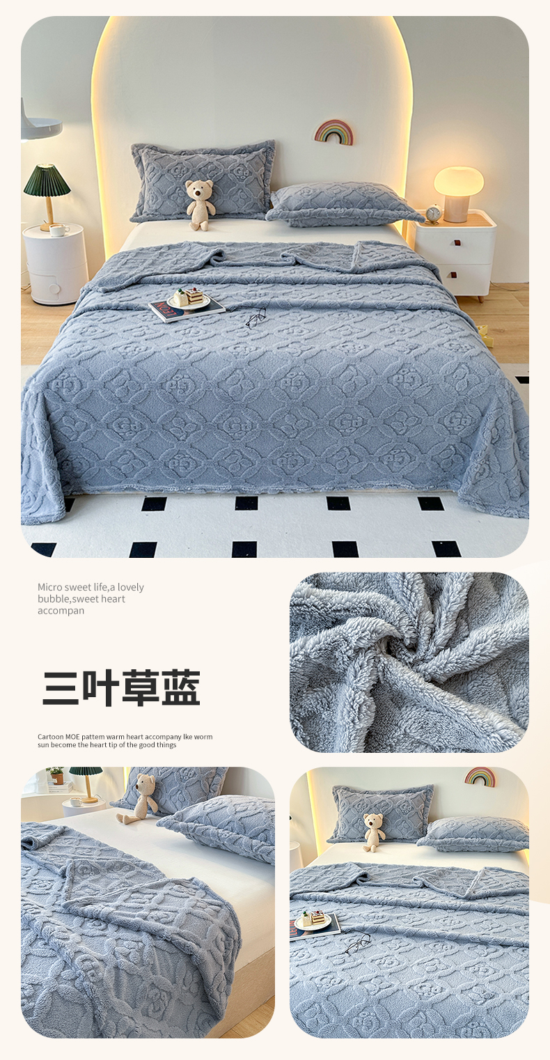 商品名称:悦织湾家纺 2025直播爆款外贸出口跨境热销款三叶草塔芙绒毛毯 三叶草蓝