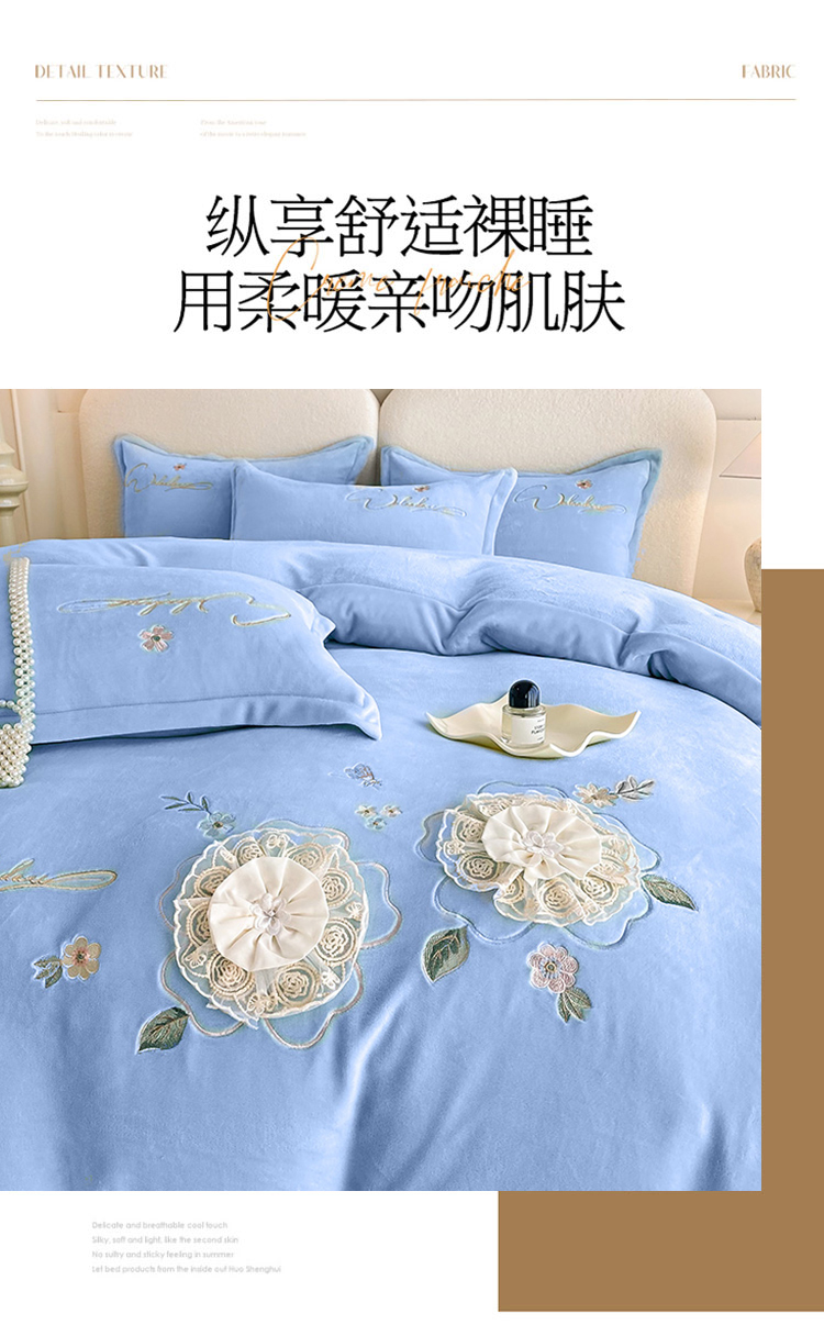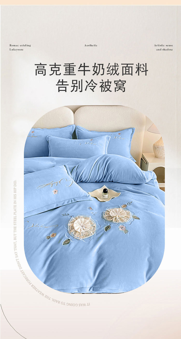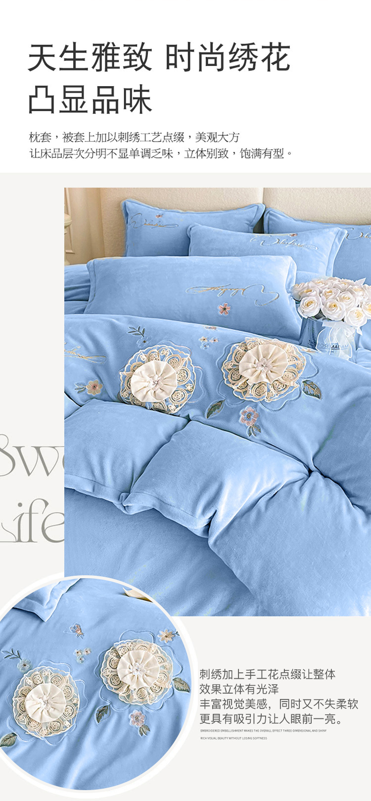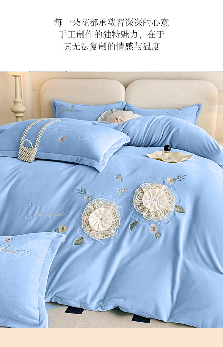 商品名称:孟鑫家纺 2025新款加厚牛奶绒手工花绣花四件套莱茵花园系列 莱茵花园-天蓝
