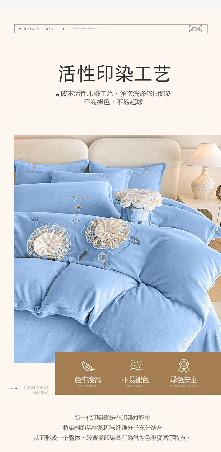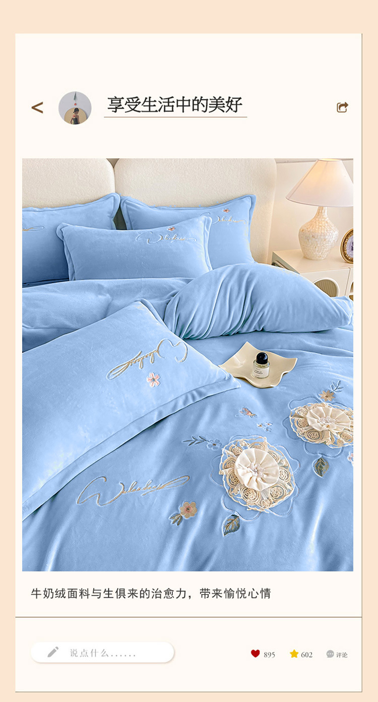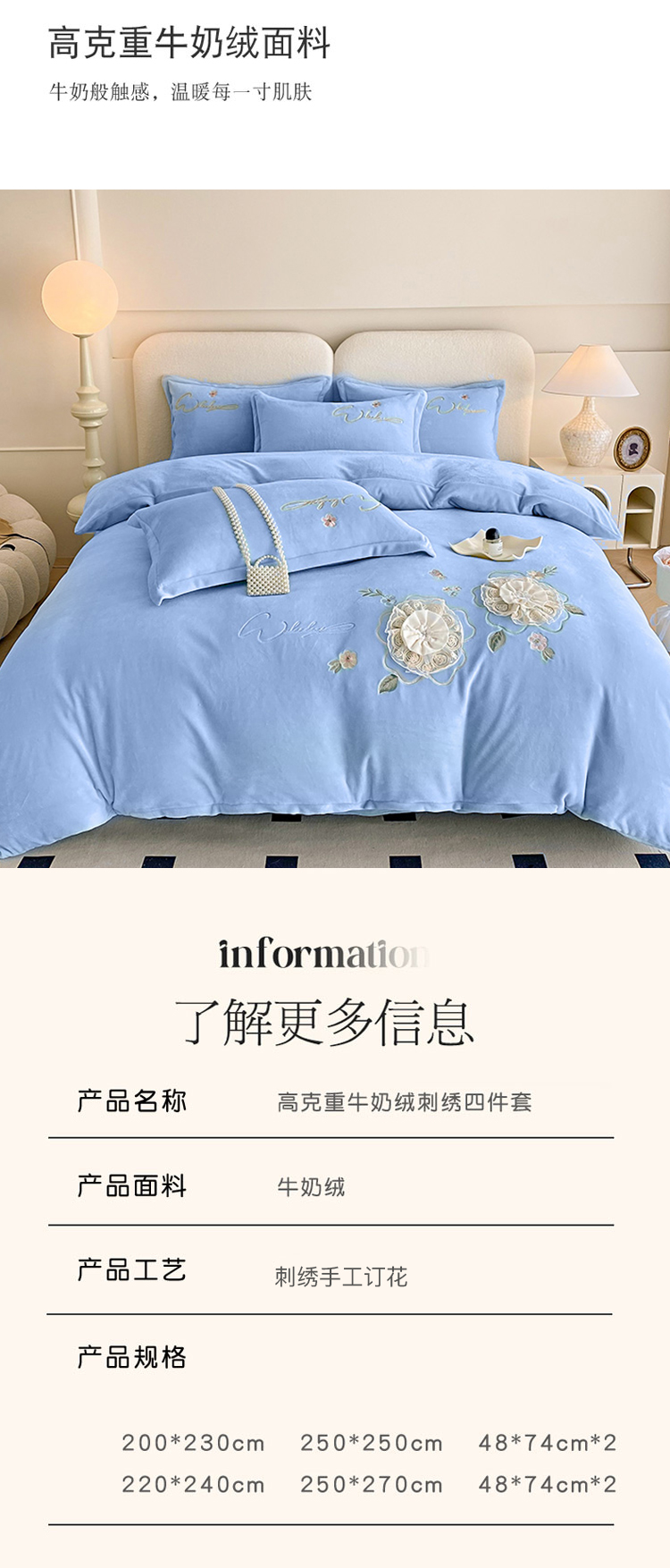 商品名称:孟鑫家纺 2025新款加厚牛奶绒手工花绣花四件套莱茵花园系列 莱茵花园-天蓝