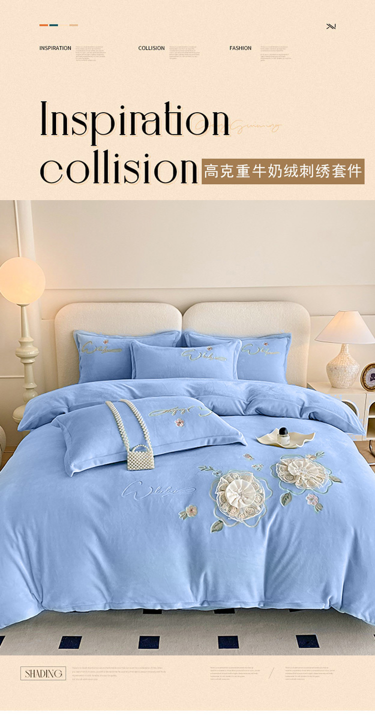 孟鑫家纺 2025新款加厚牛奶绒手工花绣花四件套莱茵花园系列 莱茵花园-天蓝