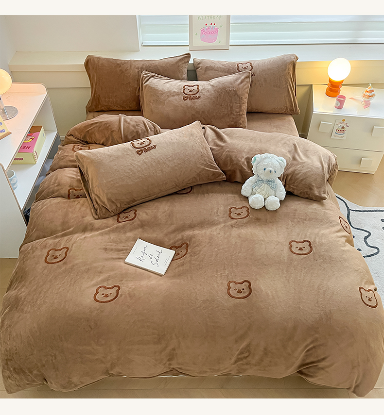 商品名称:雅居纺家纺 2024新款高克重牛奶绒毛巾绣四件套 小熊-咖