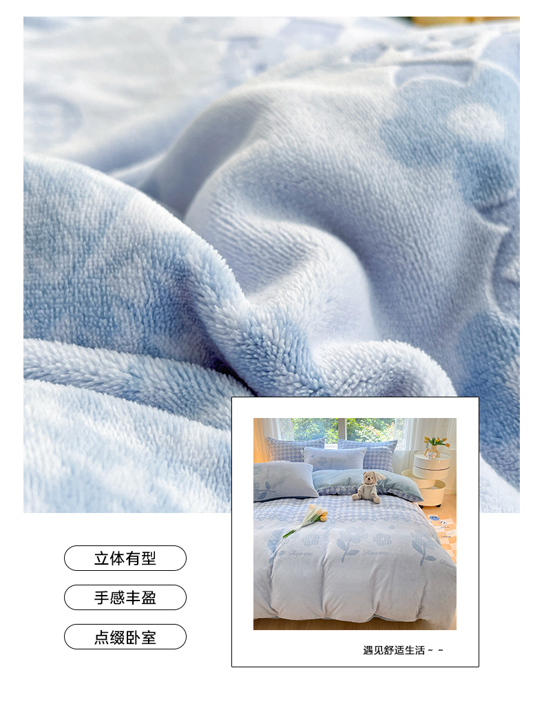 商品名称:雅居纺家纺 2024新款立体雕花牛奶绒四件套-幸运花系列 幸运花-蓝