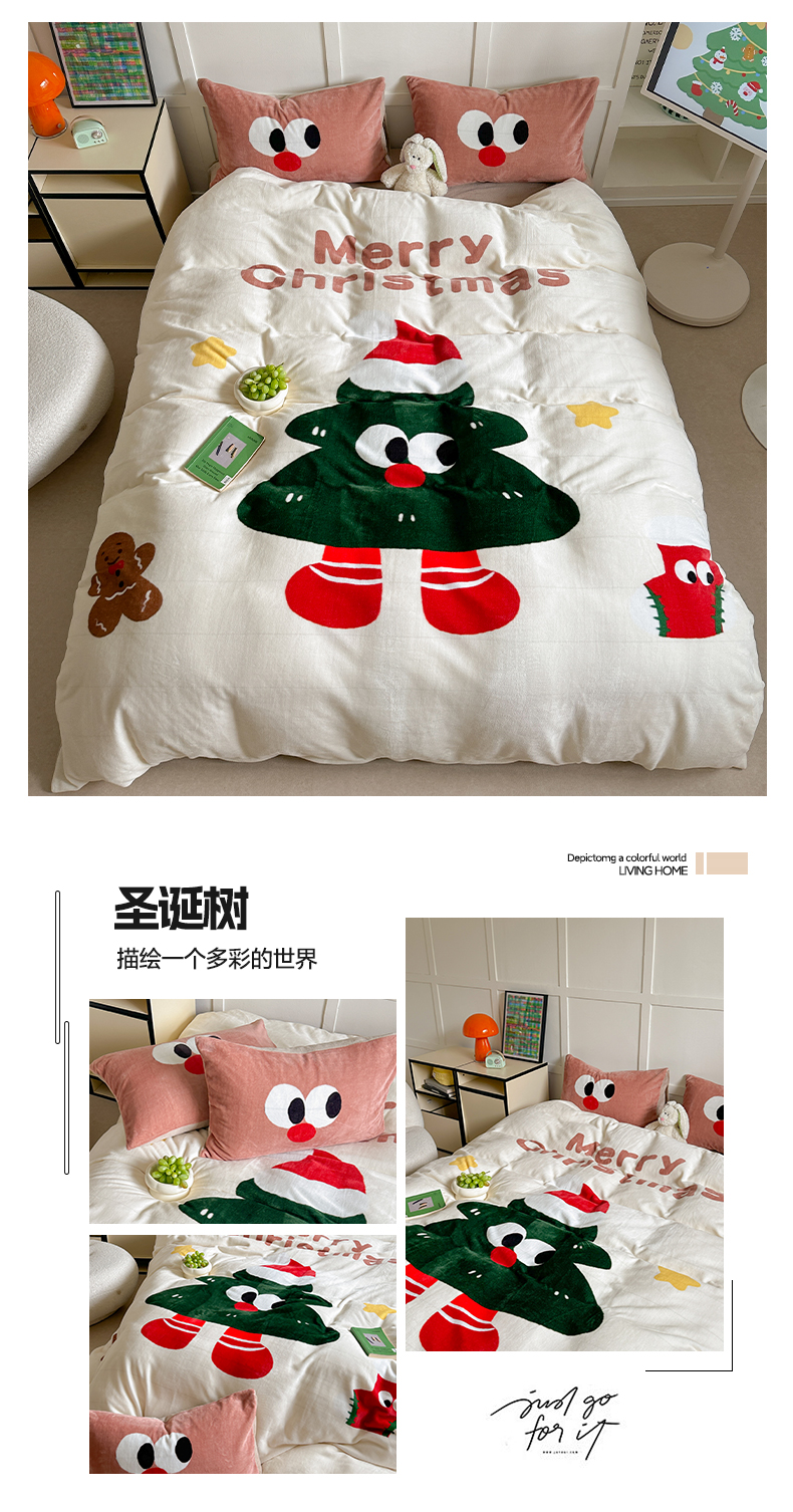 美乐迪家纺 2024新款高克重牛奶绒卡通印花四件套 圣诞树