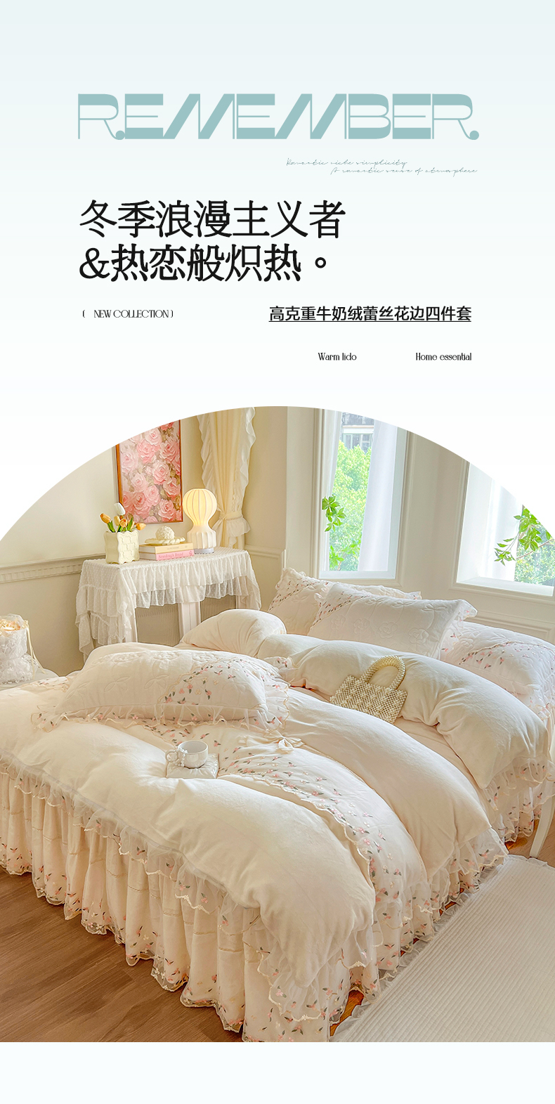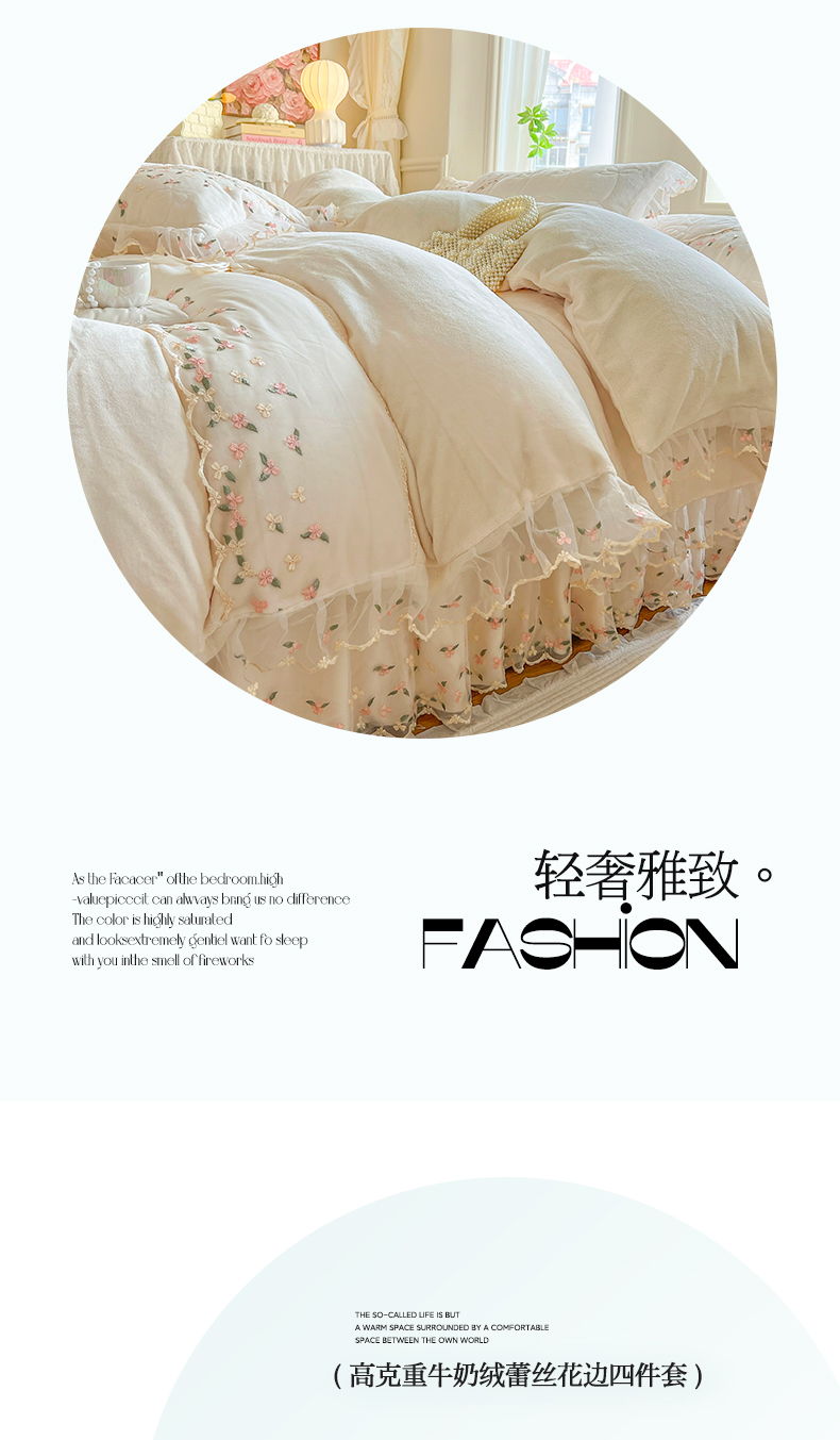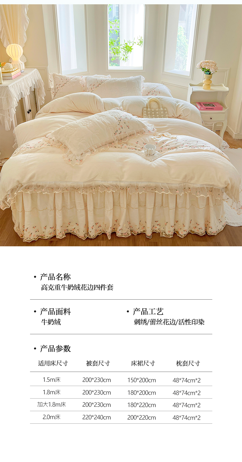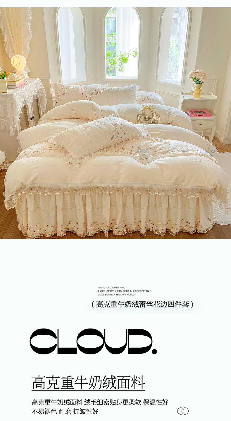当前位置: 91家纺网 > 商品网购 > 床品套件 > 四件套 > 牛奶绒四件套 > 网红馆(ck家纺) 2025新款加厚保暖高克重牛奶绒蕾丝花边床裙款恬星系列四件套 恬星-香草白