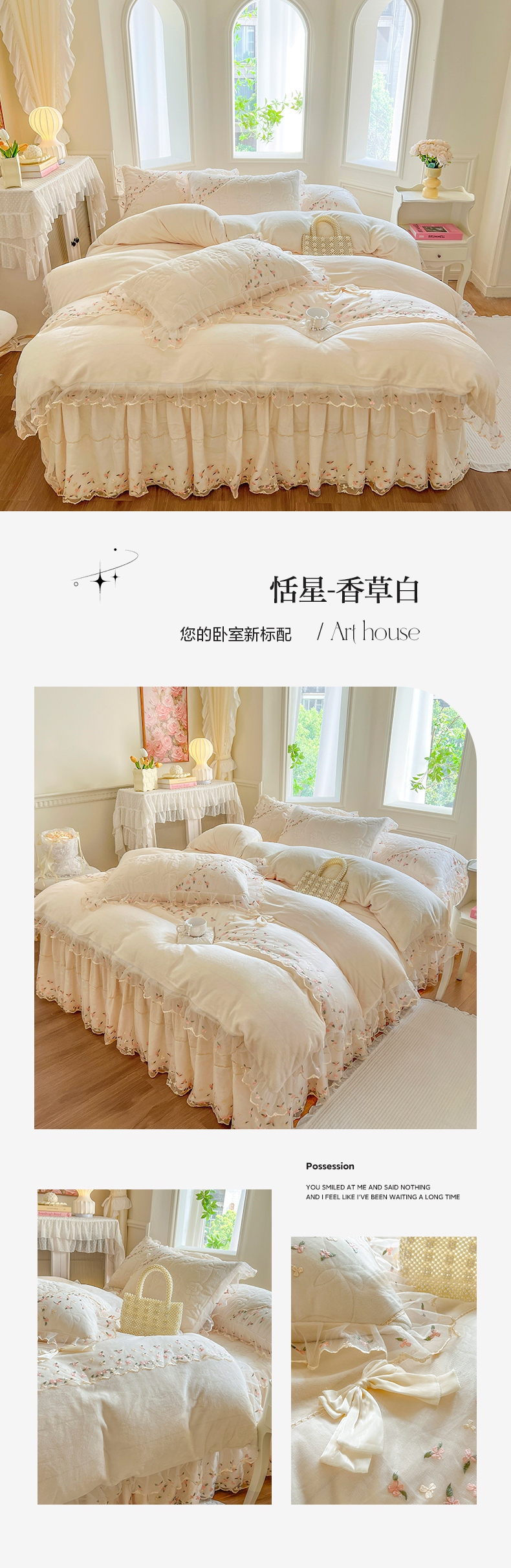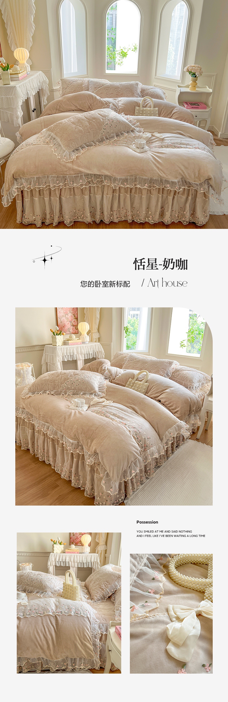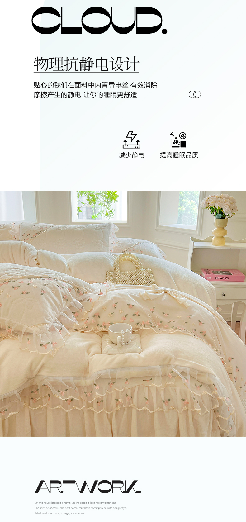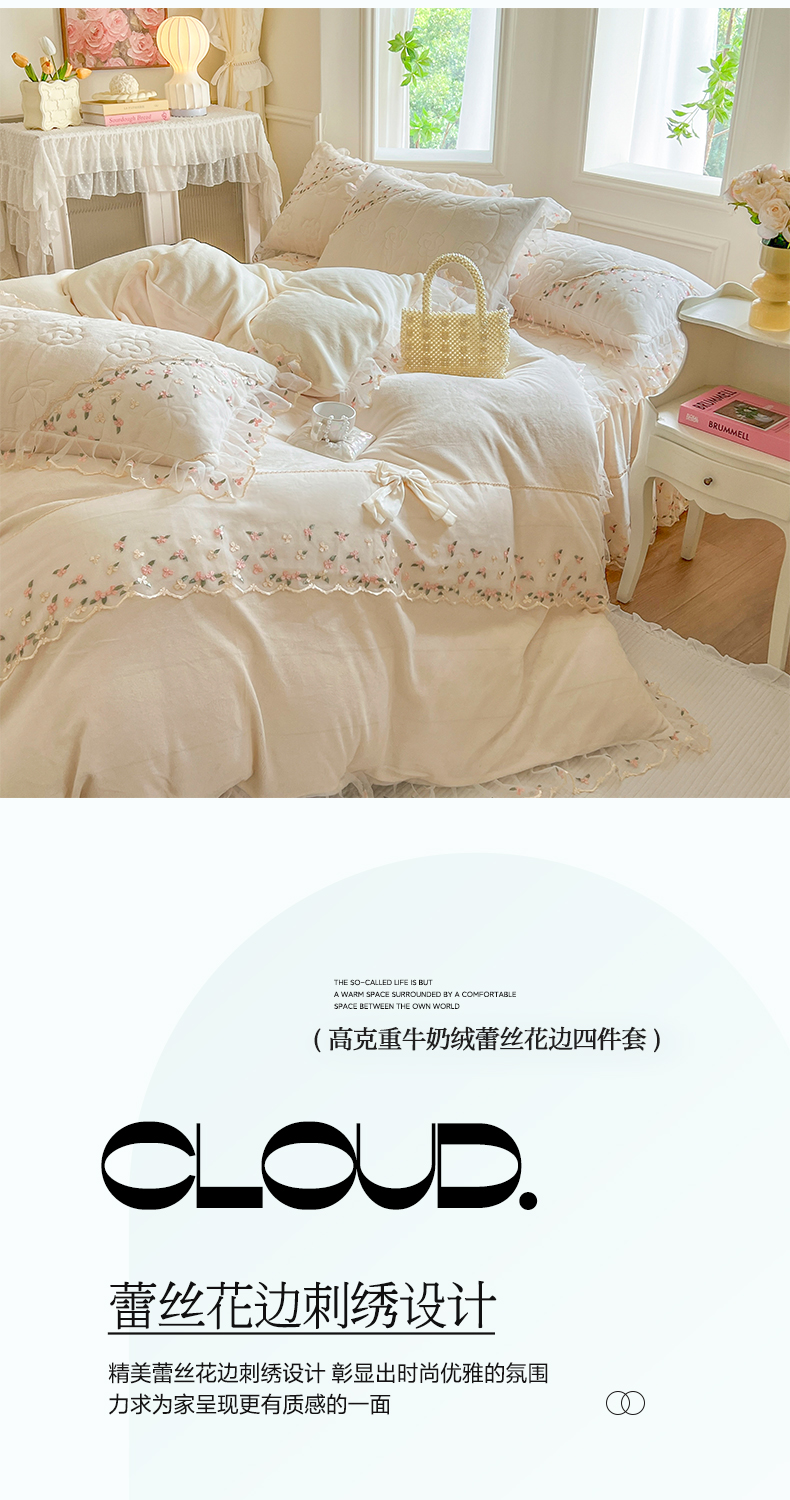当前位置: 91家纺网 > 商品网购 > 床品套件 > 四件套 > 牛奶绒四件套 > 网红馆(ck家纺) 2025新款加厚保暖高克重牛奶绒蕾丝花边床裙款恬星系列四件套 恬星-香草白