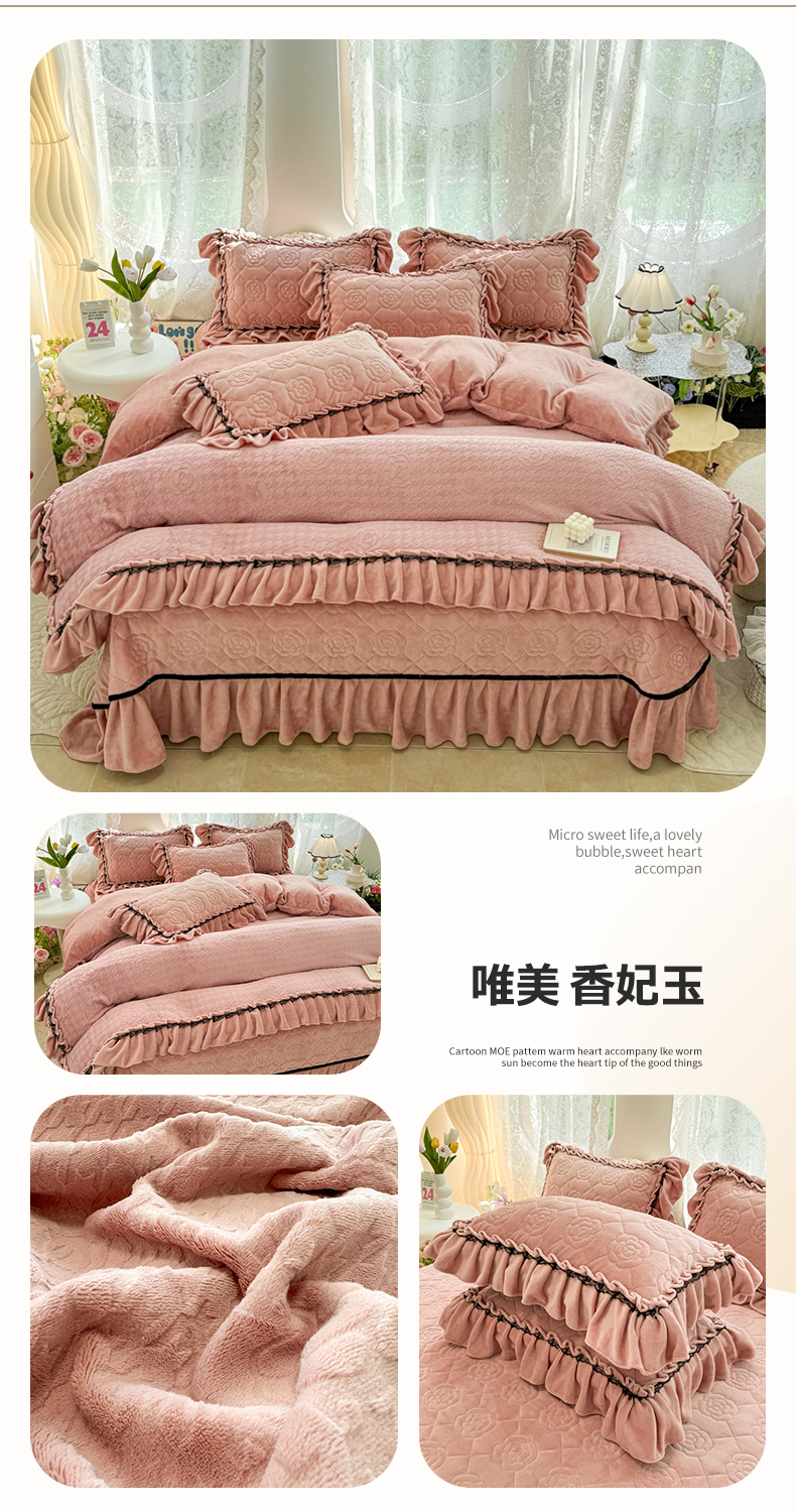 当前位置: 91家纺网 > 商品网购 > 床品套件 > 四件套 > 牛奶绒四件套 > 铠畅家纺 2025新款牛奶绒花边床盖四件套-唯美 唯美香妃玉