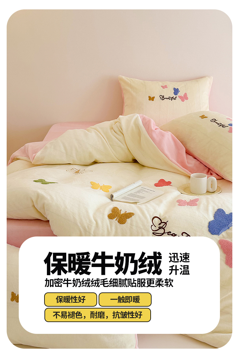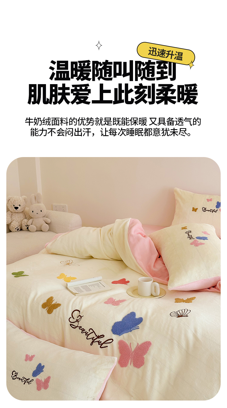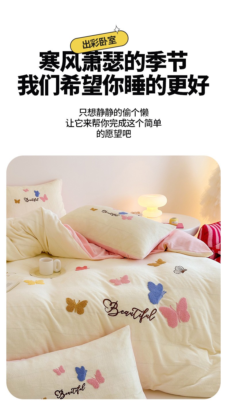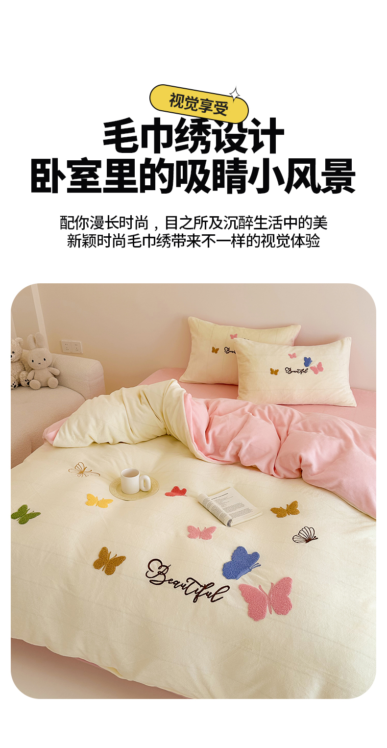 (总)沐棉 2024新款纯色牛奶绒毛巾绣款四件套,彩色蝴蝶,嘟嘟鱼,开心派对-咖,开心派对-兰,快乐圣诞-绿,快乐圣诞-米,熊猫-灰,熊猫-米