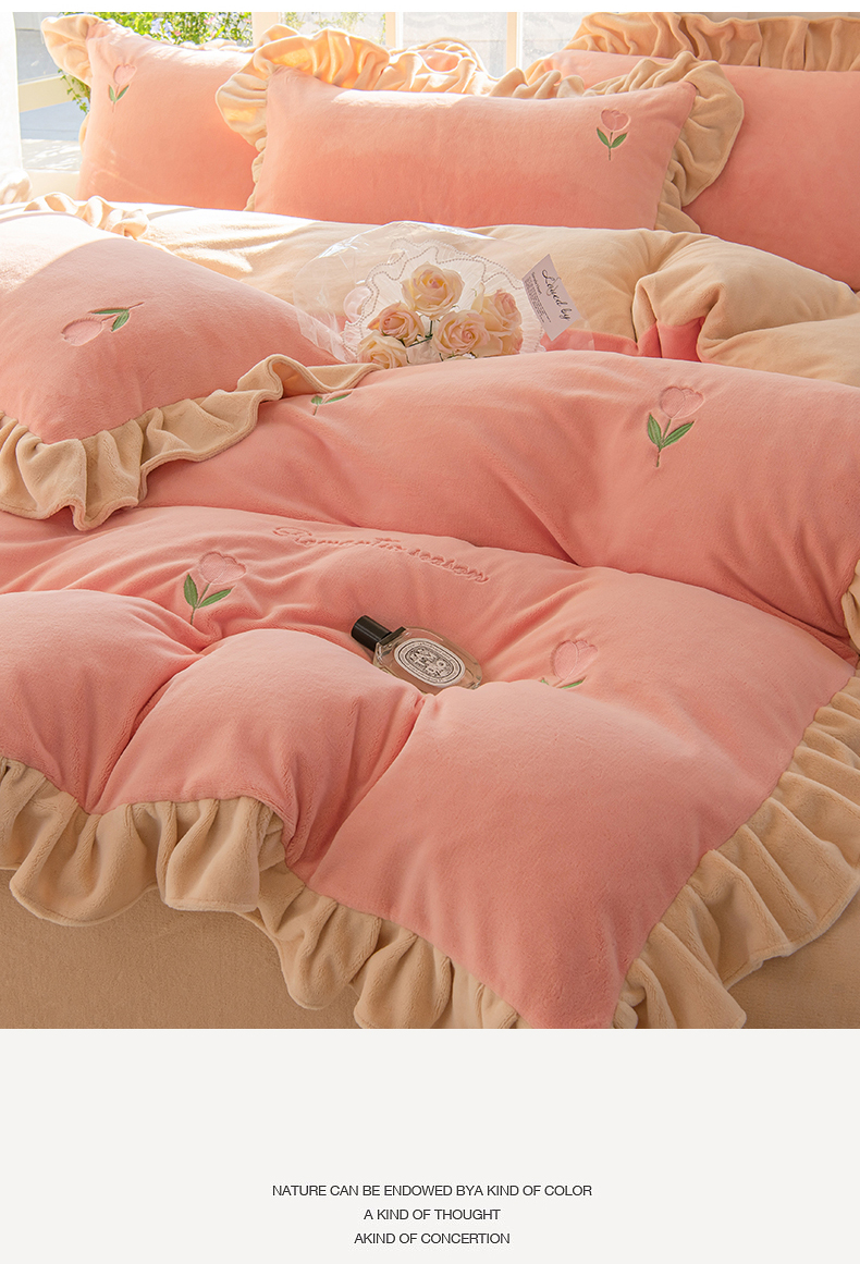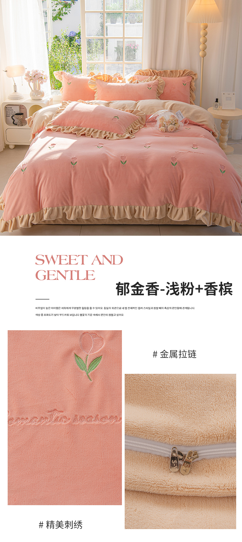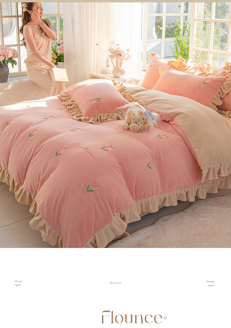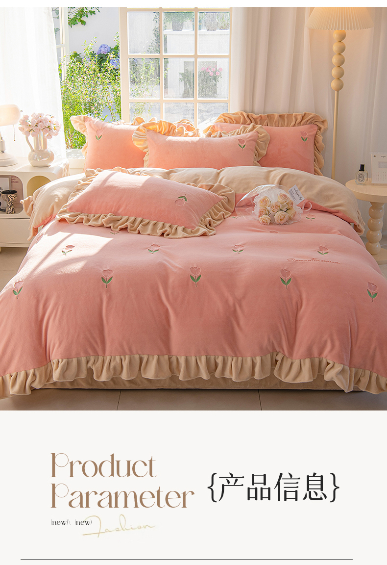 眷恋家纺 2024新款牛奶绒花边郁金香花卉刺绣四件套 郁金香-浅粉+香槟