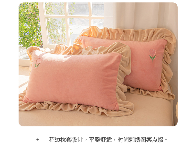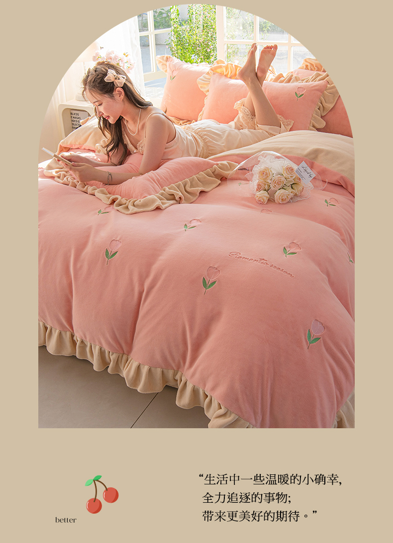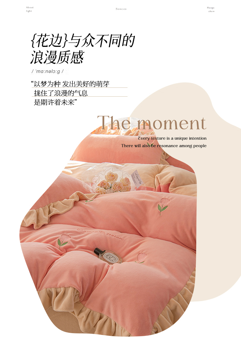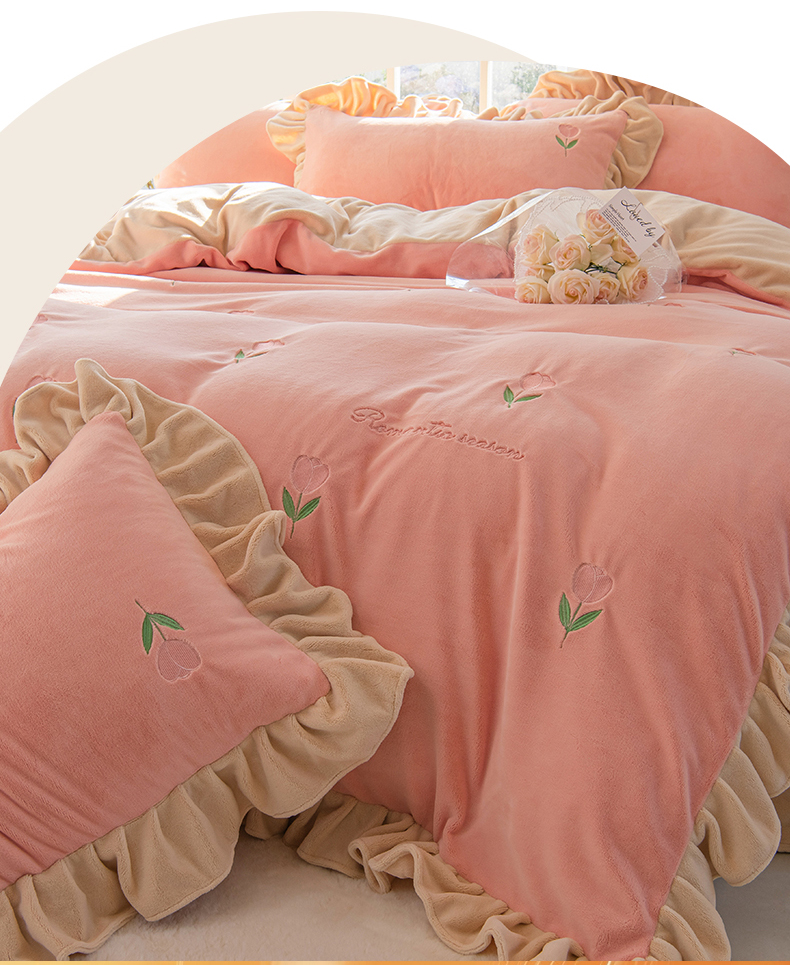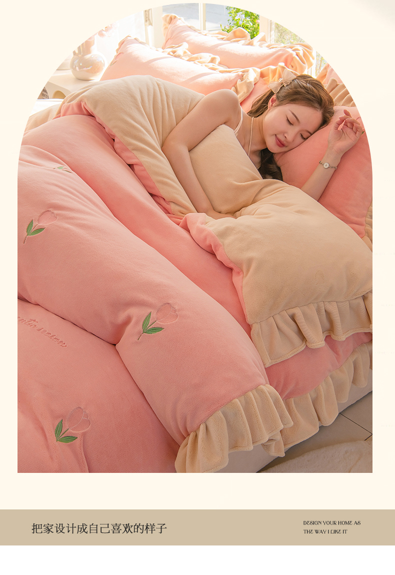 眷恋家纺 2024新款牛奶绒花边郁金香花卉刺绣四件套 郁金香-浅粉+香槟