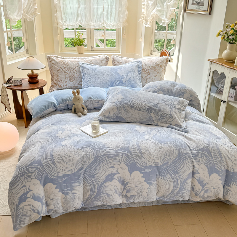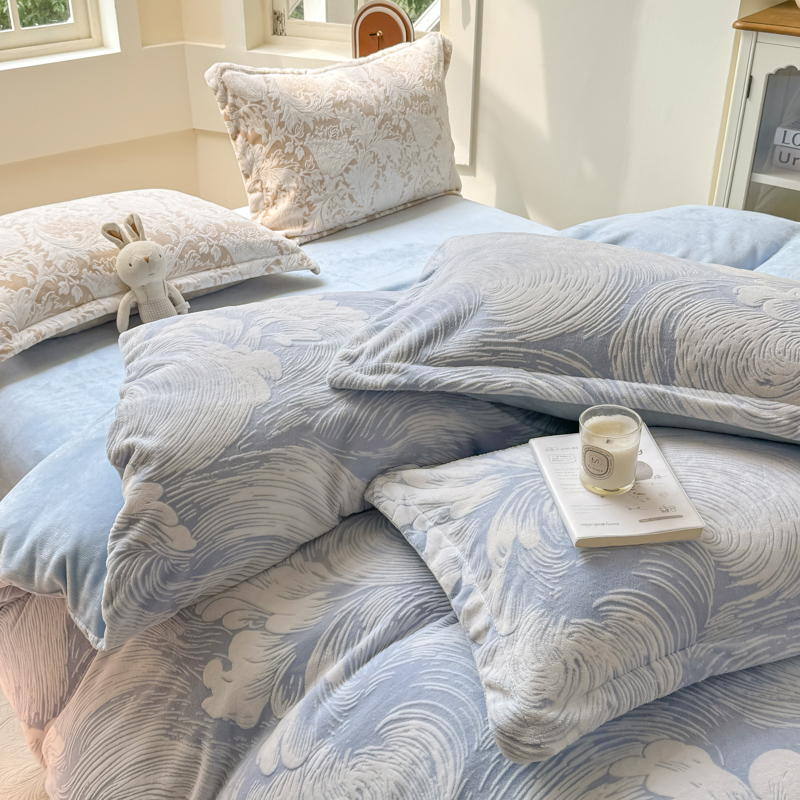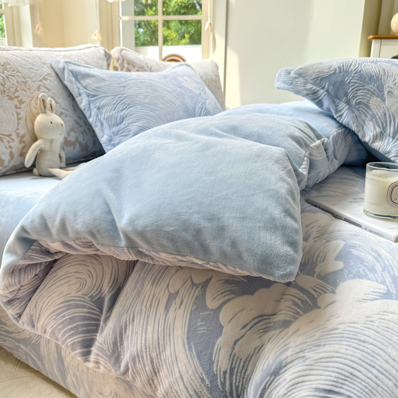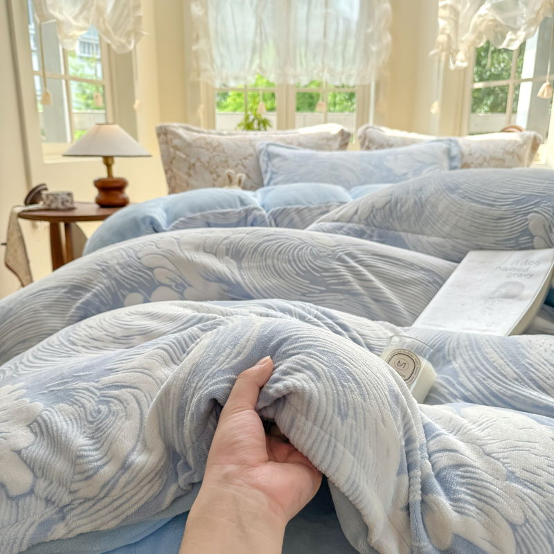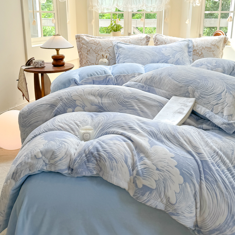 梦莱斯 2024新款雕花牛奶绒四件套 浪花-天空蓝