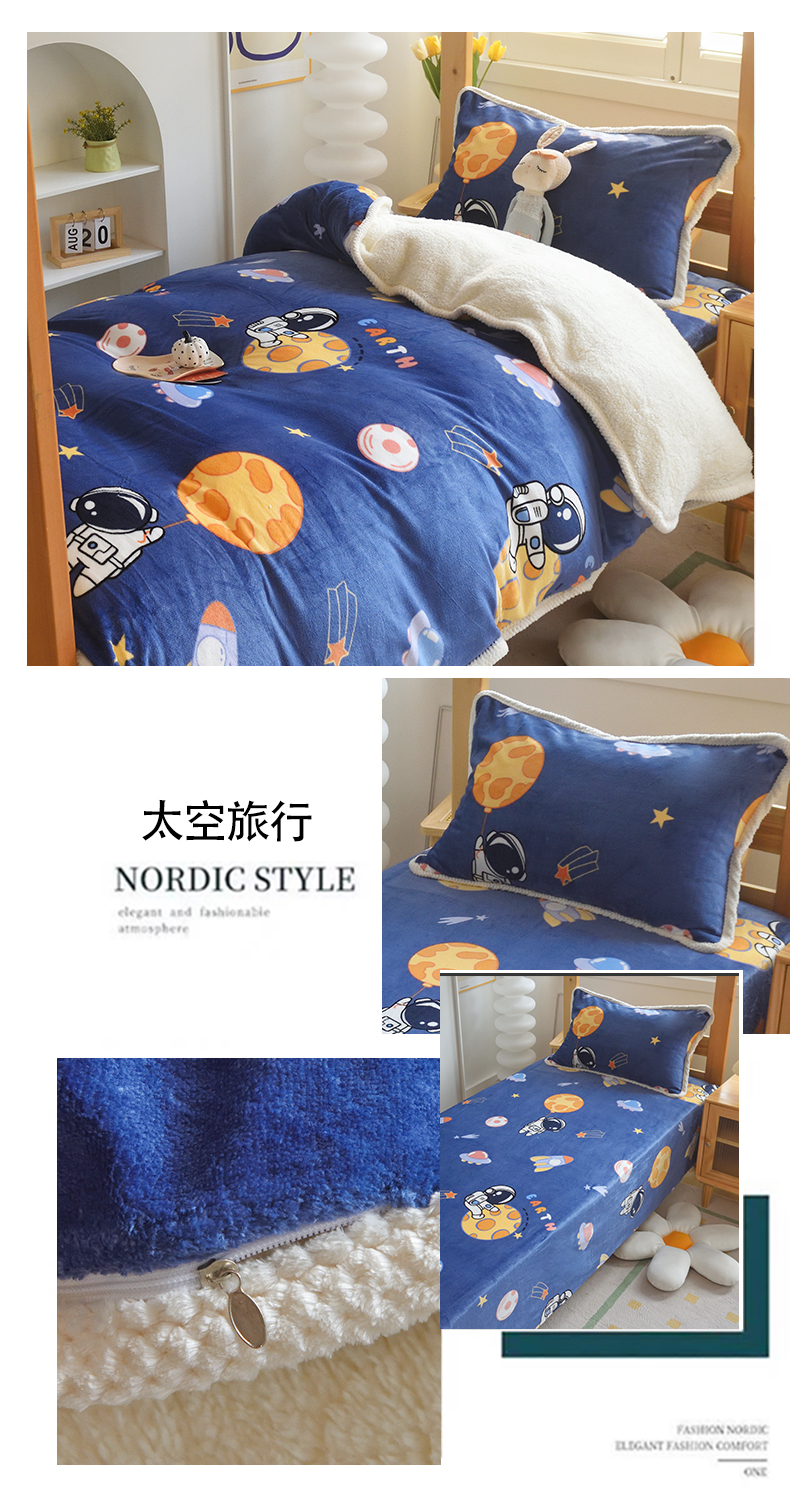当前位置: 91家纺网 > 商品网购 > 床品套件 > 三件套 > 多乐家纺 2024新款学生宿舍牛奶绒羊羔绒三件套 太空旅行