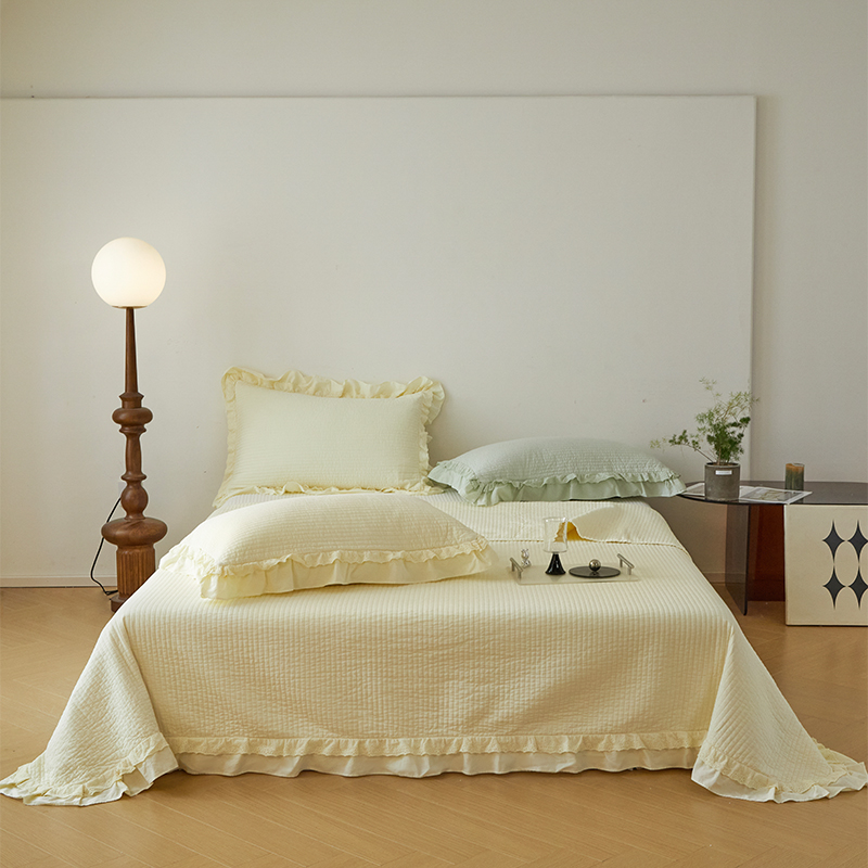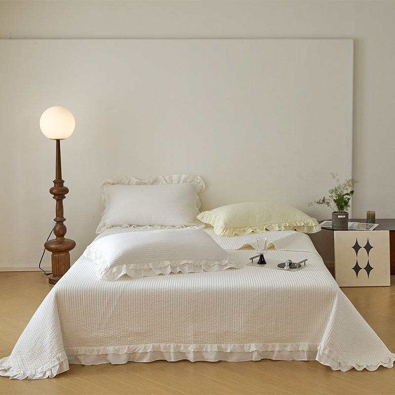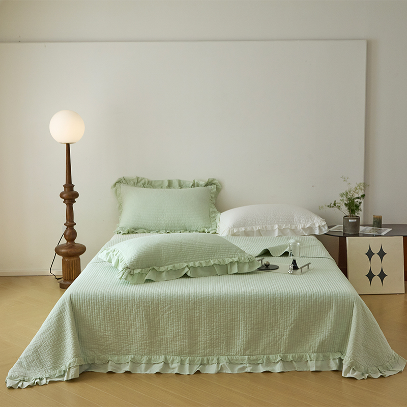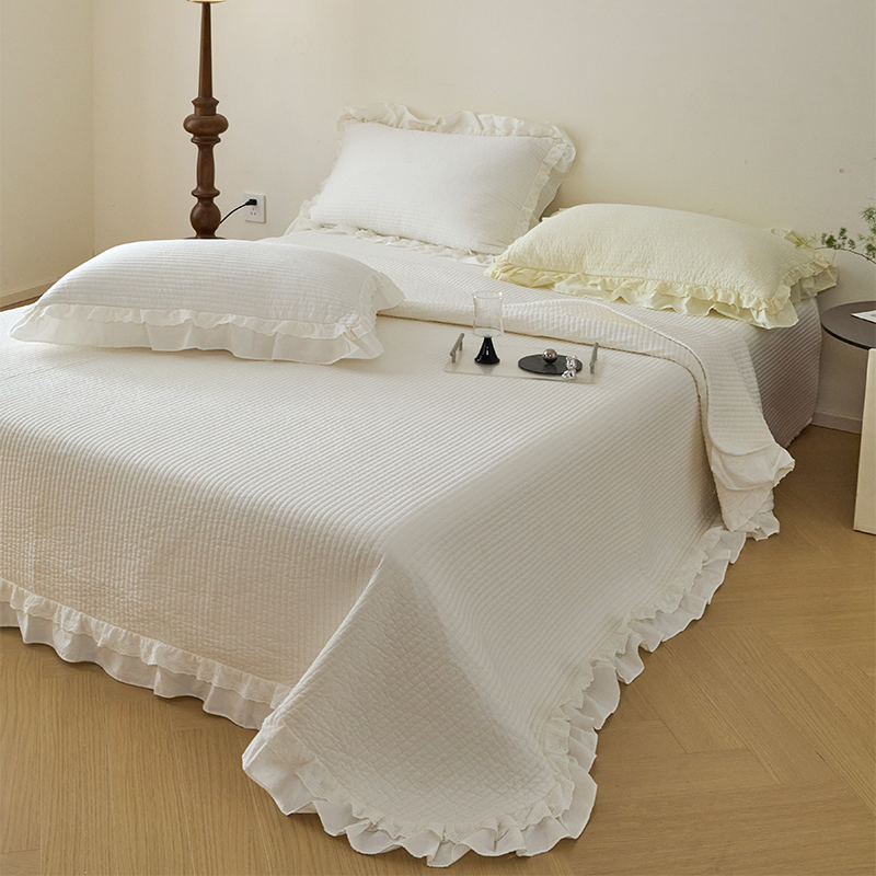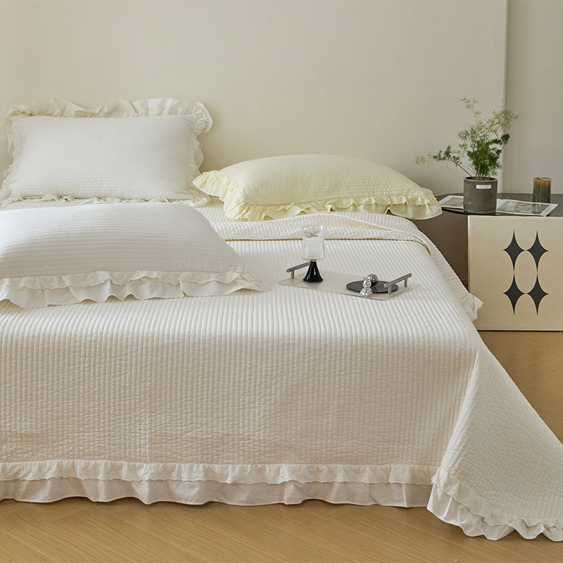 (总)期遇家居 2024新款出口韩国砂洗工艺床盖直条花边床盖纯棉三件套,流光白,琉璃黄,麦芽绿,燕麦咖