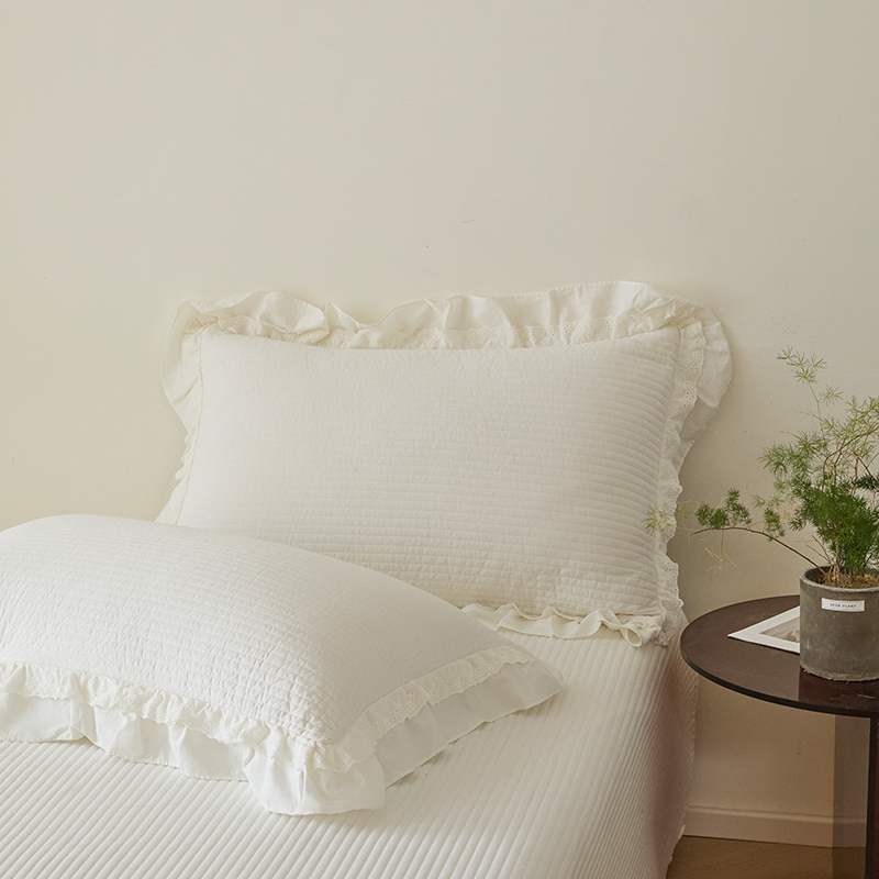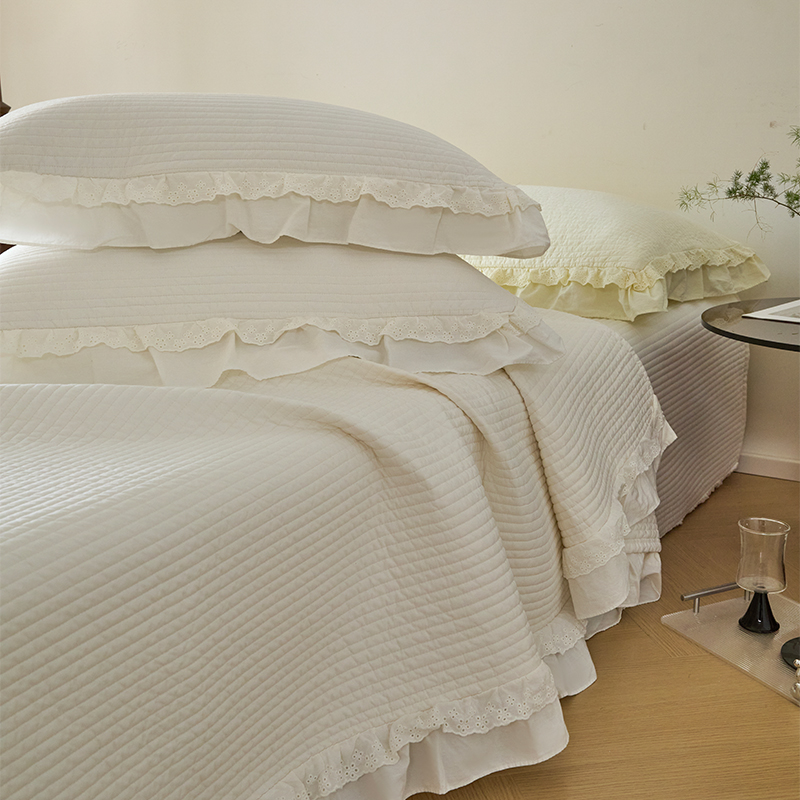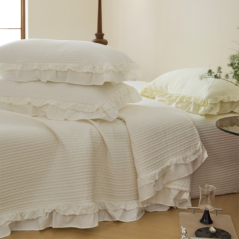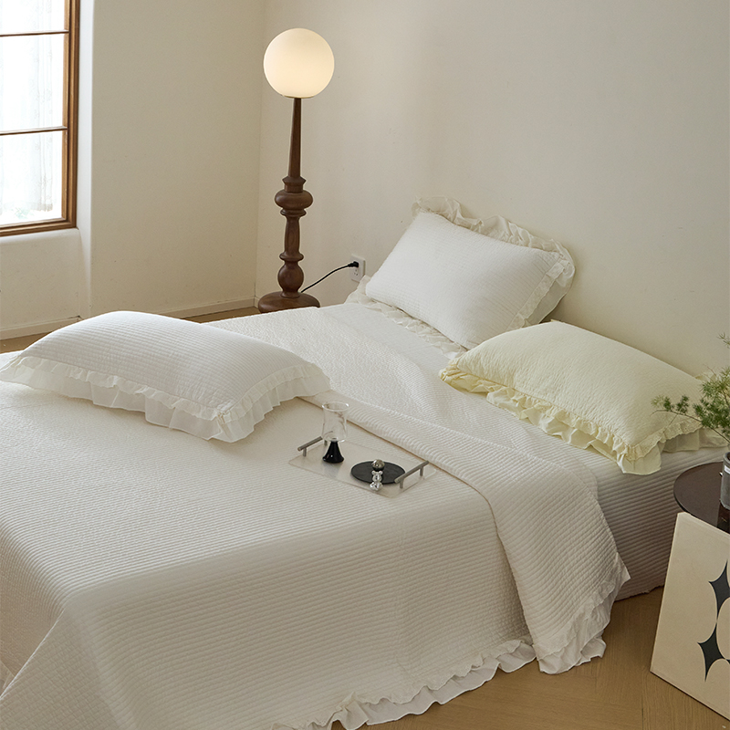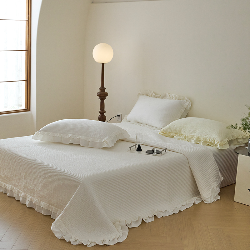 (总)期遇家居 2024新款出口韩国砂洗工艺床盖直条花边床盖纯棉三件套,流光白,琉璃黄,麦芽绿,燕麦咖