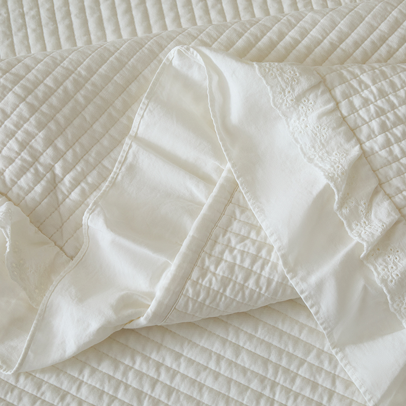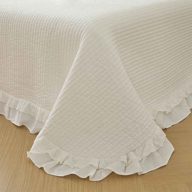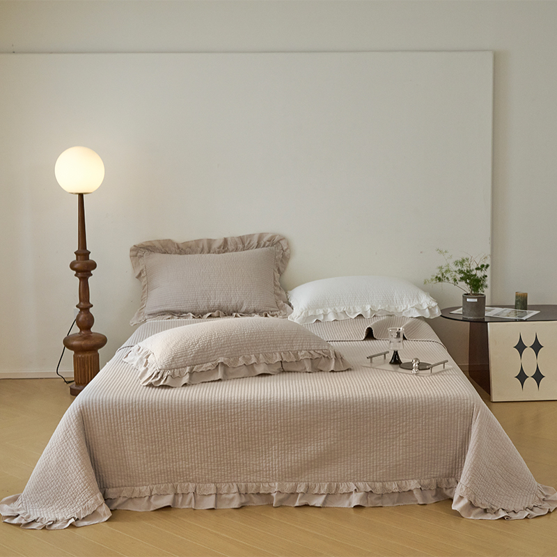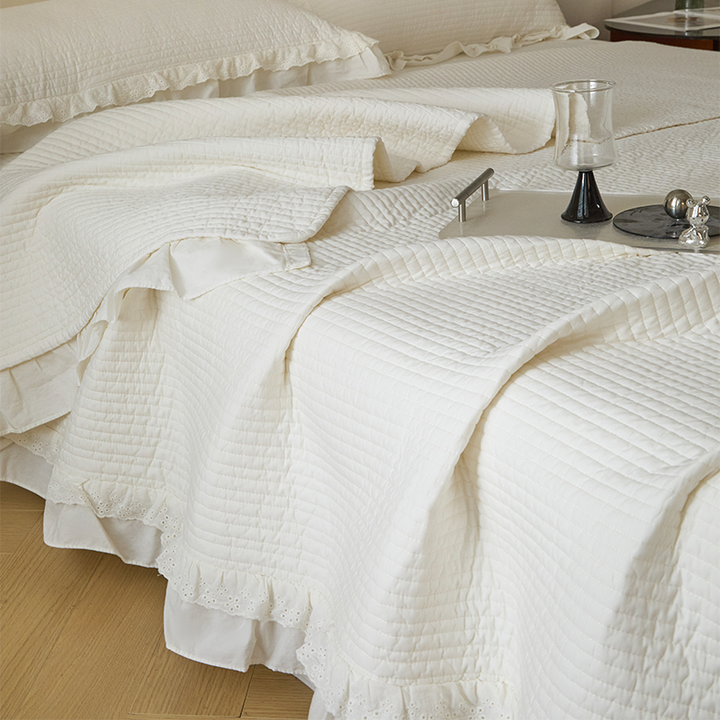 (总)期遇家居 2024新款出口韩国砂洗工艺床盖直条花边床盖纯棉三件套