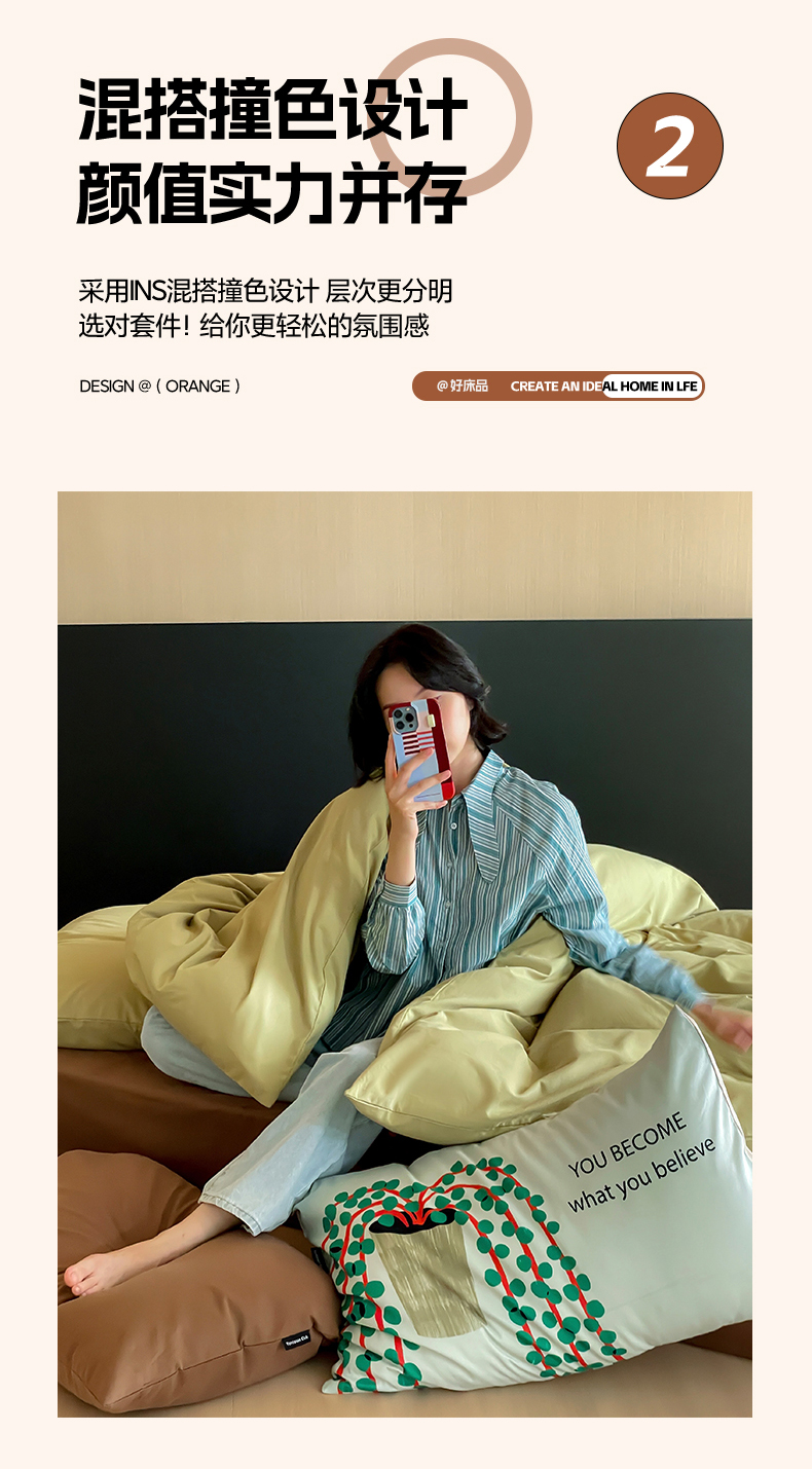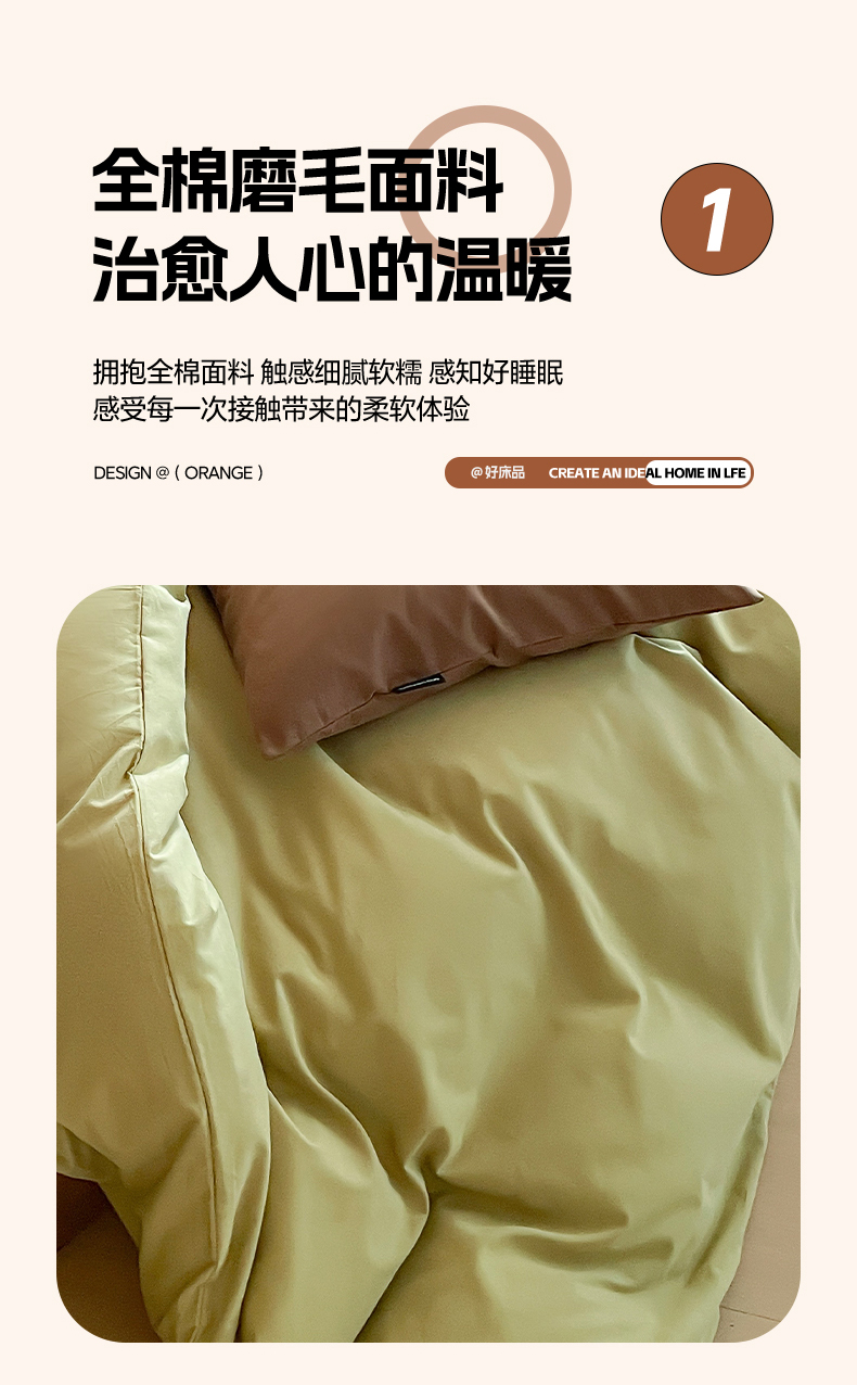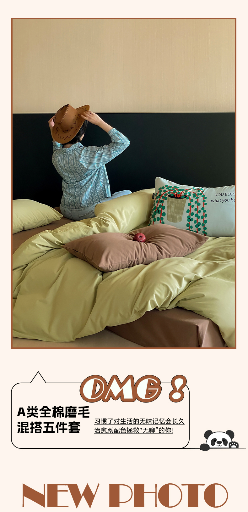 商品名称:圆岛家纺 2024秋冬新款纯色孟菲斯博主风时尚全棉磨毛五件套 尼罗绿拼深咖