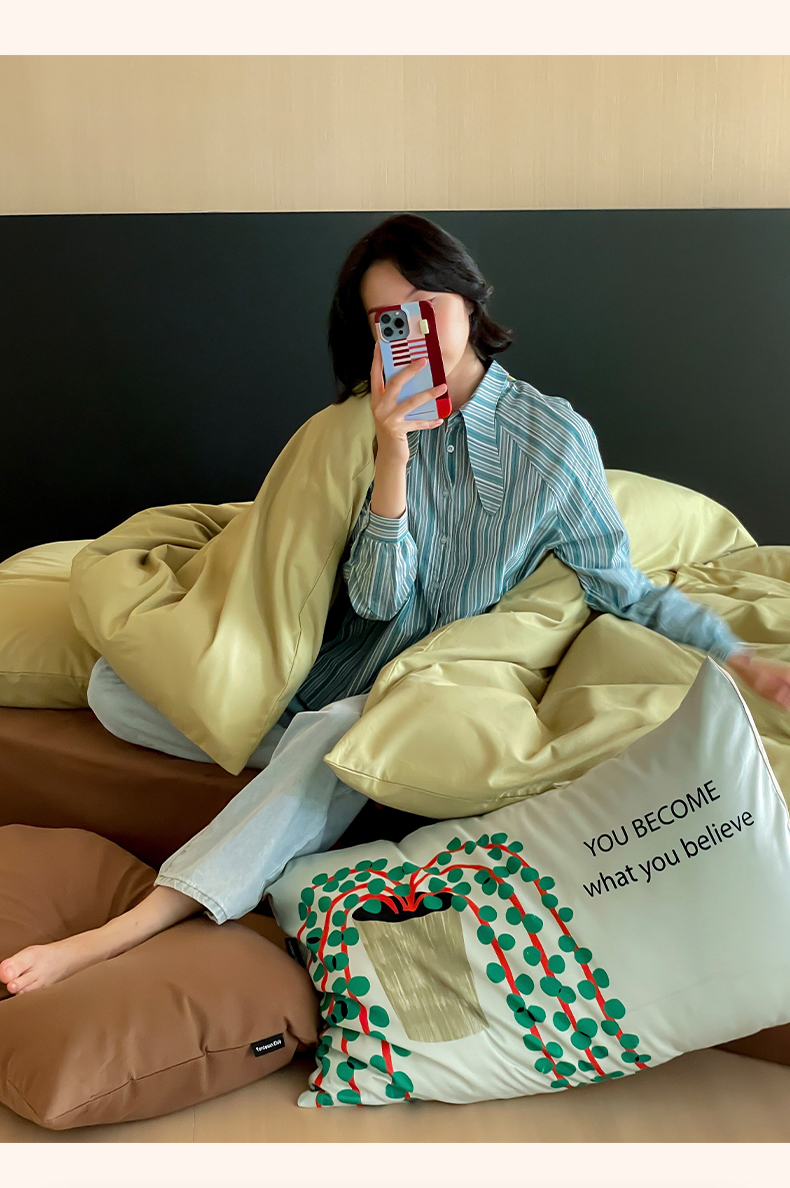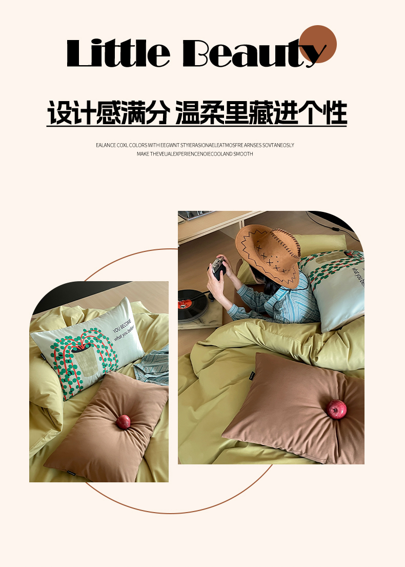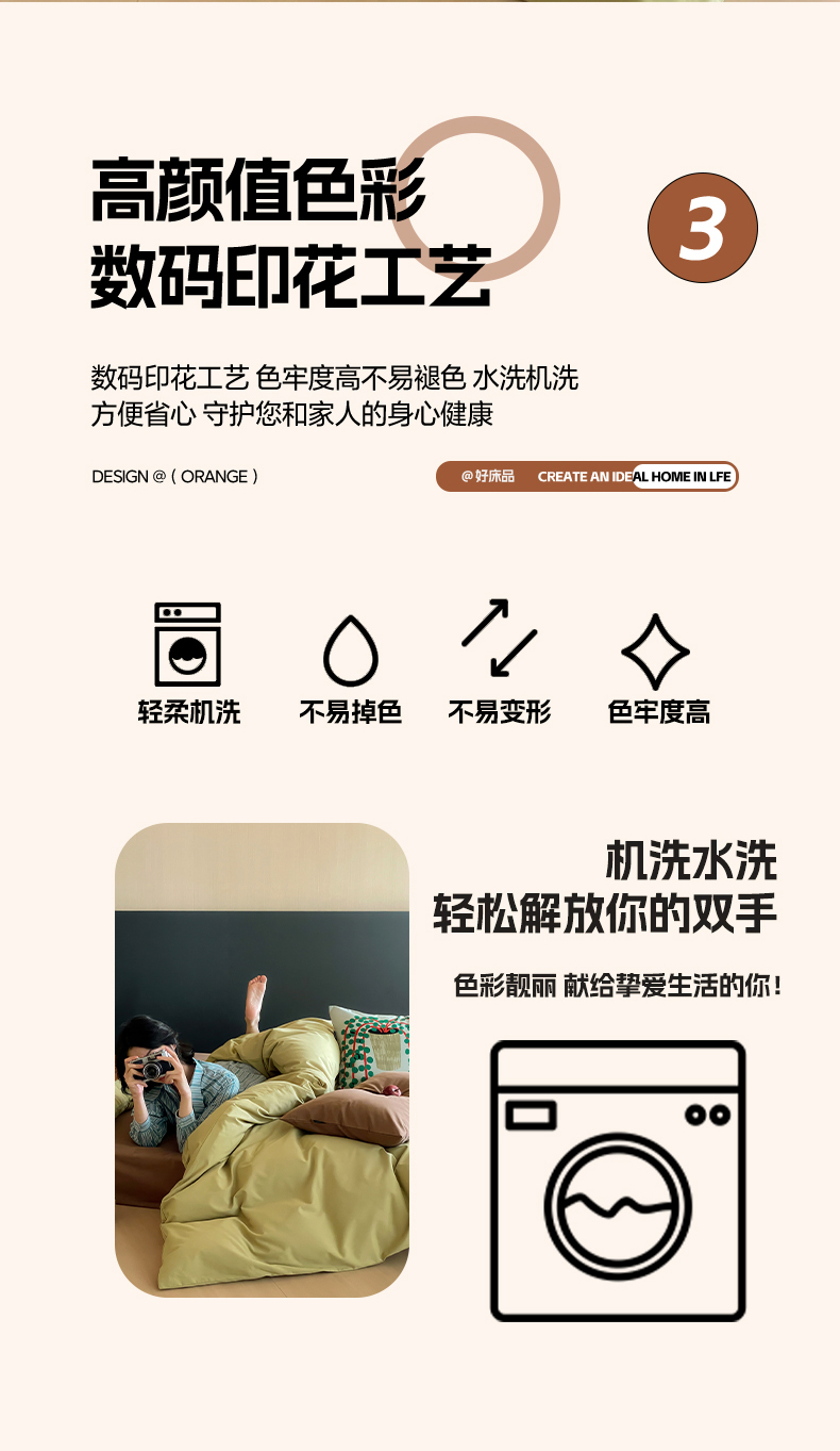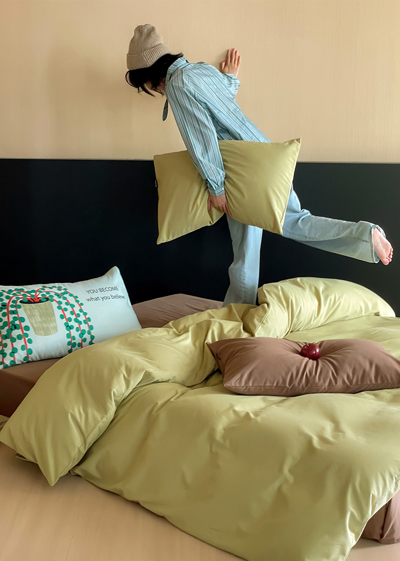 商品名称:圆岛家纺 2024秋冬新款纯色孟菲斯博主风时尚全棉磨毛五件套 尼罗绿拼深咖