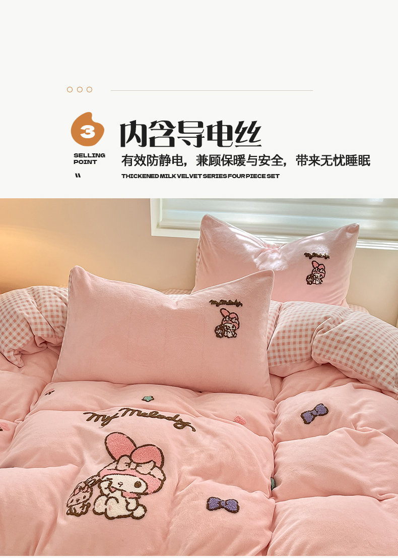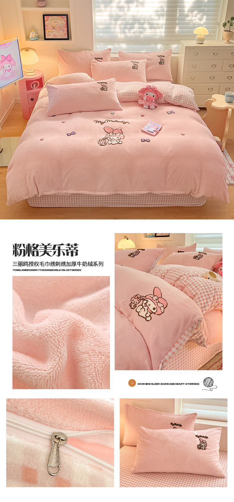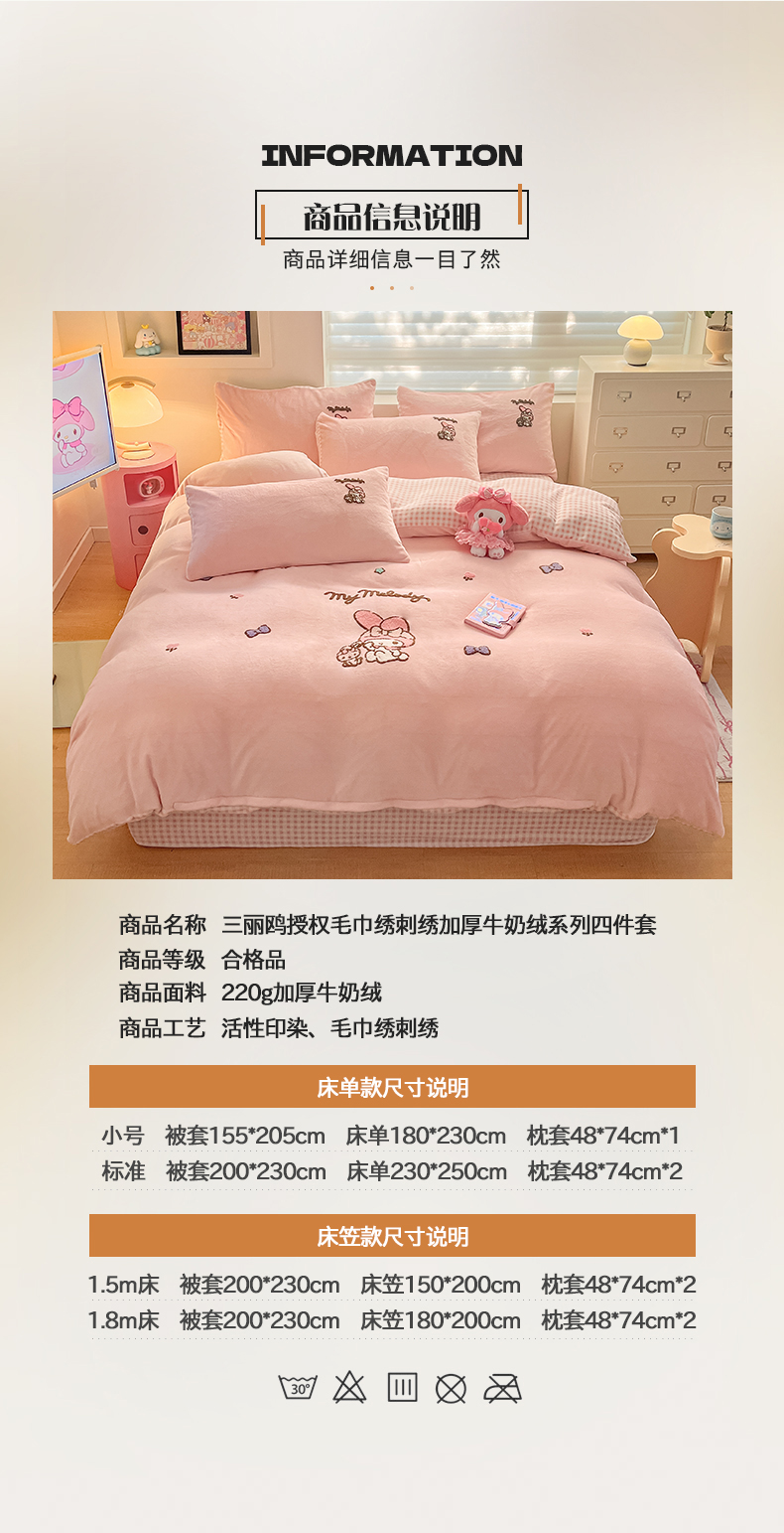 当前位置: 91家纺网 > 商品网购 > 床品套件 > 四件套 > 牛奶绒四件套 > 金爱家 2024新款正版三丽鸥授权毛巾绣刺绣工艺加厚牛奶绒系列四件套 绒毛巾绣-粉格美乐蒂