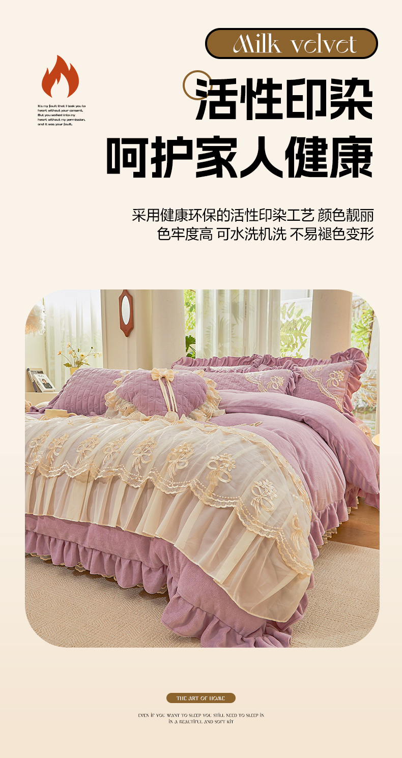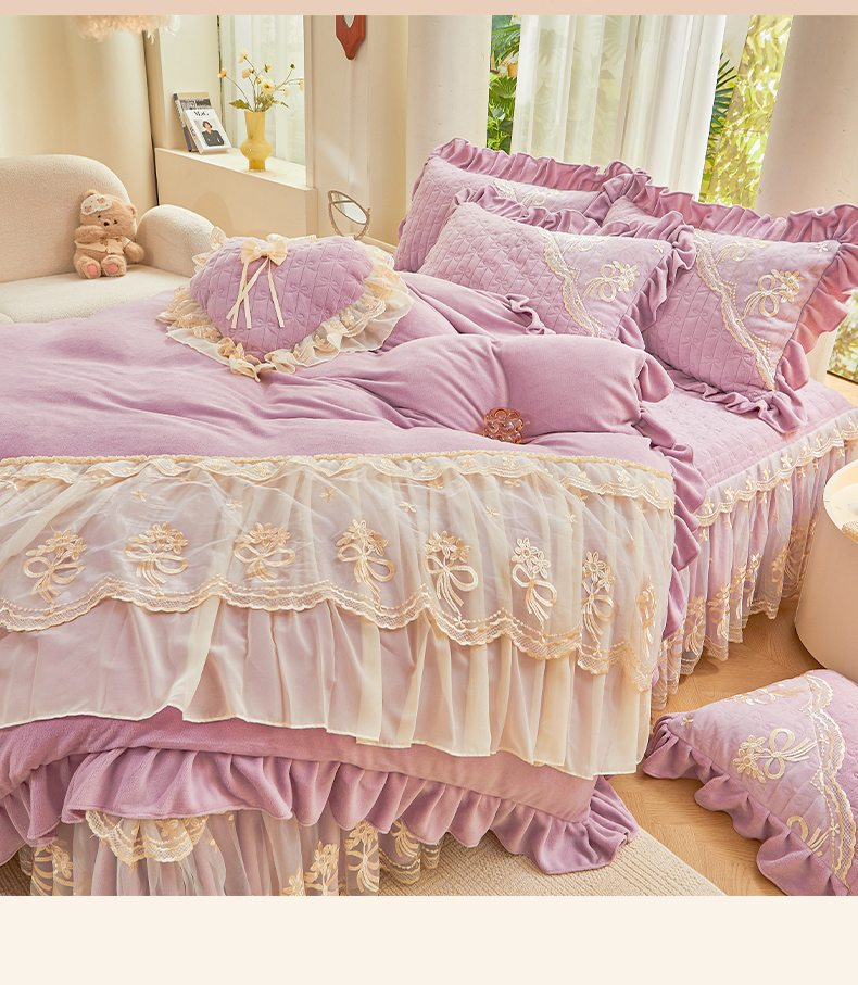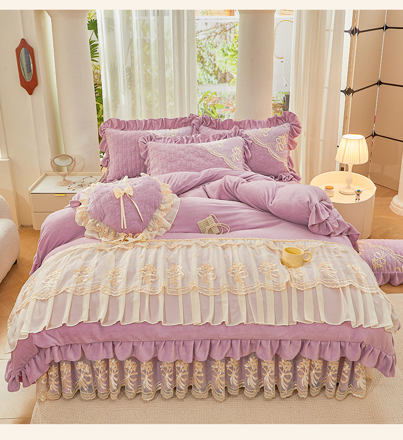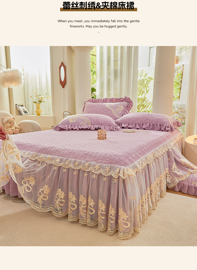 当前位置: 91家纺网 > 商品网购 > 床品套件 > 四件套 > 牛奶绒四件套 > 2024新款加厚牛奶绒蕾丝刺绣床裙四件套-莫奈花园系列 莫奈花园-甜紫