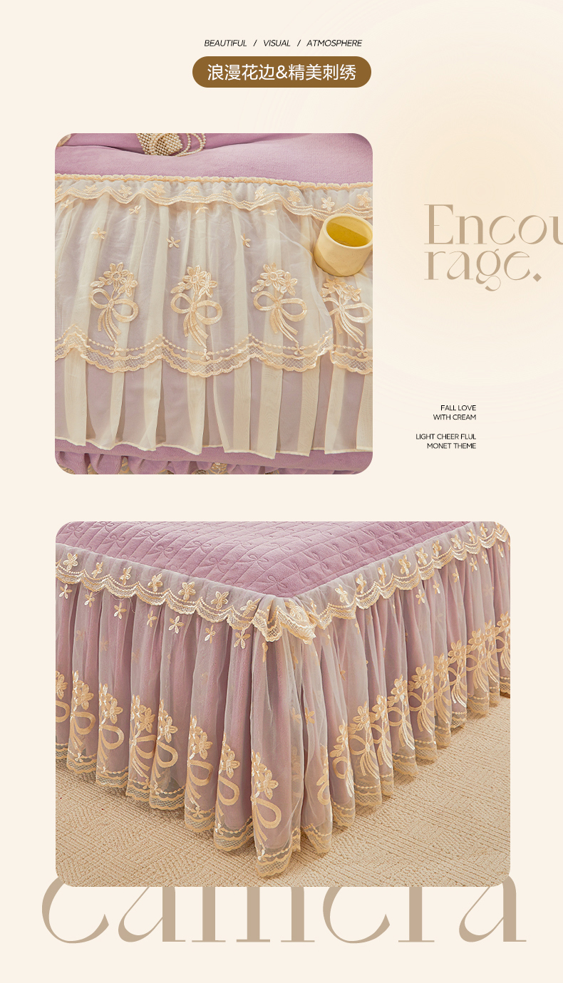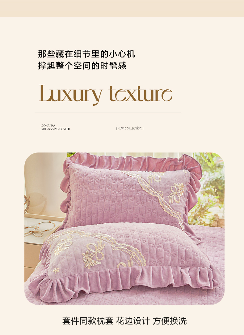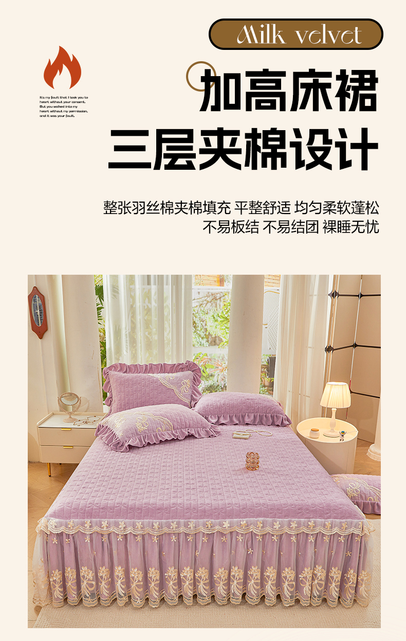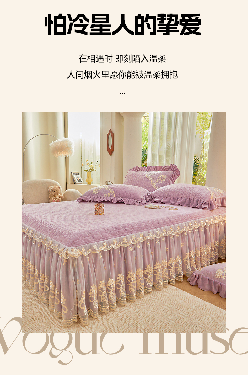 当前位置: 91家纺网 > 商品网购 > 床品套件 > 四件套 > 牛奶绒四件套 > 2024新款加厚牛奶绒蕾丝刺绣床裙四件套-莫奈花园系列 莫奈花园-甜紫