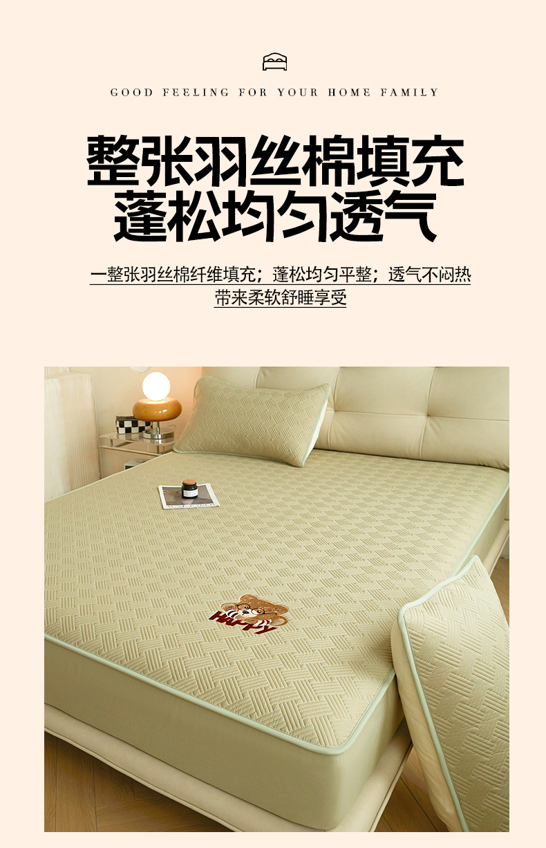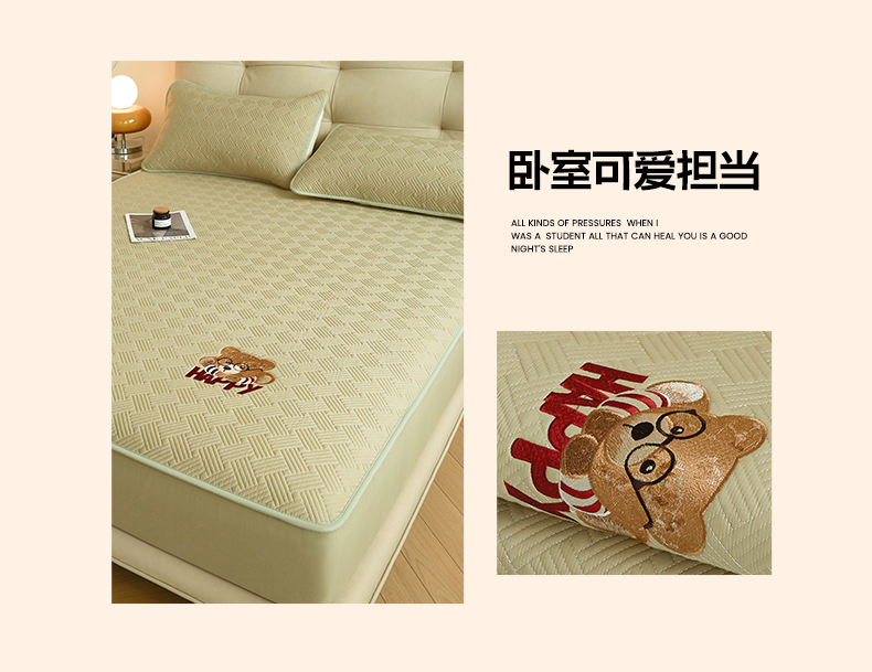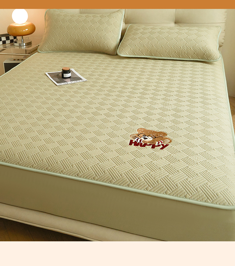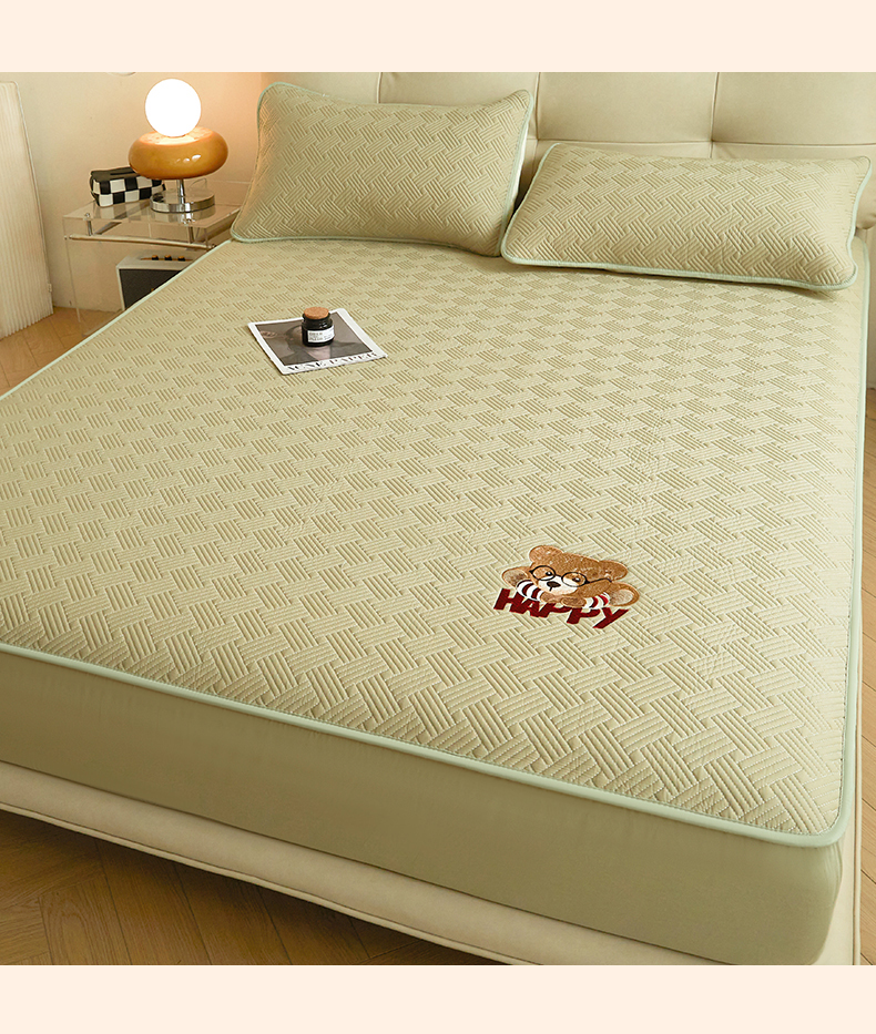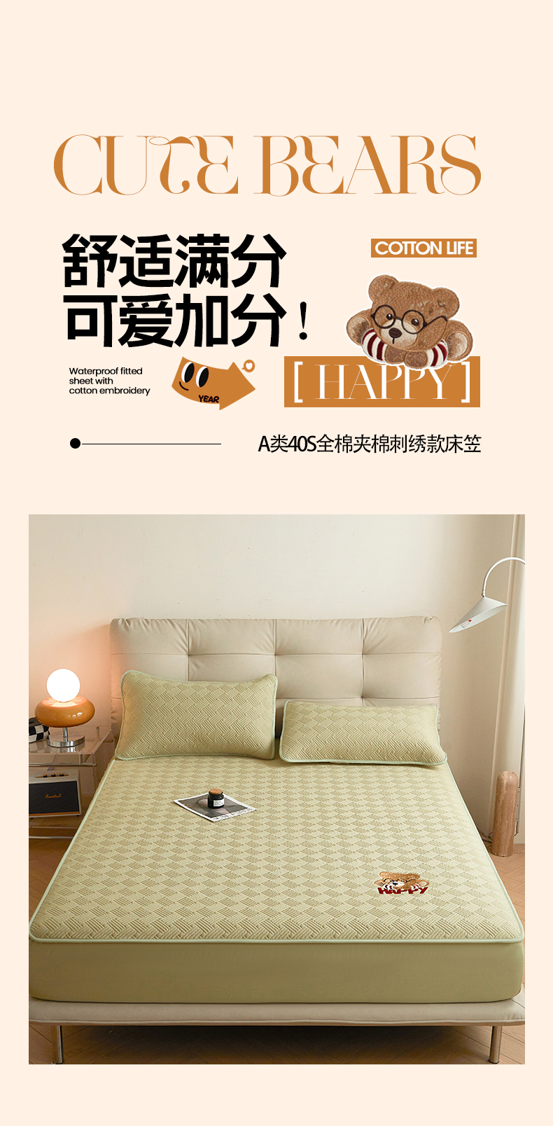 暖季家纺 2025新款40支长绒棉刺绣款全棉夹棉床笠支持定制 博士小熊-抹茶绿